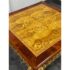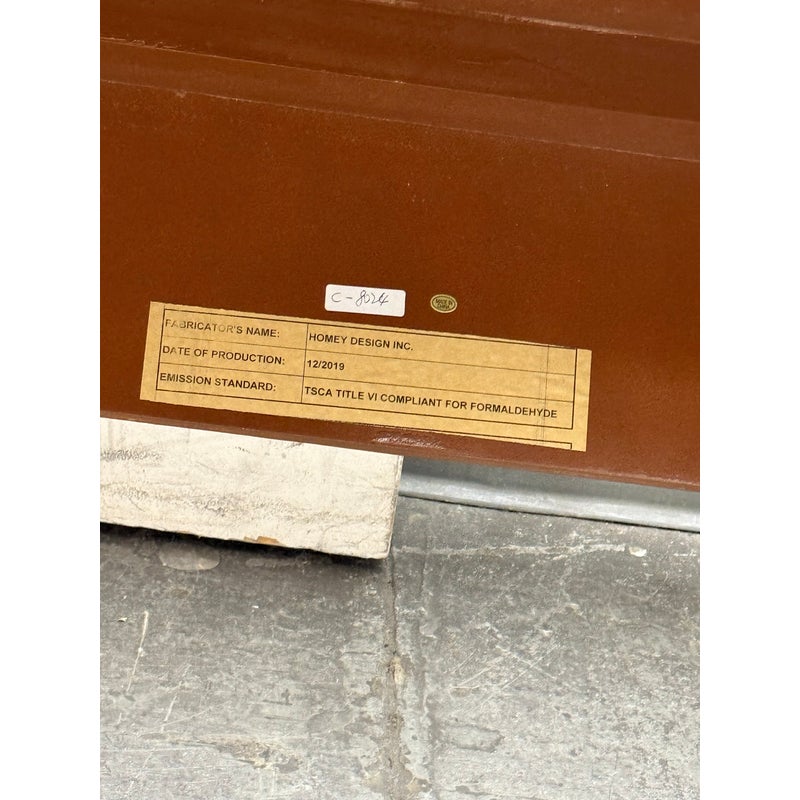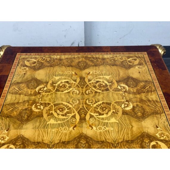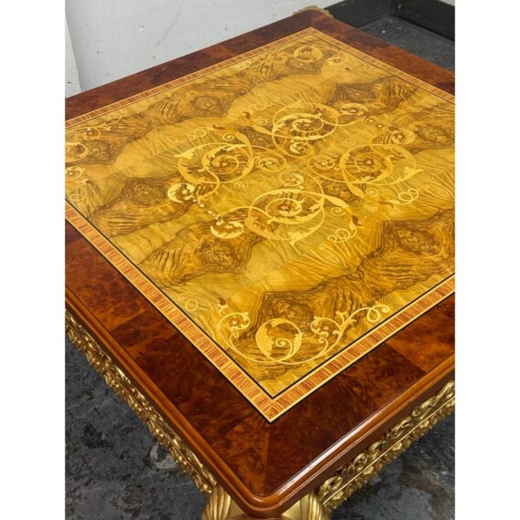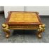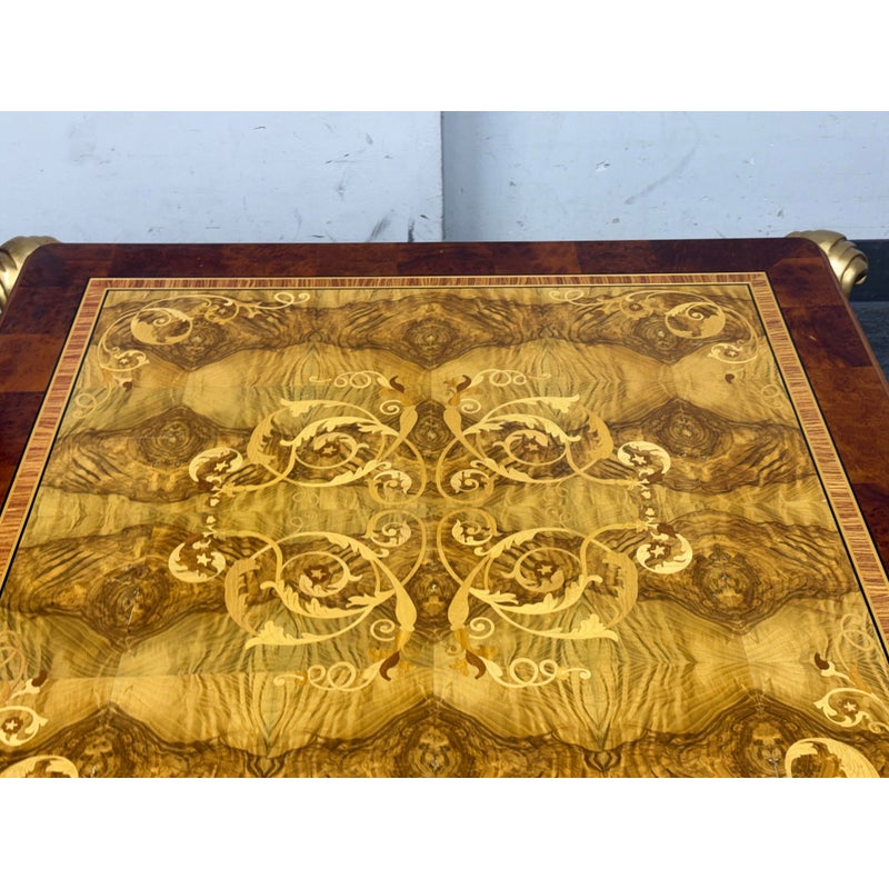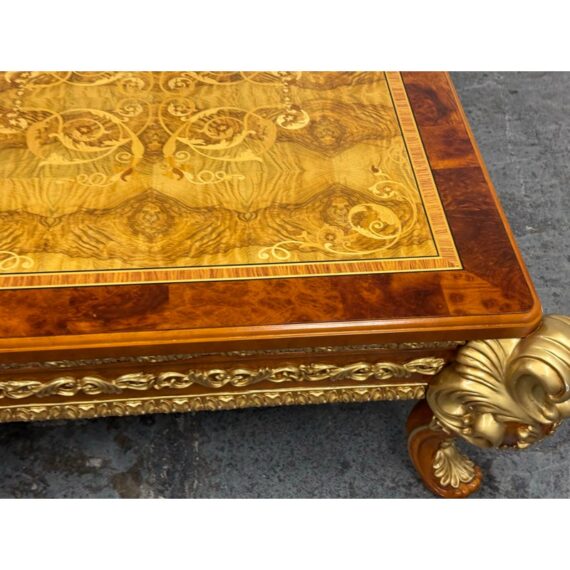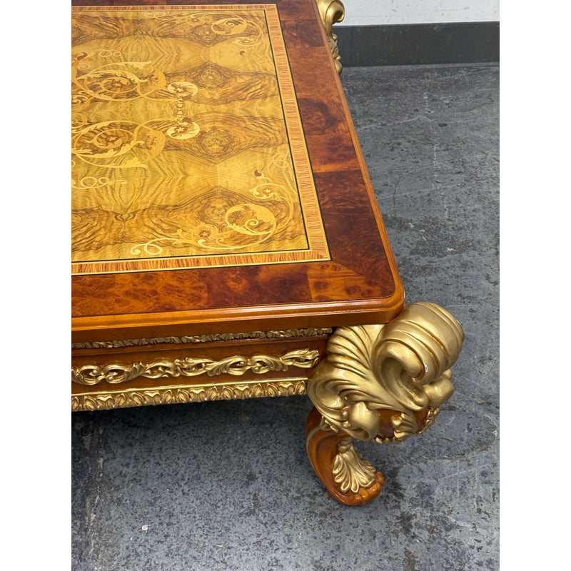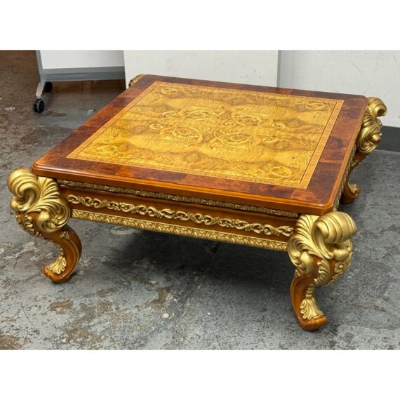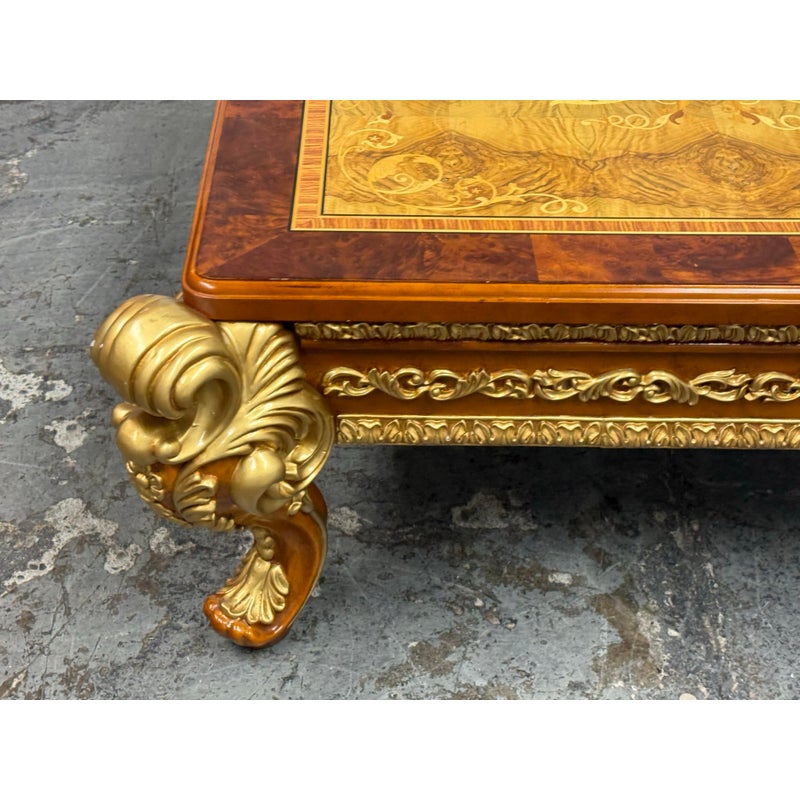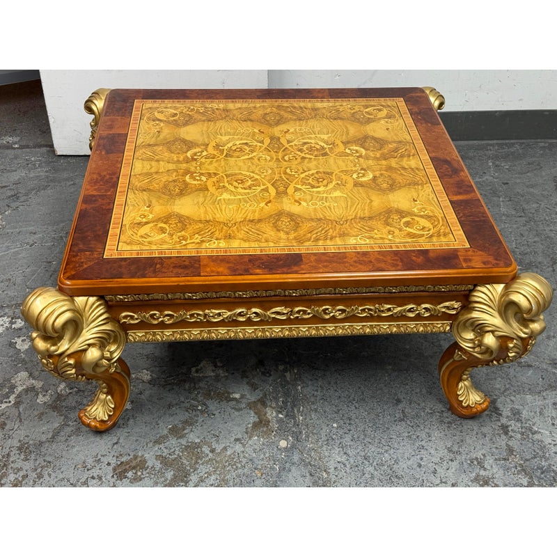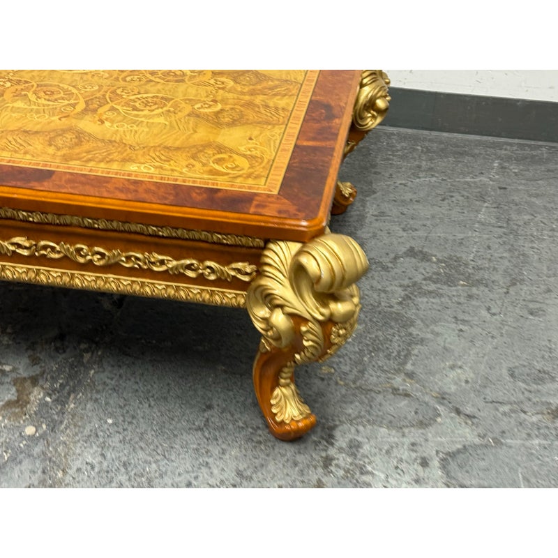 Design Plus Gallery presents a European Style Coffee Table from Homey Designs, Style HDC8024. The coffee table is out of this world and will add whimsy with remarkable visibility to any room it is put in. The table has four golden legs that are shaped like rounded, dimensional acanthus leaves. The table finish is two tone with a cherry color accented by metallic gold along the sides and an inner square of a light burl wood. Overall the coffee table is in good condition with wear that is consistent with its usage.