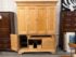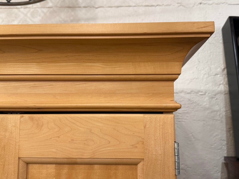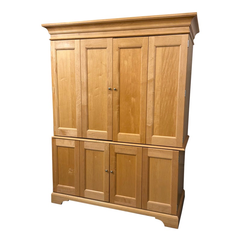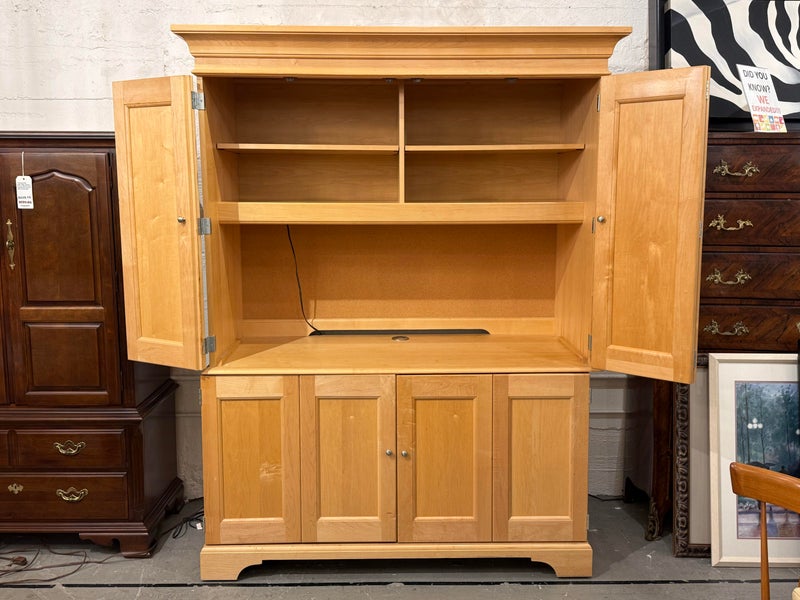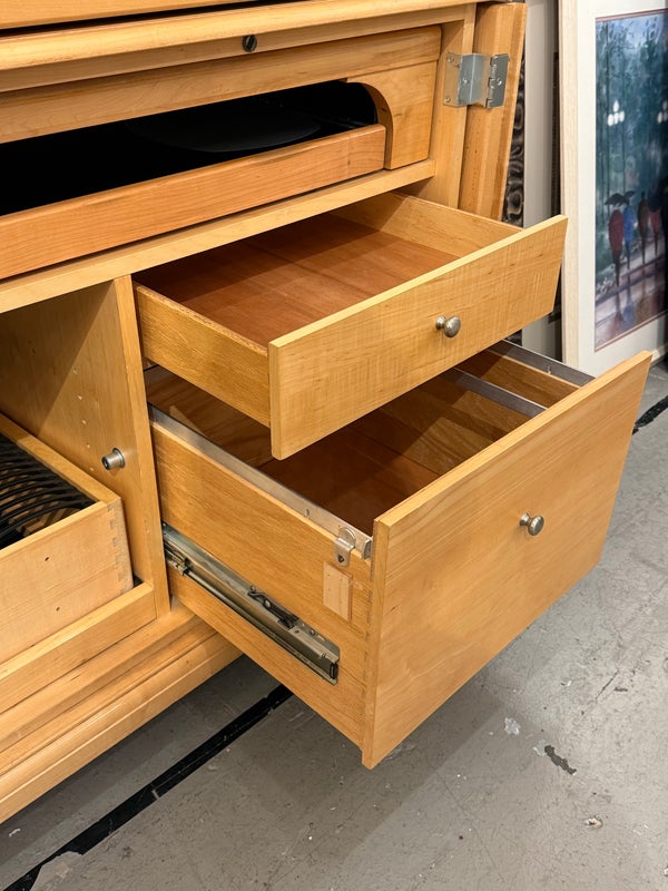 Design Plus Gallery presents a Two Piece Maple Finish Workstation from the Late 20th Century from Hooker Furniture. The upper and lower cabinet break apart for ease of transport. The lower section has a converter box with outlets to independently wire your electronics into, and below that box are two modular shelves behind the left cabinet door. The remaining two thirds on the lower portion have a dual slide out surface for keyboards and writing/mouse use. There is a lower slide out to organize discs and two lower drawers of staggering depths. Upper portion of the unite has an open cavity that takes up half the area with four equal sized drawers above. Is in good condition with minimal surface wear for its usage.