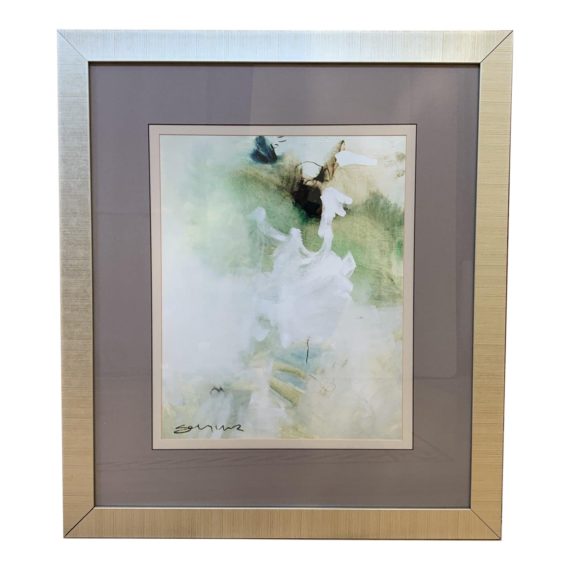 Design Plus Gallery presents a Horchow Framed Sayiler Painting Print. Silver frame with mauve + light pink matte complement the abstract mixed media colorscape print. Print shows the artist’s signature in the lower left corner. Coordinating framed print might be available.