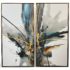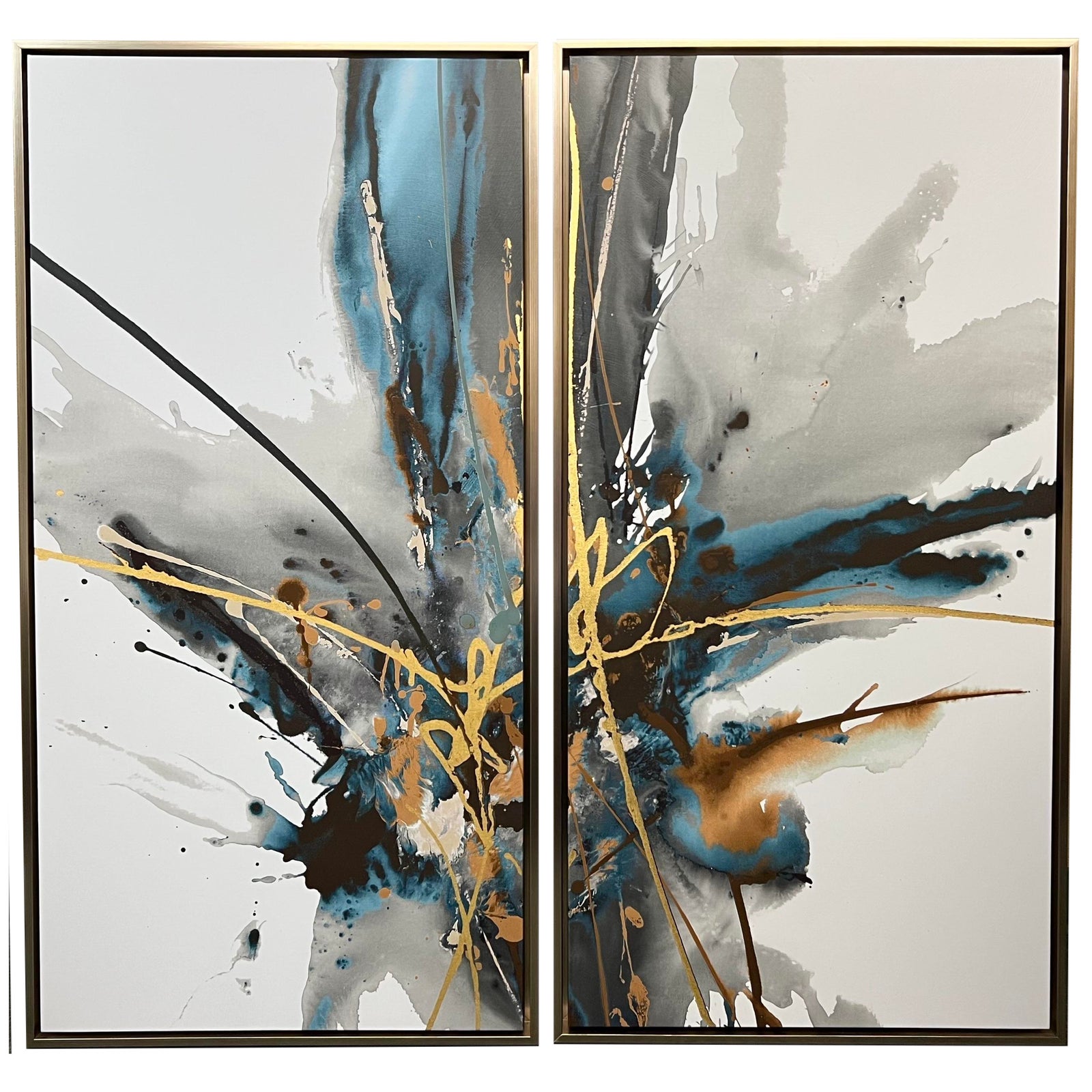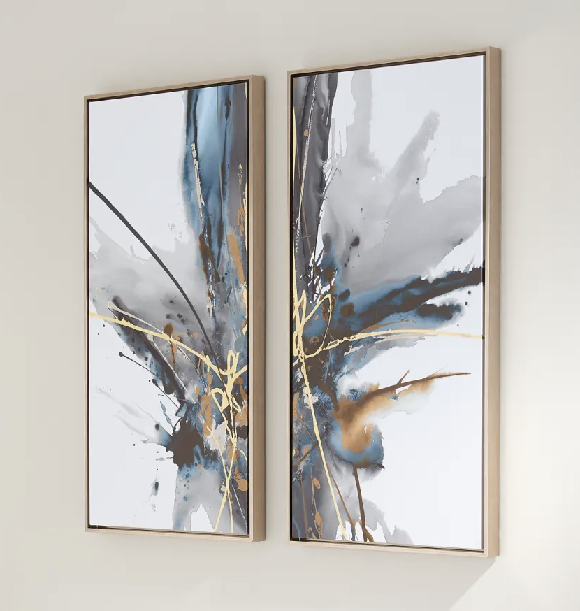 Design Plus Gallery presents the Horchow “Gray Adventure” Giclee Diptych. These handcrafted giclees are folded over the frames’ edges, completely covering the stretcher bars. They are in float frames with a dark silver finish. The giclee is finished with textured gel and gilt gold embellishments. Each has Dual D-rings for hanging. Minor wear from use; diptych is in good condition.