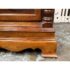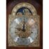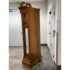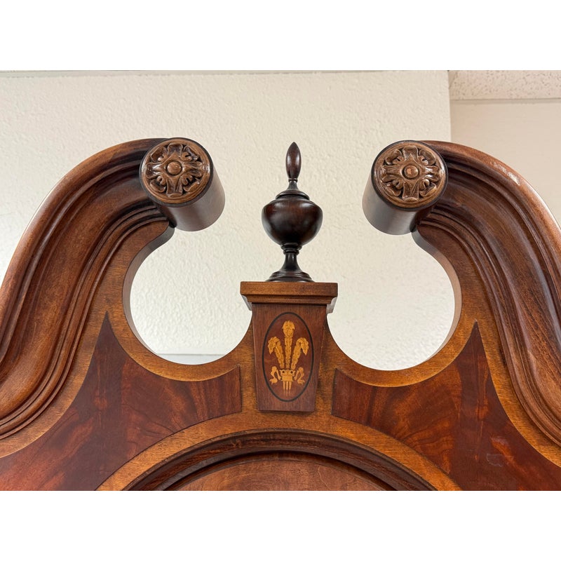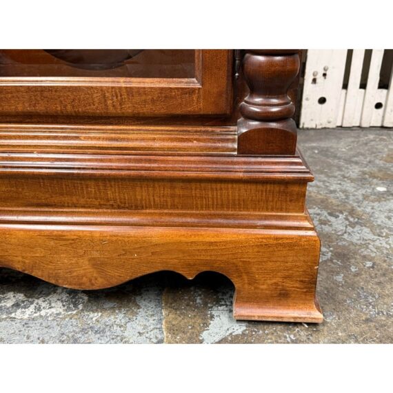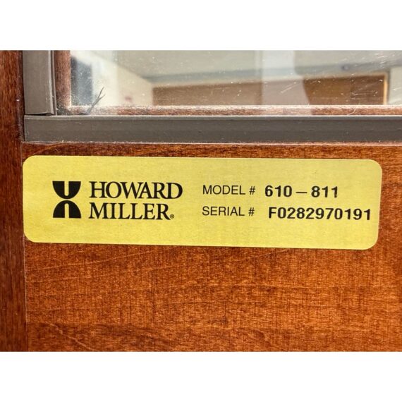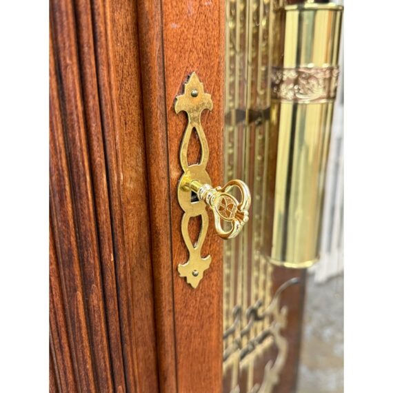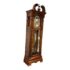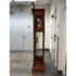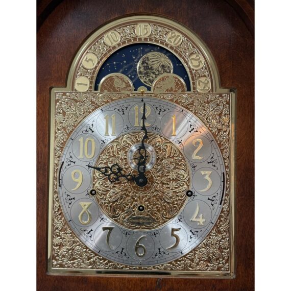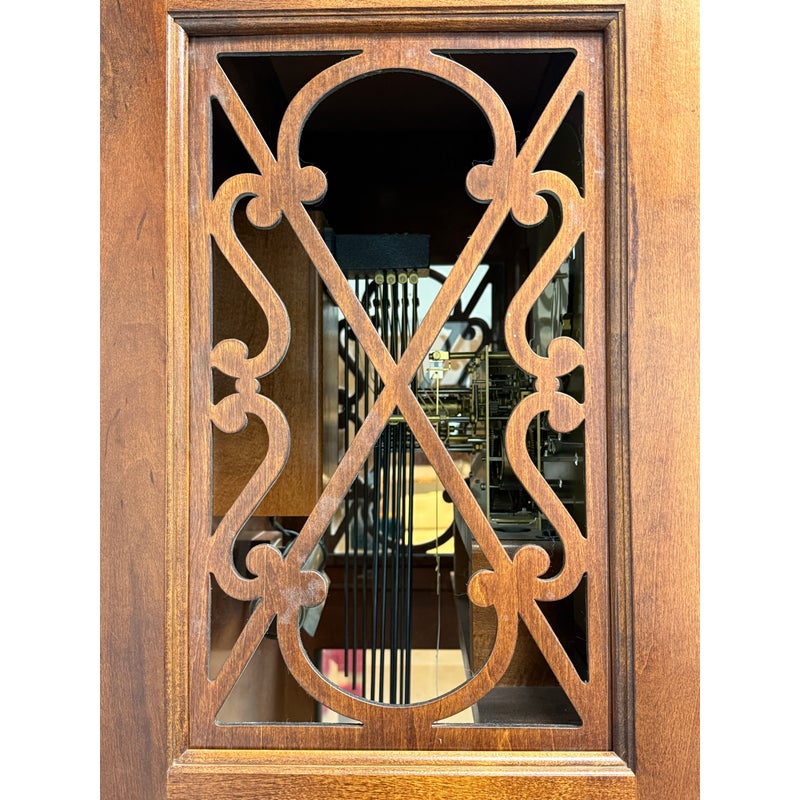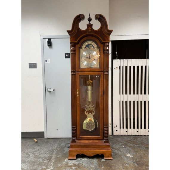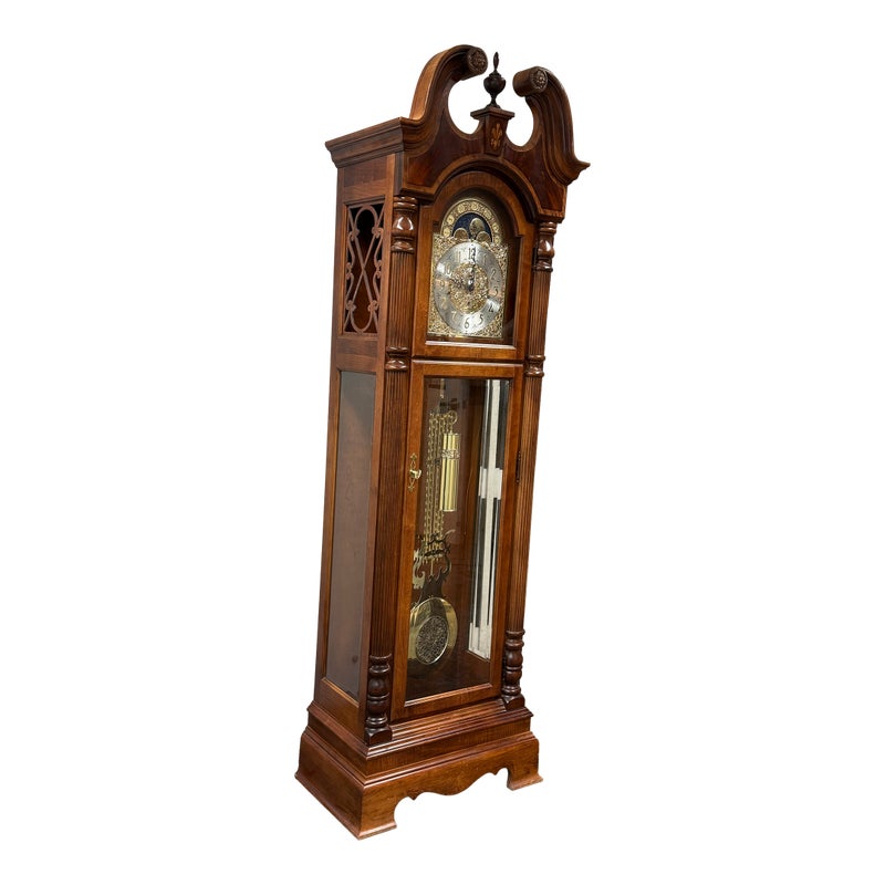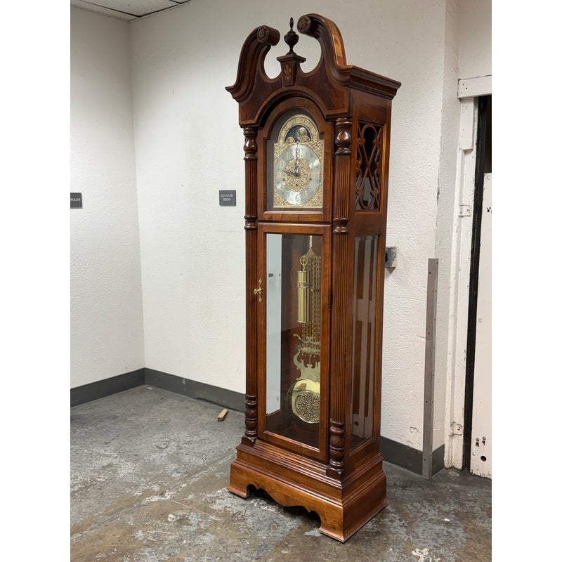 Design Plus Gallery presents a “Raymour” Grandfather Clock Model #610-811 from the Broadmour Collection by Howard Miller. This tall case clock displays a traditional silhouette with a bonnet top, scroll crest, turned columns, and side fretwork panels. The dial is detailed with an engraved center, silvered chapter ring, moonphase arch, and ornate hands, while the glass door reveals the pendulum and weights within. The case shows a mahogany tone with visible grain and molded accents throughout, giving the piece a stately and decorative presence. It is in fair condition, currently not functional and wires will need to be placed properly for weights. A glass panel is missing on the side, visible and minimal wear from usage. Made in the USA.
