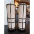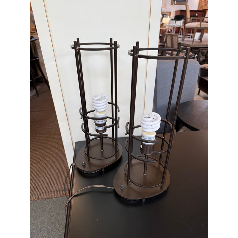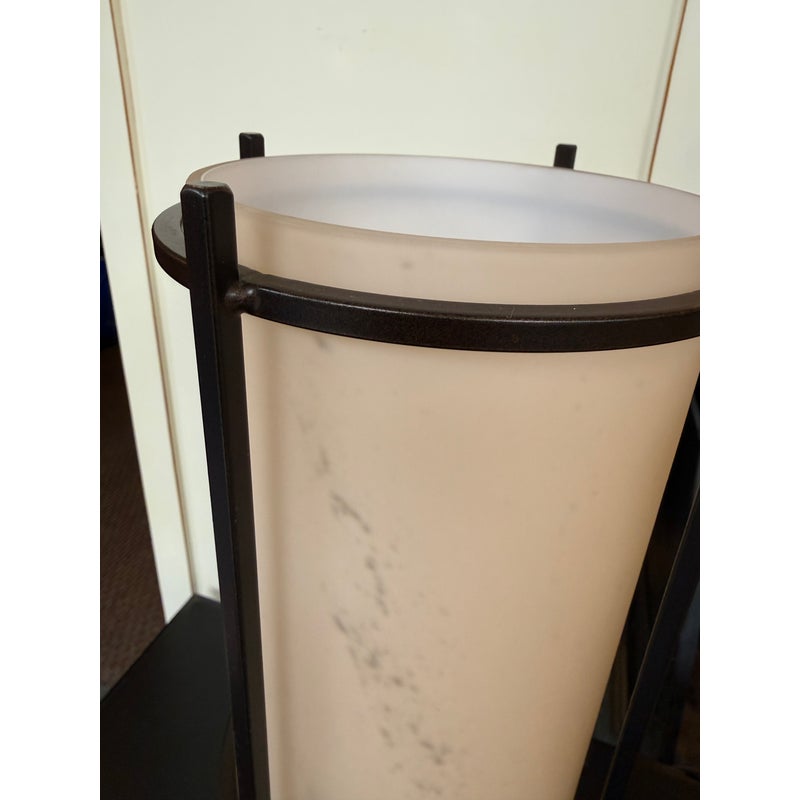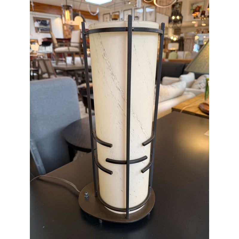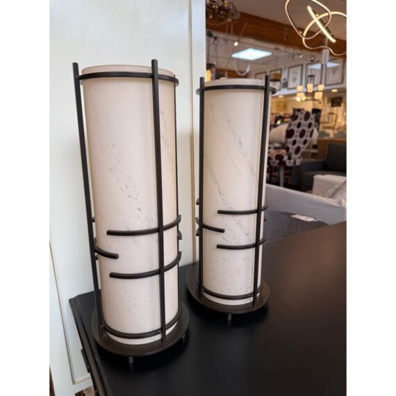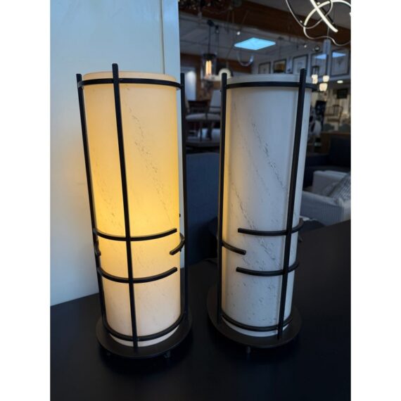 Design Plus Gallery presents a Pair of Mission Glass Wrought Iron Table Lamps from Hubbardton Forge Lighting. These lamps are from the brands Paralinne collection and come with center piece of stone glass inset into black wrought iron frames. They have a linear shape and profile that looks fantastic in craftsman homes, mid century homes. The brand is synonymous with elevated craftsmanship with unparalleled timelessness. This style of lamp is no longer in production with the brand and are both in good condition with minimal wear for their usage. Made in the USA.