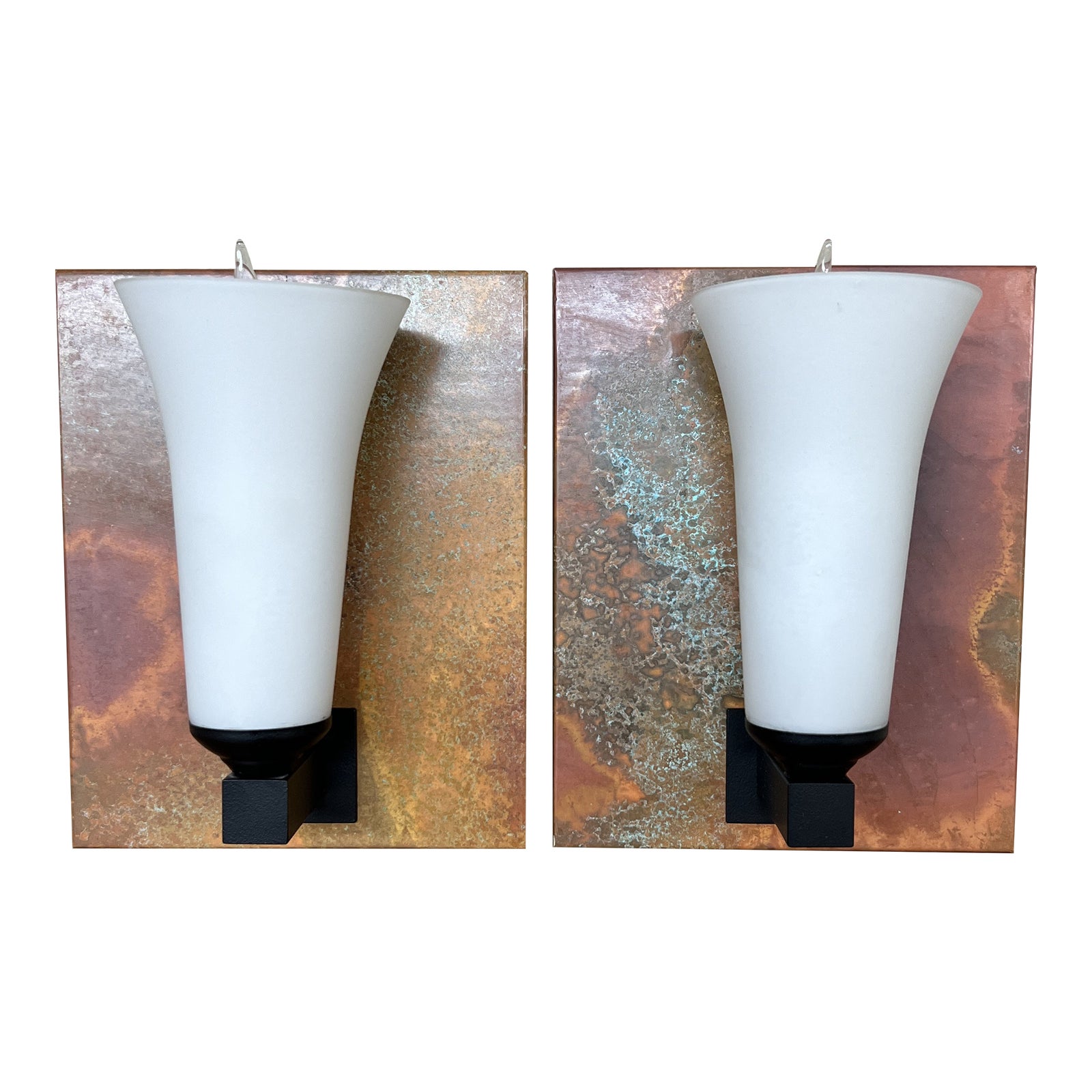Design Plus Gallery presents a Pair of Hubbardton Forge Sierra Patina Copper Sconces. Indoor Wall Sconces features unique copper wall plates. The glass shades are hand blown and have graphic black powder coated finish on the support stem. Direct wire wall installation is required. There is minor wear through out, pair is in good condition.