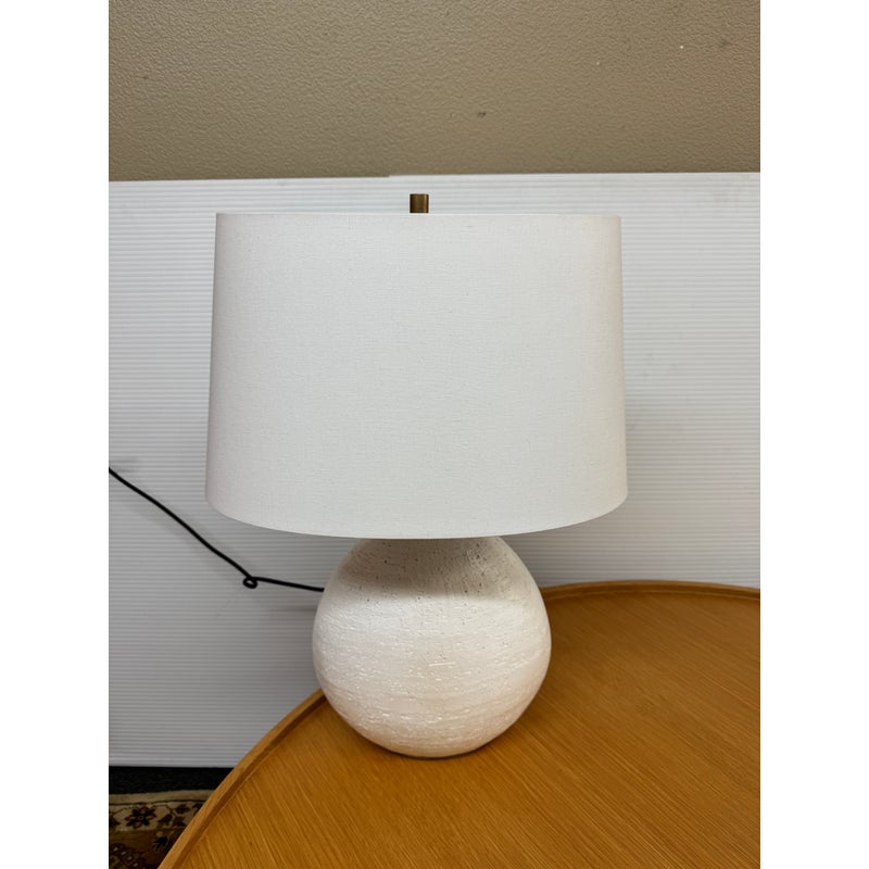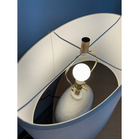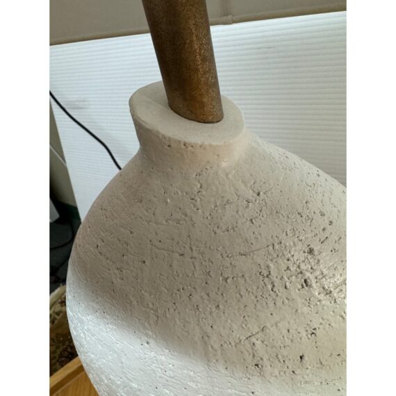 Design Plus Gallery presents the Denali Table Lamp from Hudson Valley Lighting. The textured white base has added brass-tone hardware with a white drum shade for a composed, sculptural profile. Its rounded form and layered surface give the piece depth, while the metal details add contrast and definition. This lamp is in good condition with visible and minimal wear from usage.