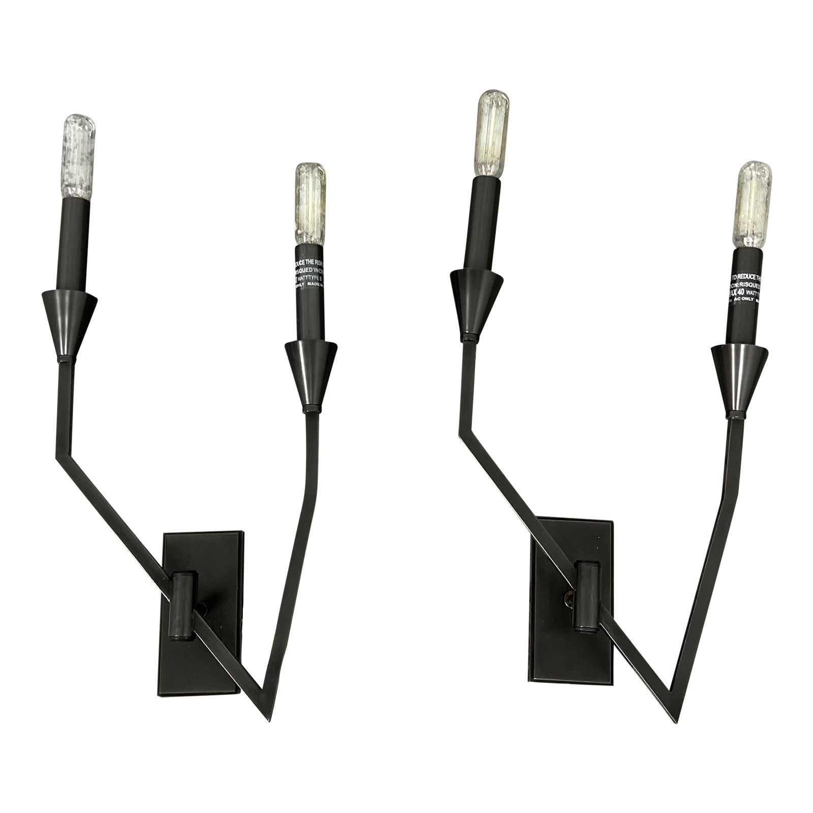 Design Plus Gallery presents a Pair of Two Light Wall Sconces, by Hudson Valley from the Archie collection. Inspired by an avant garde Modernist candelabra. The asymmetrical frames feature square rod metal that hold bobeches and candle-like sockets on both ends. The whole sconces are finished in black. Minor wear from use; sconces are. in good condition.