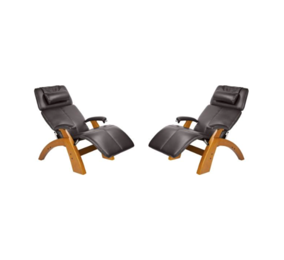 Design Plus Gallery Presents a set of two luxurious Relax the Back Leather Recliners by Human Touch. When reclined, the zero gravity position of these unique loungers cradles your back and elevates your legs above your heart, which is the position that doctors recommend as the healthiest way to sit. Plush leather cushions, an adjustable height neck pillow, and an easy recline lever under the left armrest, will make these pair of dual recliners your favorite 3rd party for Netflix and Chill. Bright orange hued wood frame elegantly supports the entire body, combining comfort, elegance and ergonomic support. Arm Height 25 inches, seat height 18 inches.