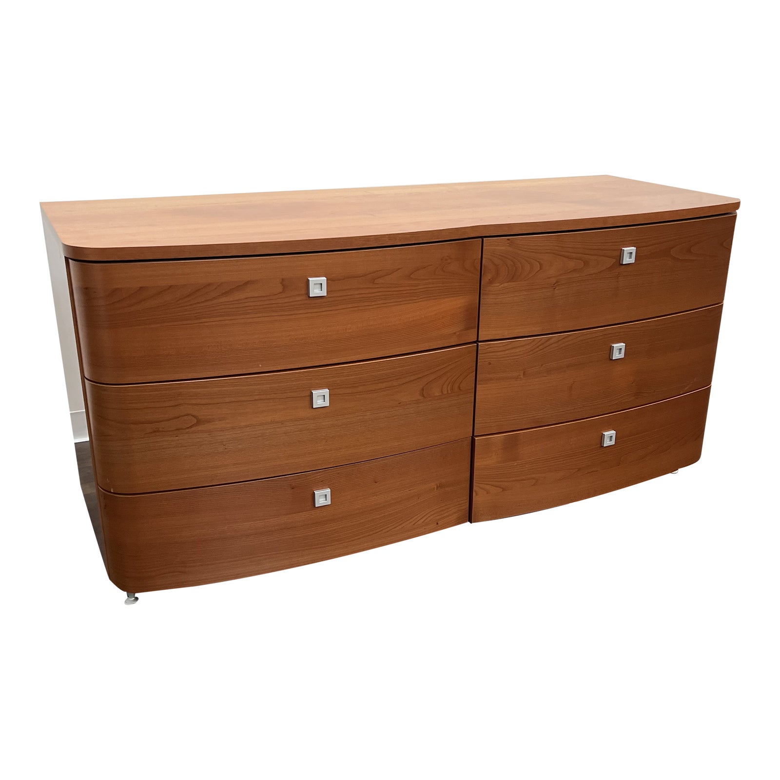 Design Plus Gallery presents a Six Drawer Cherry Finish Dresser from IDS Furniture. The dresser has shaped concave drawers with stainless steel knob pulls and feet to elevate off the floor. Beautiful, rich cherrywood veneers makes this dresser stand out among the rest. It’s an updated and modern staple piece made in America with luxury materials. Some darkened spots and fading from sun exposure + heavy usage. This was a a showroom sample condition.