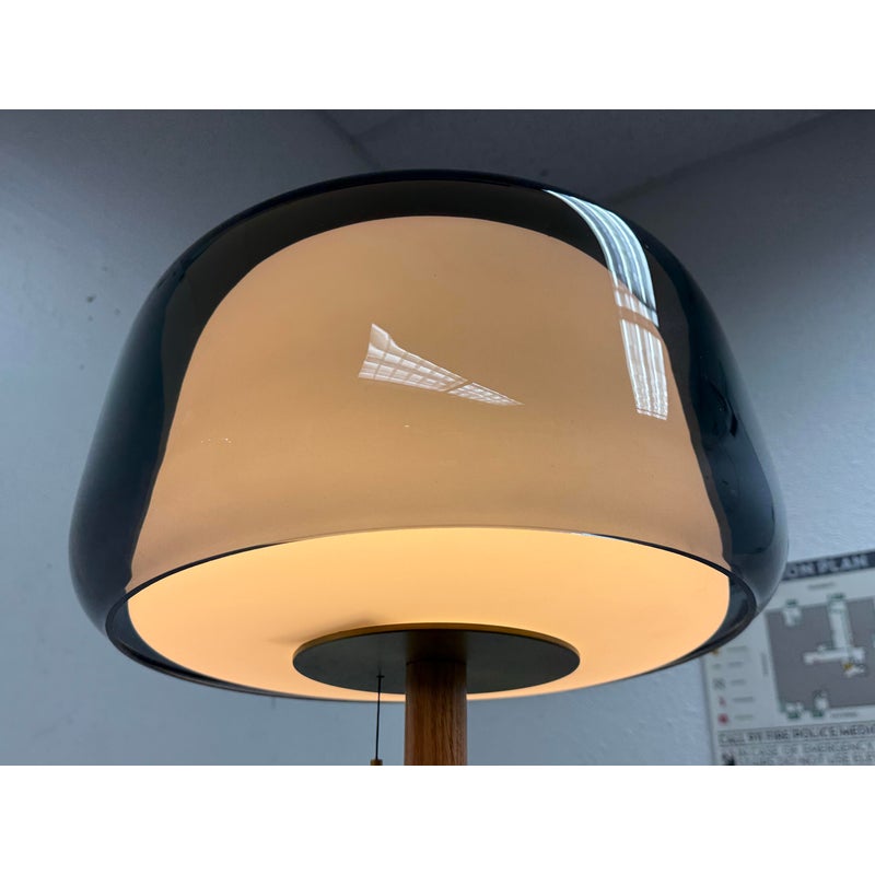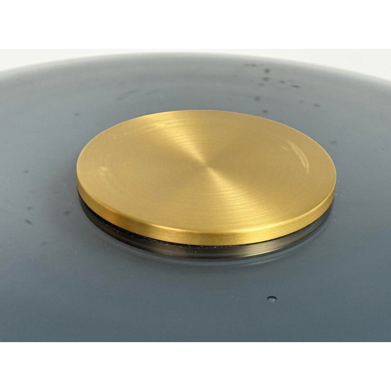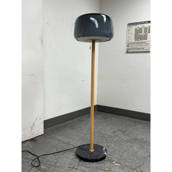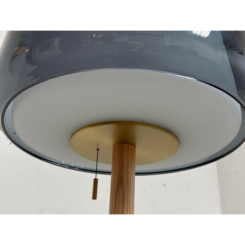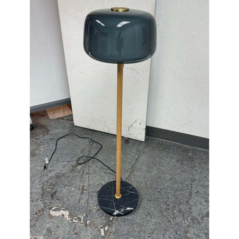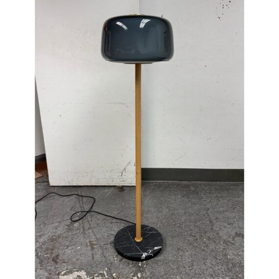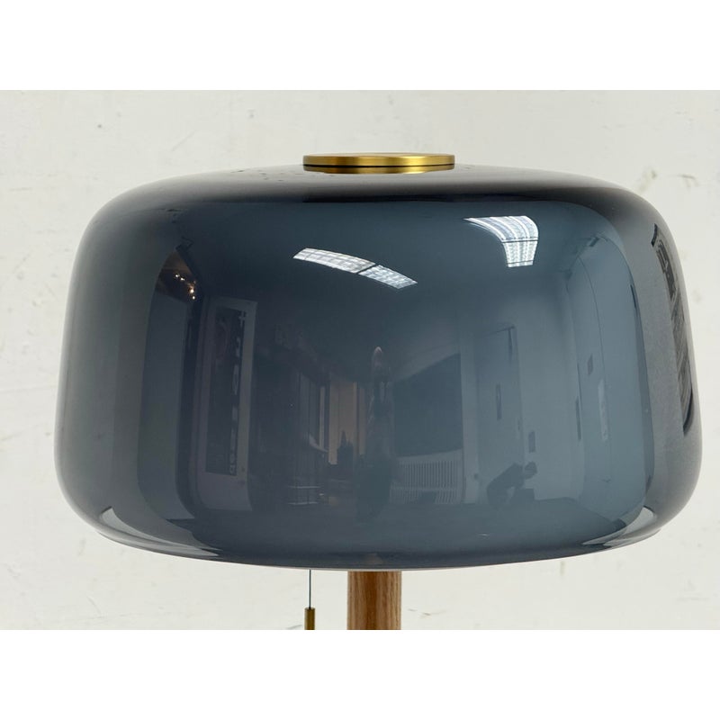 Design Plus Gallery presents a Evedal Floor Lamp from IKEA. Genuine materials like glass and brass, together with timeless Scandinavian design. This lamp has an opaque inner shade and a colored gray glass outer shade, so it provides both ambient lighting and direct light. This lampshade is mouth blown glass by a skilled craftsperson and therefore unique. In good condition, visible and minimal wear from usage.
