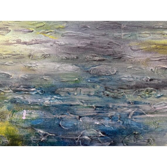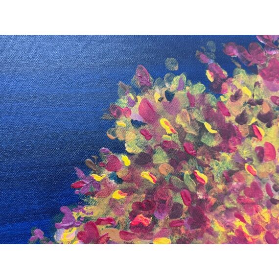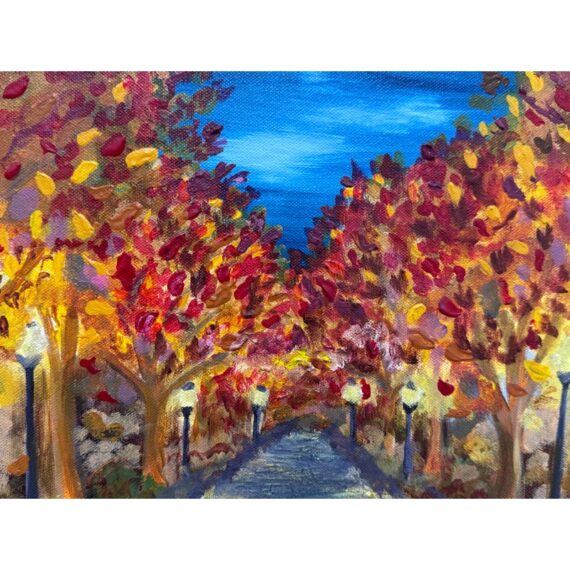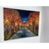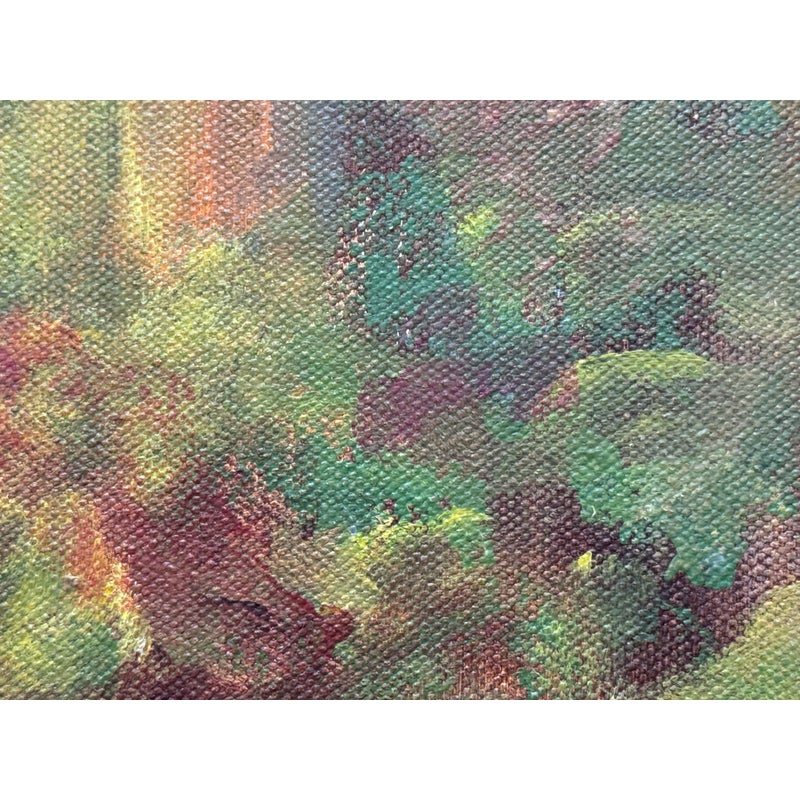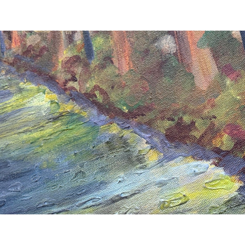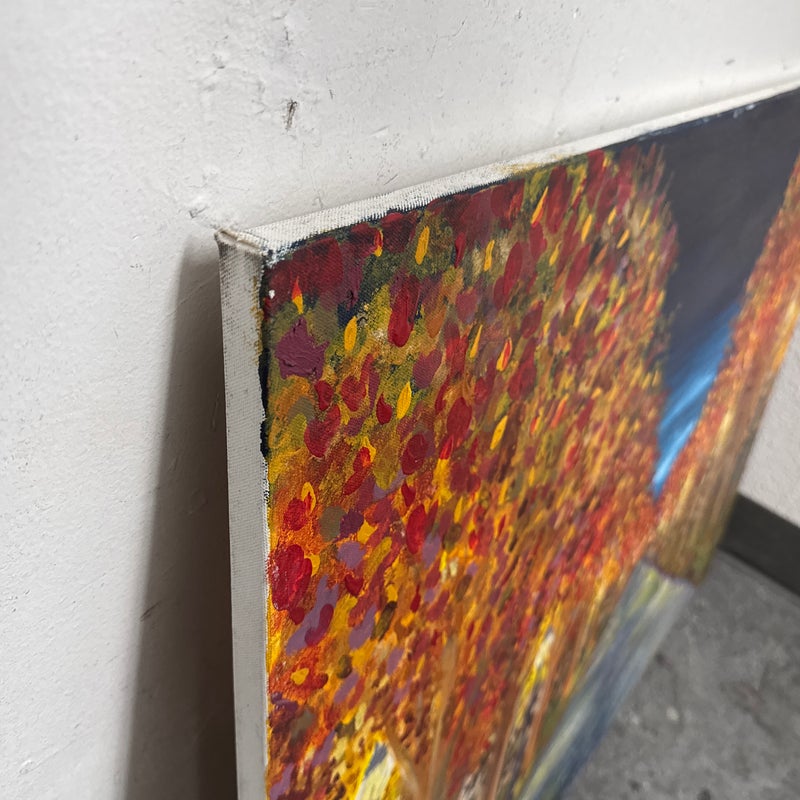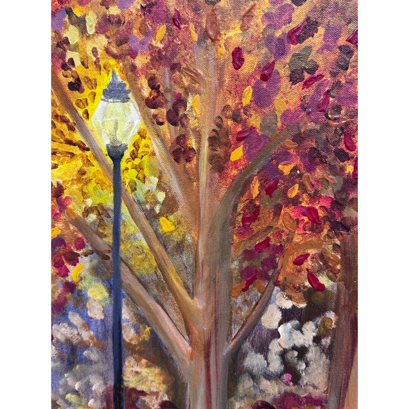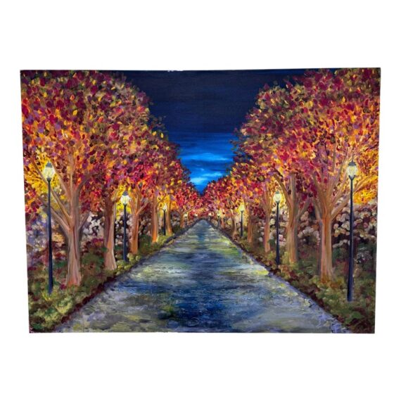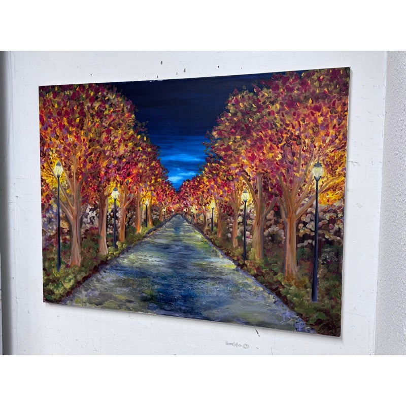 Design Plus Gallery presents an Original Painting from an Unknown Artist. The work is compelling, leaving you the impression of both familiarity and a sense of being there, within the canvas. The impressive art work has a center path that is lined with both trees and tall lit lanterns that overall illuminate the canvas. In background a brilliant sapphire blue night sky is peeking through the vibrant autumnal leaves on the still full trees. The composition is in good condition with wear that is consistent with usage.