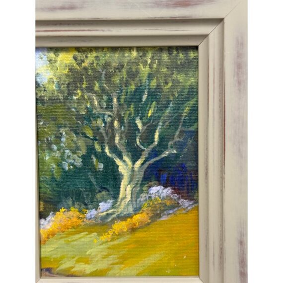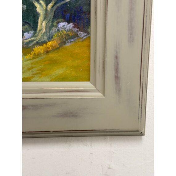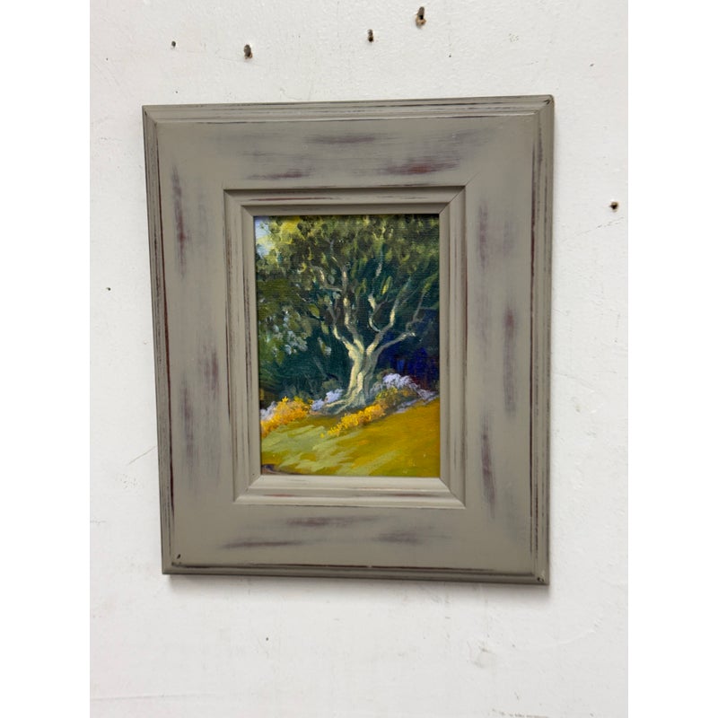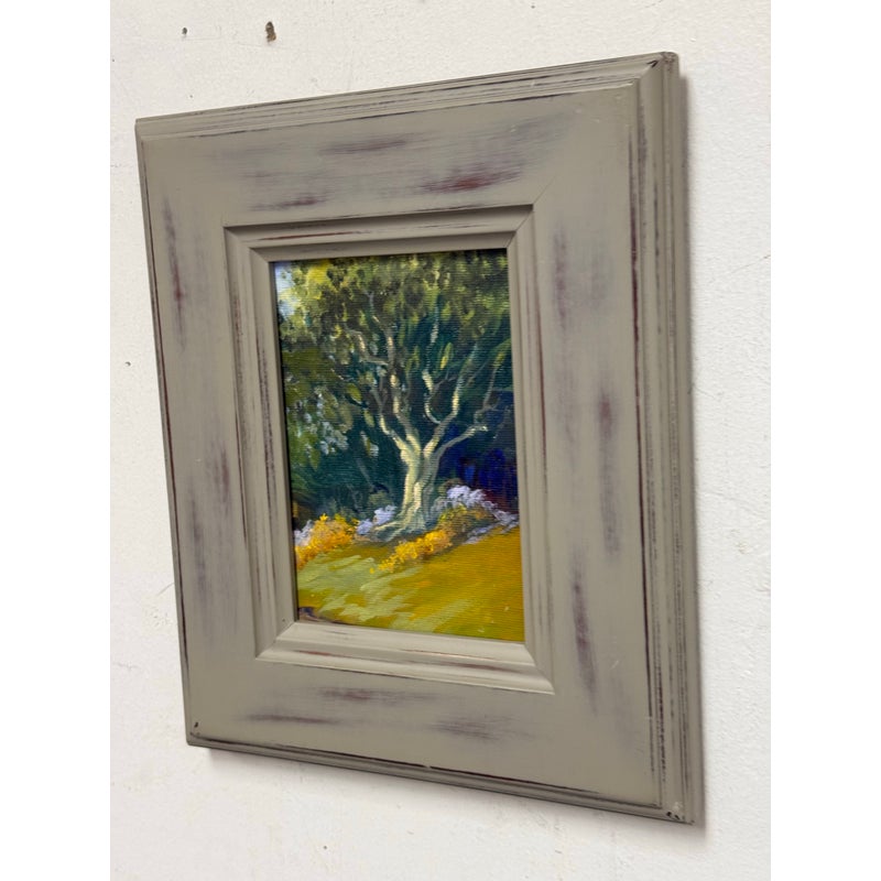 Design Plus Gallery presents a Framed Tree in Grove Painting. This expression of this art piece is impressionistic with its use of carefully rendered colors to achieve a realistic fragment of nature. The painting does not have a signature and is encased in a thick gray wood frame. It is in good condition for its usage.