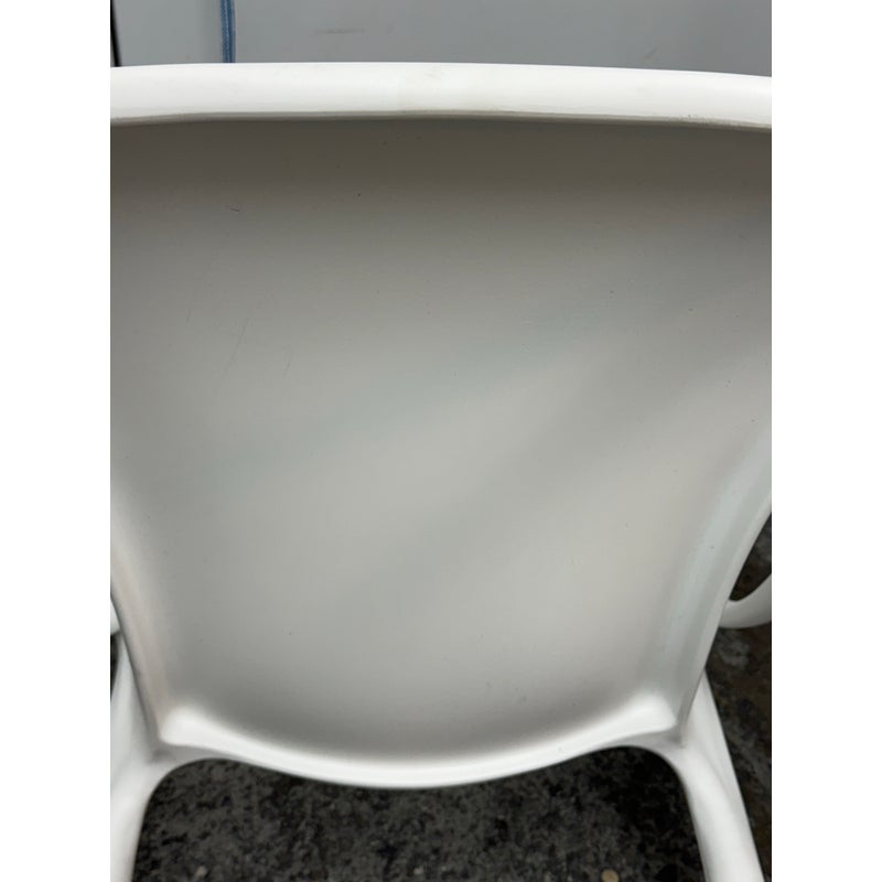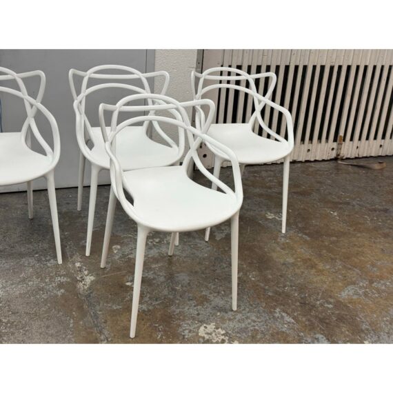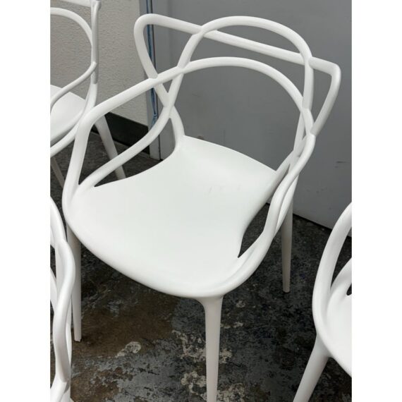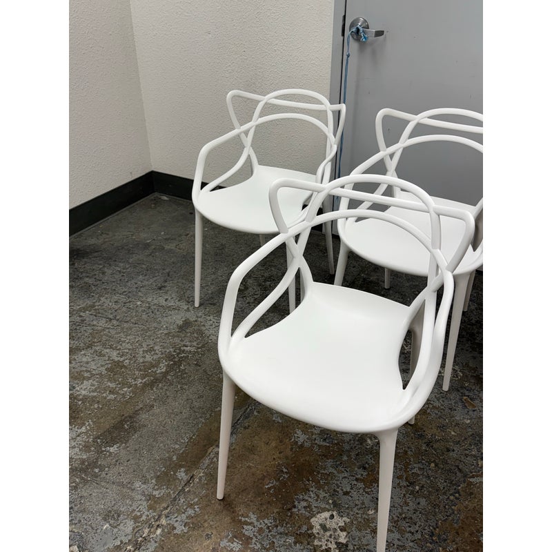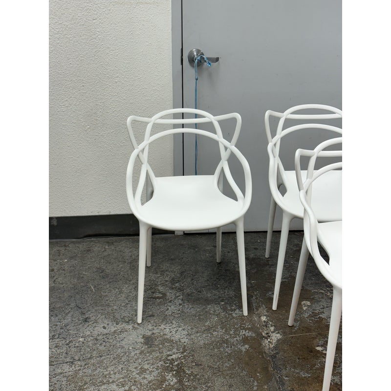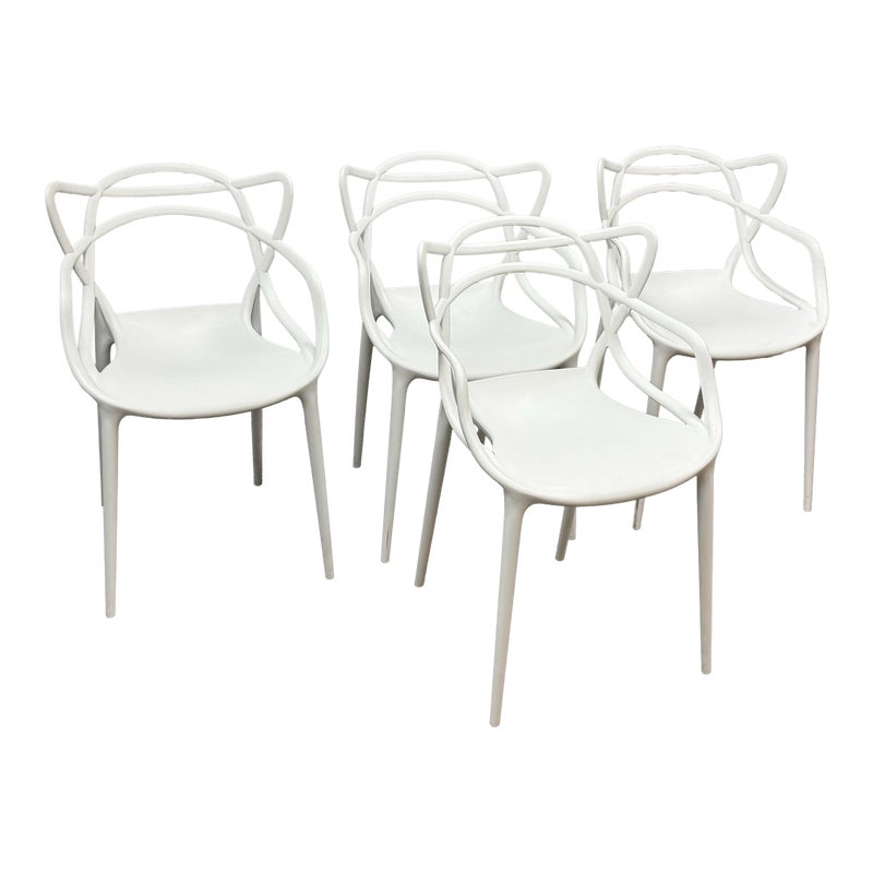 Design Plus Gallery presents a Set of Four Masters Style Dining Chairs. Defined by an interwoven openwork back and fluid sculptural lines, these chairs reference iconic midcentury forms through a single continuous profile. The molded seats and tapered legs give the set a light visual presence, while the monochrome look emphasizes the graphic quality of the design. They are in good condition with visible and minimal wear from usage.