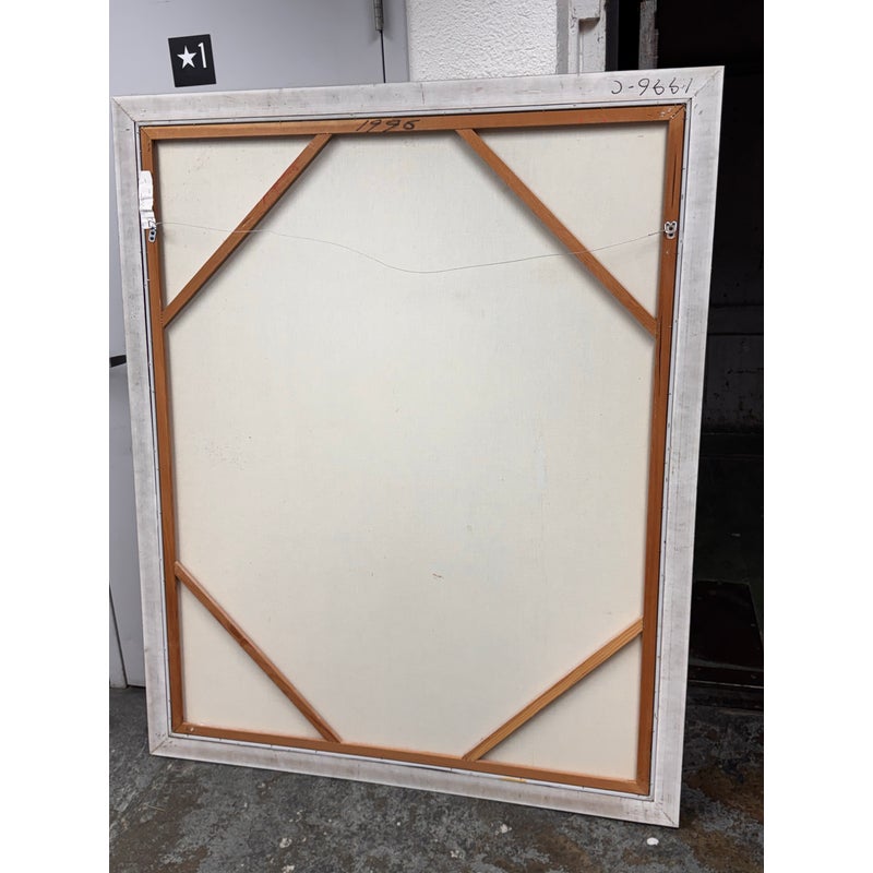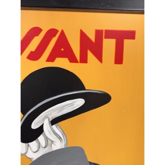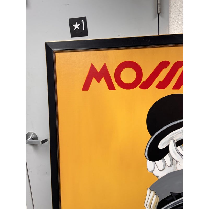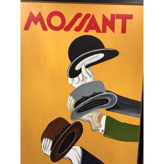 Design Plus Gallery presents a Circa 1996 Painting of “Mossant” advertisement poster illustrated by Leonetto Cappiello for the French hat company. Set against a saturated golden yellow ground, the composition centers on a sequence of gloved hands lifting and presenting hats in black, gray, and brown tones. Cappiello’s graphic approach gives the image a strong sense of movement, with stylized forms and high contrast color capturing the energy of this celebrated advertising design. Presented in a black frame, this painted interpretation retains the bold character and visual appeal associated with the original poster. It is in good condition with visible and minimal wear from usage.
