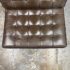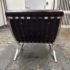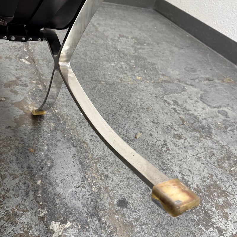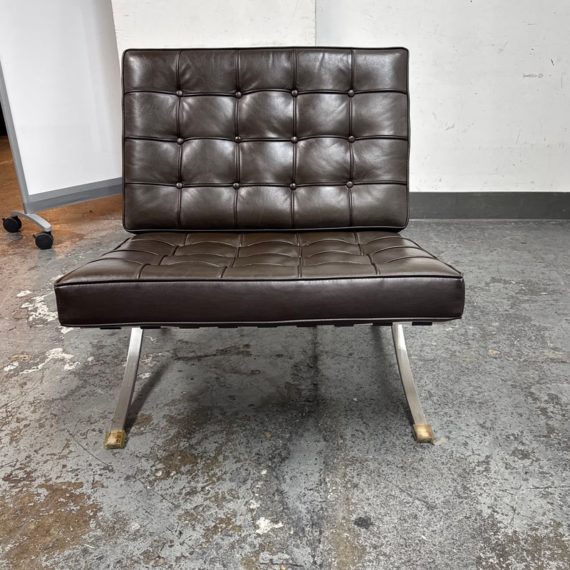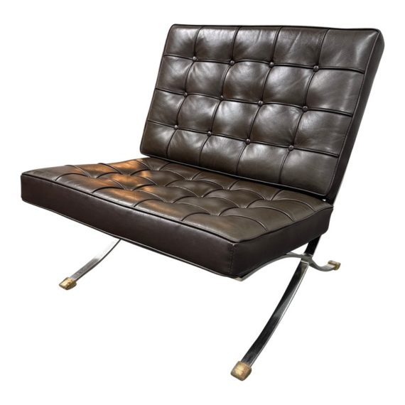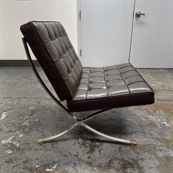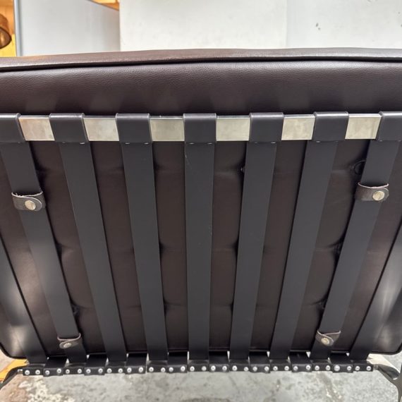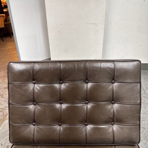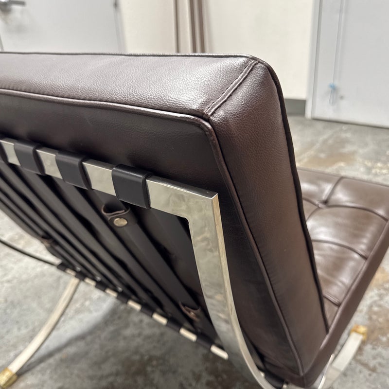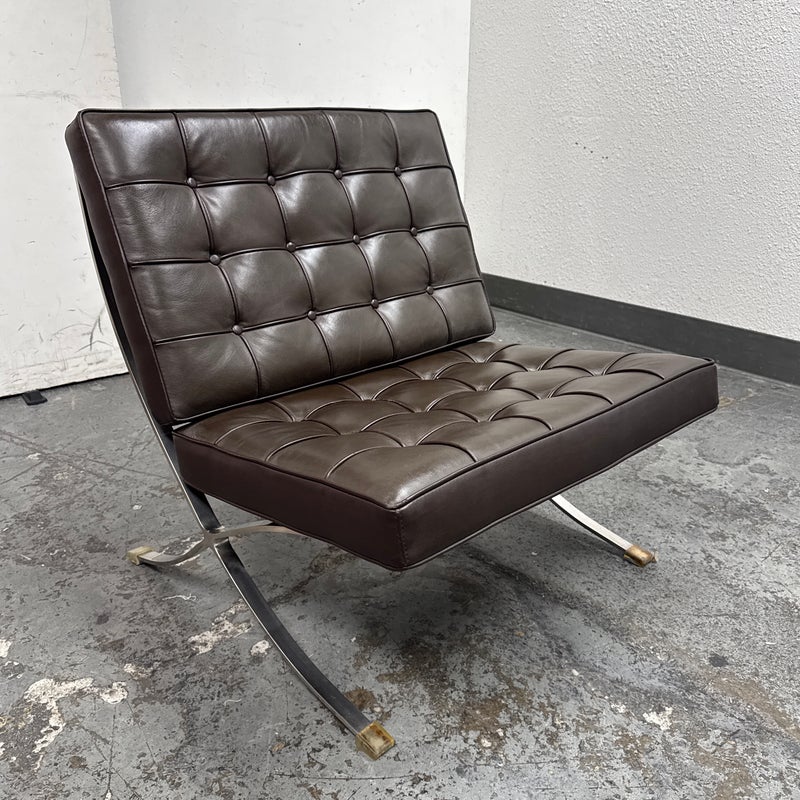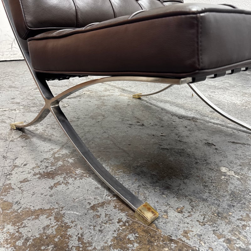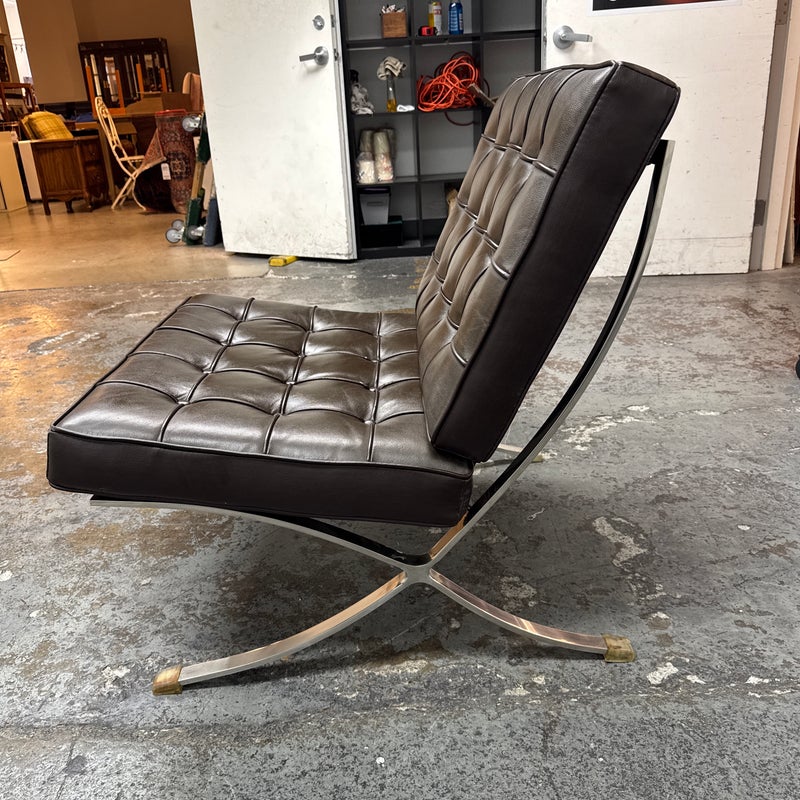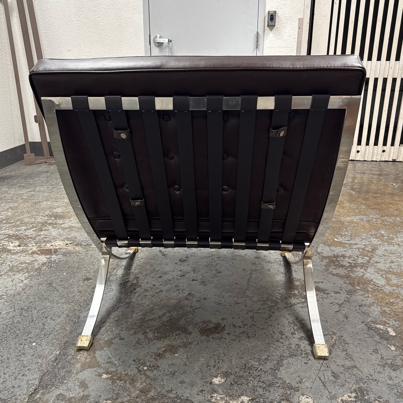 Design Plus Gallery presents a Chocolate Brown Leather Barcelona Chair by Ludwig Mies Van Der Rohe. The chair has heavy button tufting on both the seat and back cushion, which are removable to the the strap system that keeps them in place. This iconic chair was designed in 1929 for the German Pavilion at the Barcelona International Exposition. A chrome plated flat bar steel frame is thought to be based on ancient Roman campaign chairs. Is in good condition for its age + use.