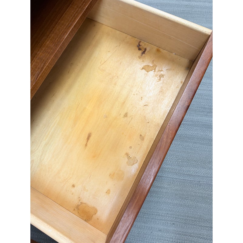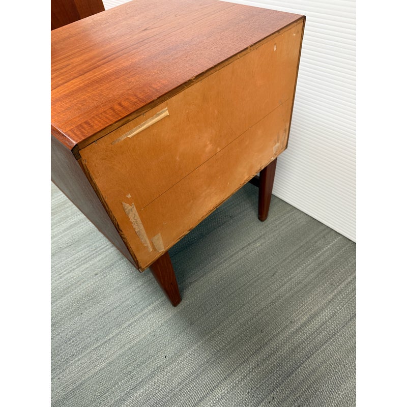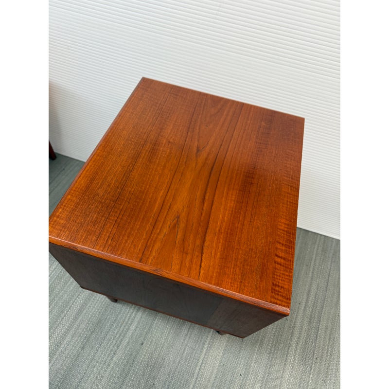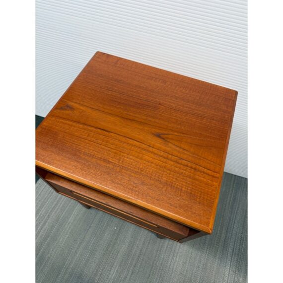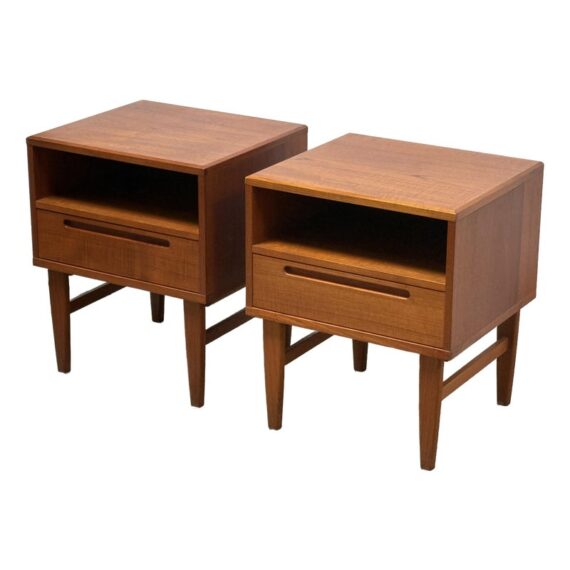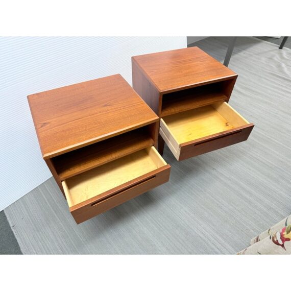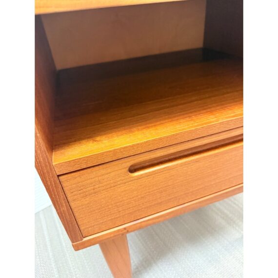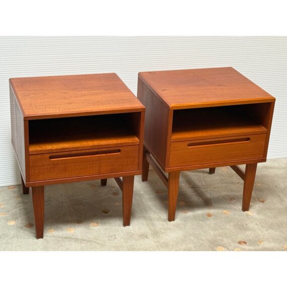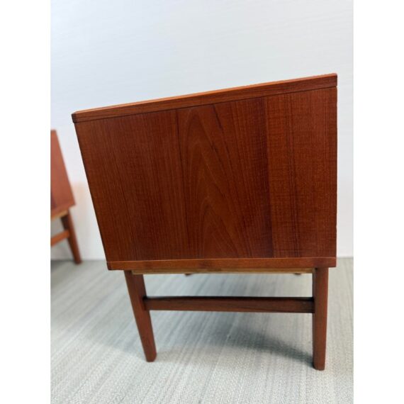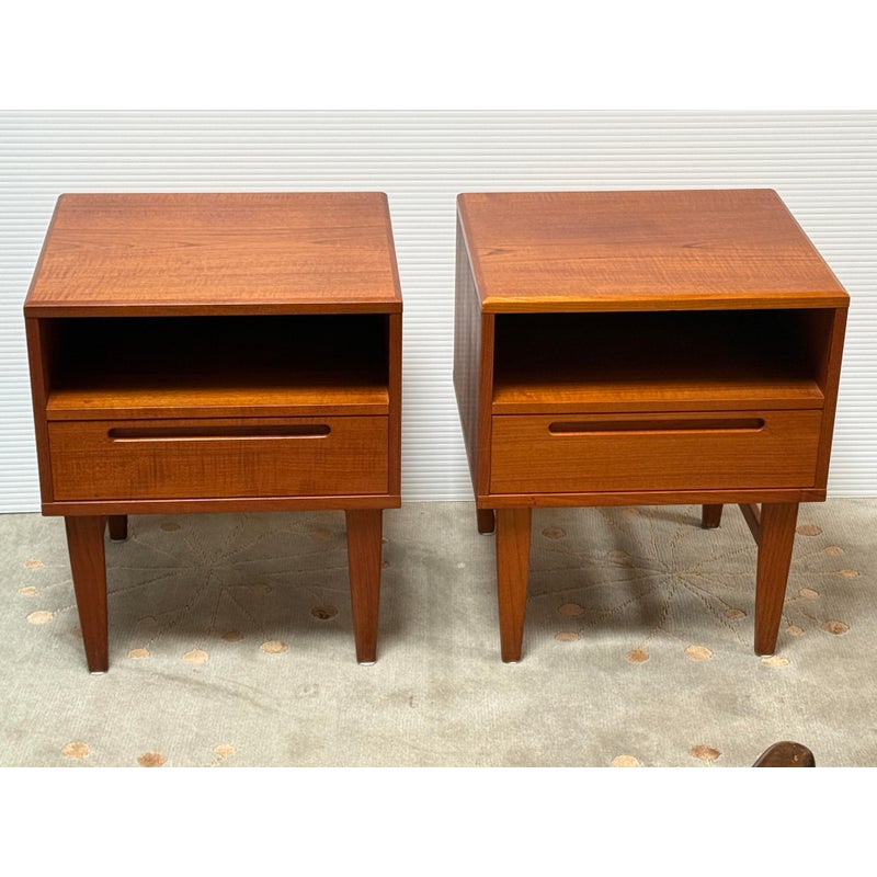 Design Plus Gallery presents a Pair of Mid Century Teak Nightstands Attributed to Nils Jonsson for HJN Mobler, Denmark. Classic teak, clean lines, integrated handles and elevating tapered legs all reference mid century style. No marks. Light surface wear; as-shown condition is good for age and use.