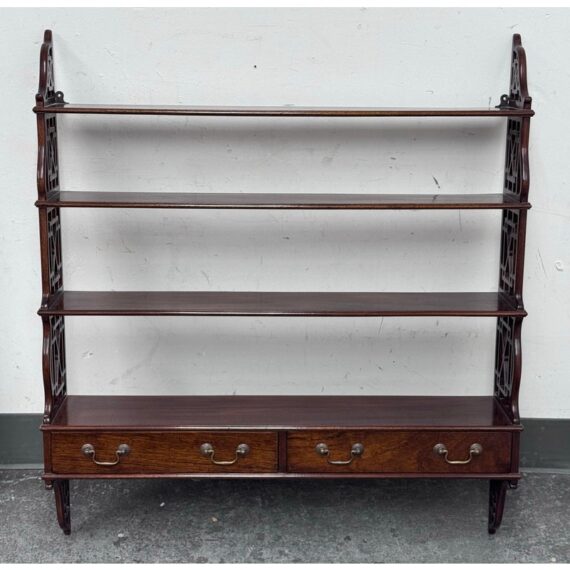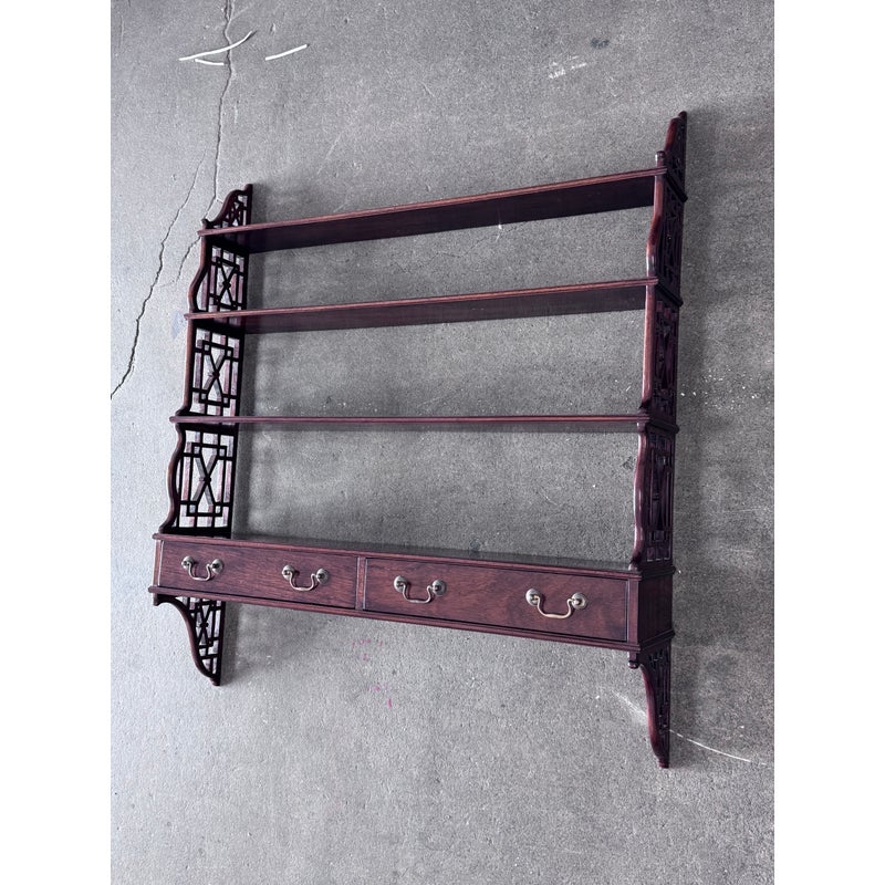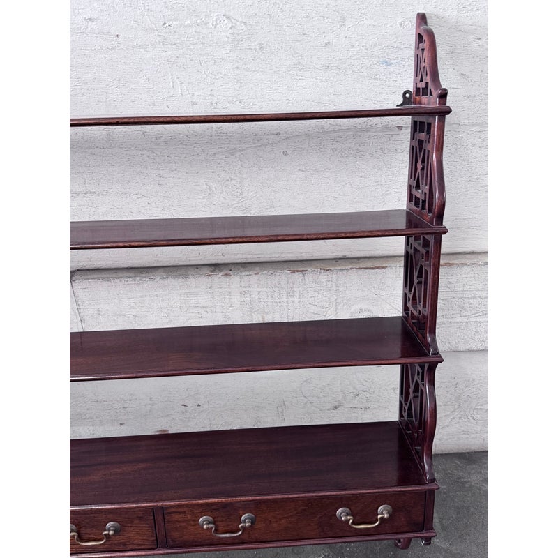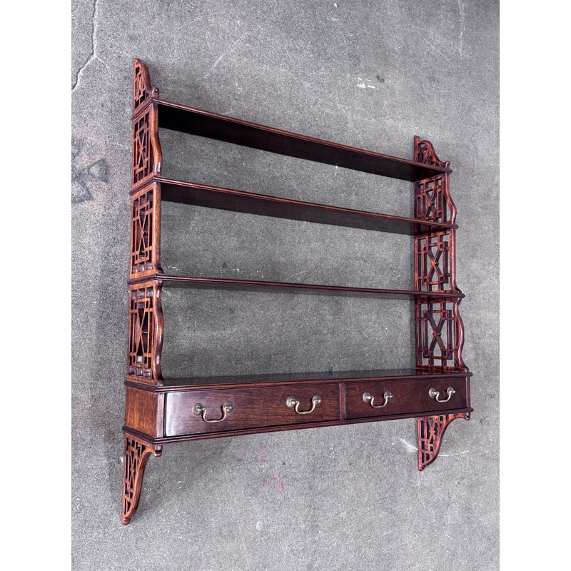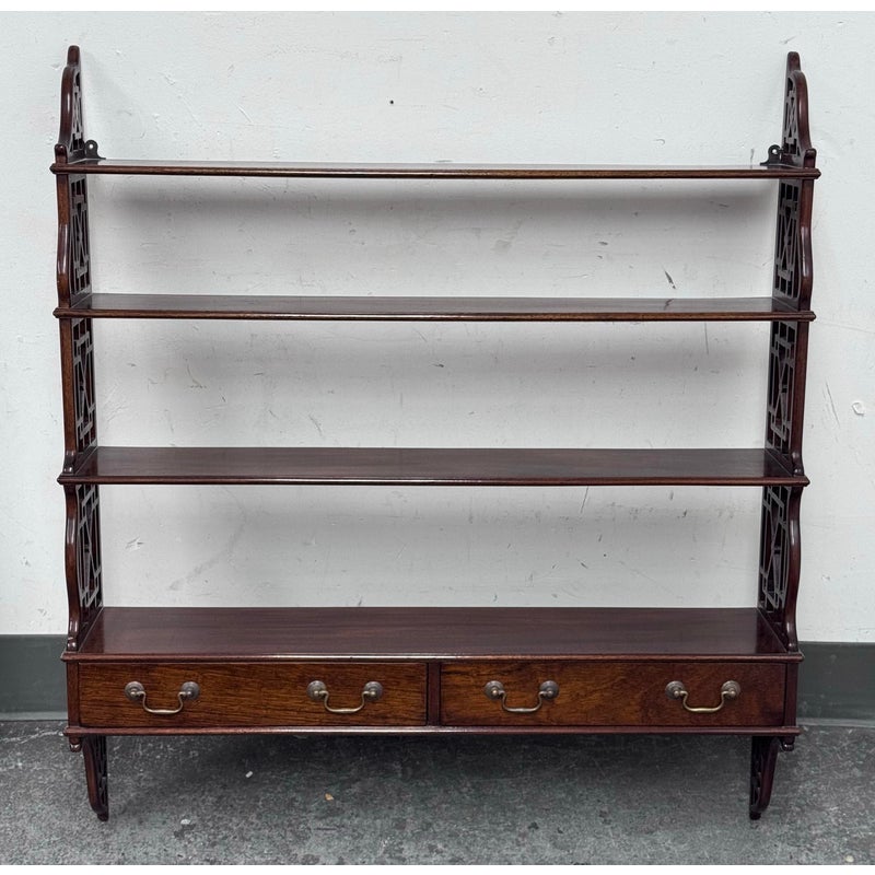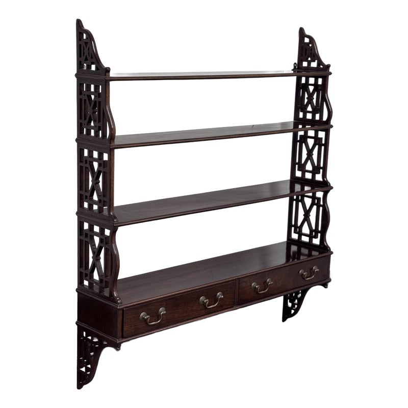 Design Plus Gallery presents a Hanging Set of Shelves from Thomas Chippendale Style. A gorgeous way to display in the home with a fine finish and original brass details.There are three shelves with four drawers at the bottom all attached with open fretwork side panels. Is in good condition with minimal wear for its age + use.