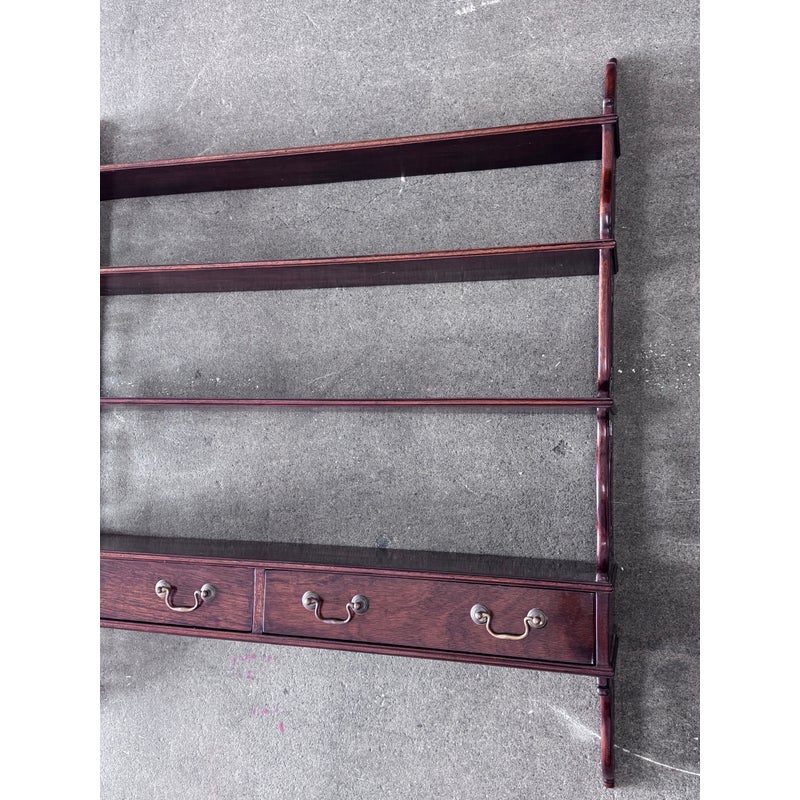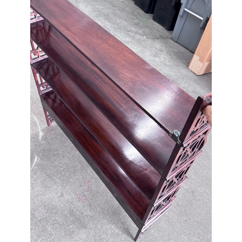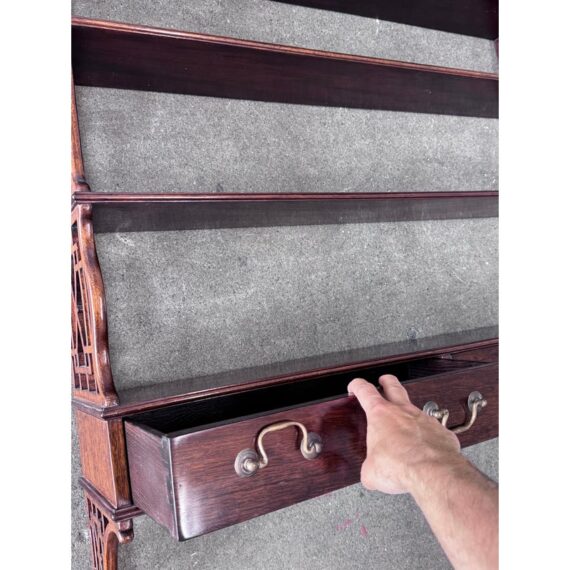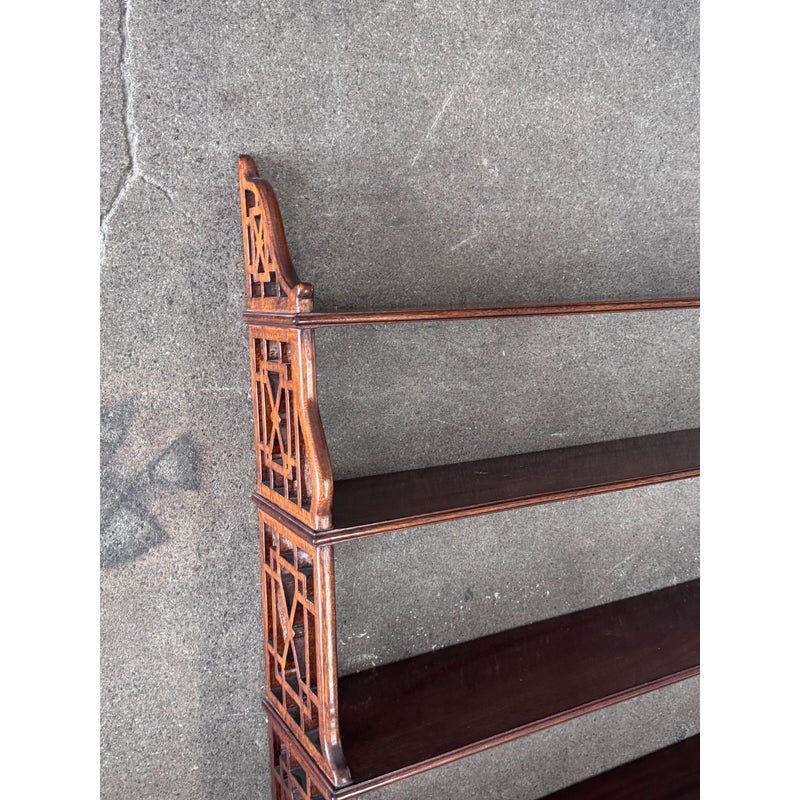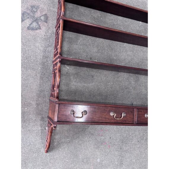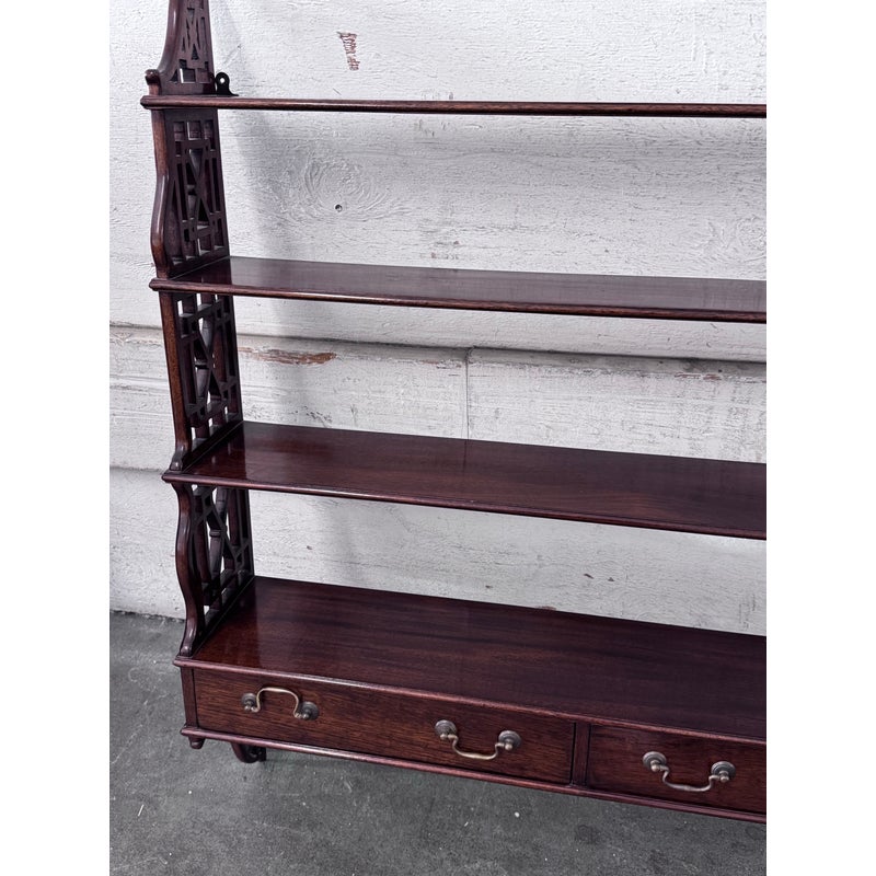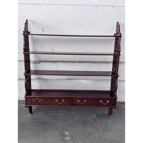 Design Plus Gallery presents a Hanging Set of Shelves from Thomas Chippendale Style. A gorgeous way to display in the home with a fine finish and original brass details.There are three shelves with four drawers at the bottom all attached with open fretwork side panels. Is in good condition with minimal wear for its age + use.