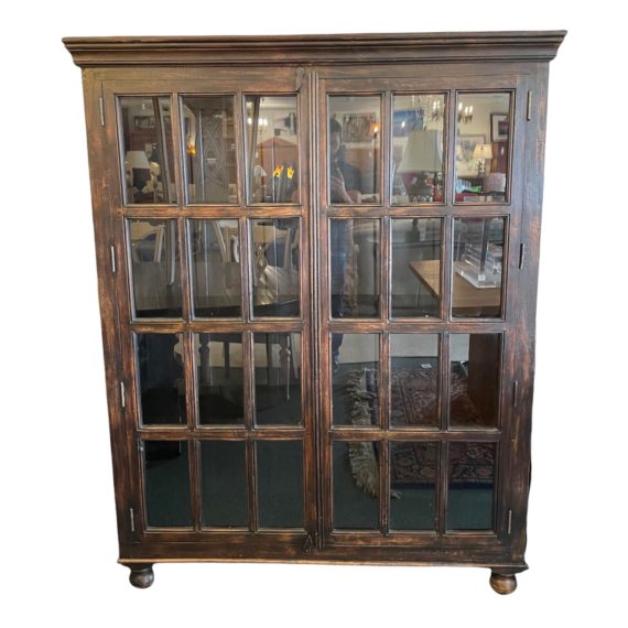 Design Plus Gallery presents an Indian Wood + Glass Display Cabinet. Wood is antiqued and made with a tropical grain for a vintage style. Baluster feet anchors the substantial unit. Glass doors have panes and gives an architectural look. Wood lock mechanisms keep the doors closed at the top and bottom. Minor wear through out, cabinet is in good condition. Shelving on interior is fixed. Purchased from Via Diva in San Rafael. Made in India.