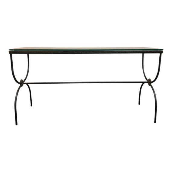 Design Plus Gallery presents a mid-century U-shape console table. The base is metal with a double U Shape. The metal is accented with gold trims and highlights. A rectangular glass sits comfortably on the base.
