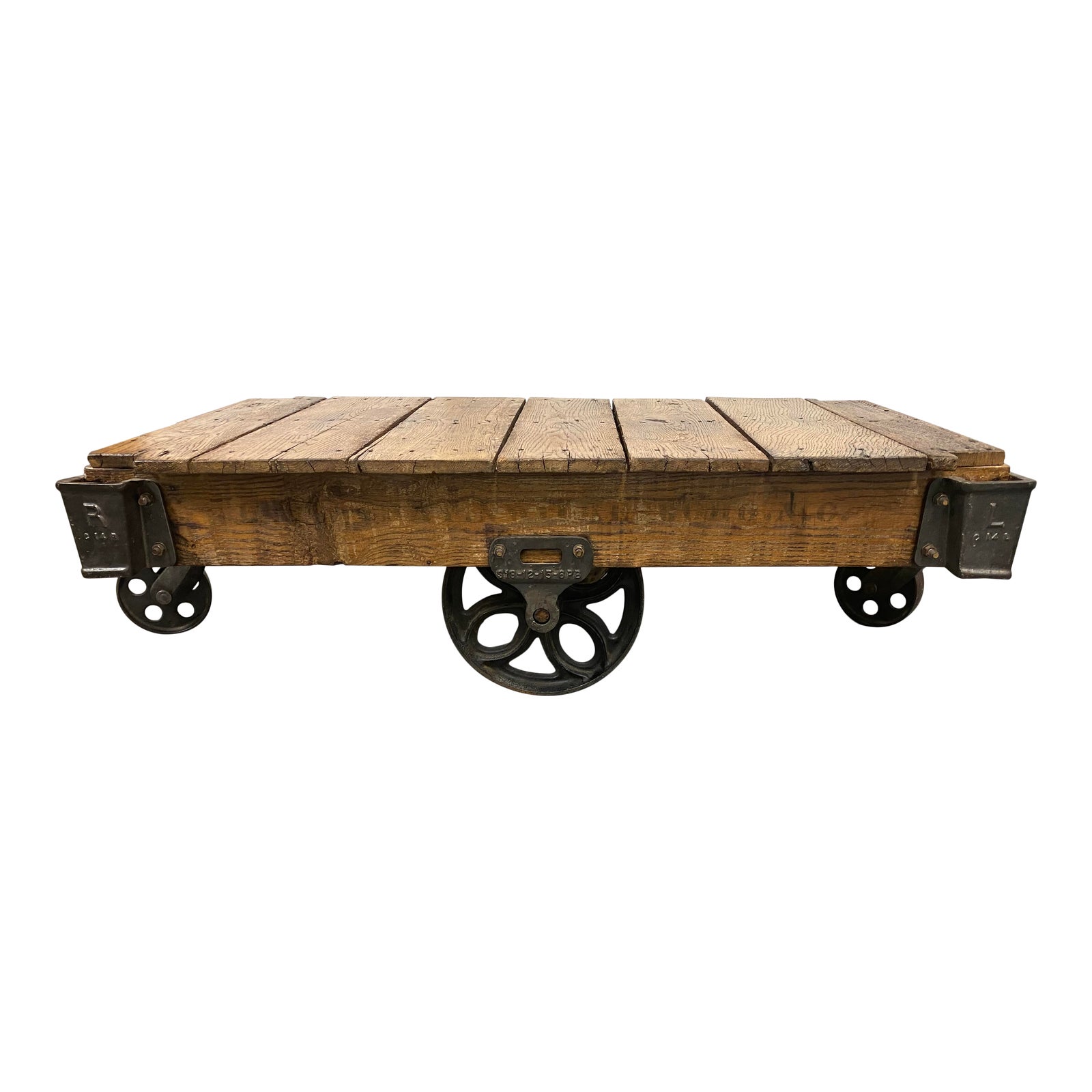 Design Plus Gallery presents a Mid 20th Century Industrial Iron Crate Coffee Table. Redwood planks line the surface and make up the frame. Industrial graded steel wheels anchor the base and move with ease. Visible wear trough out adds to the vintage charm.