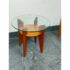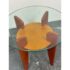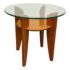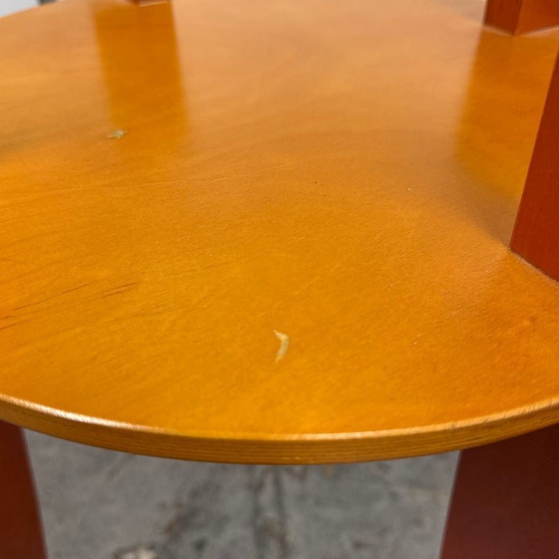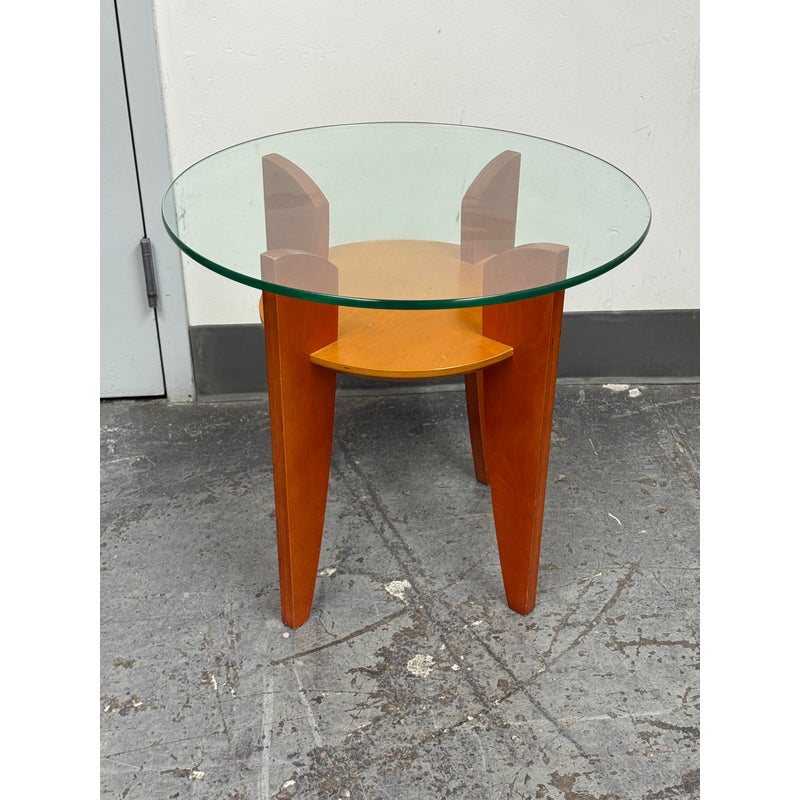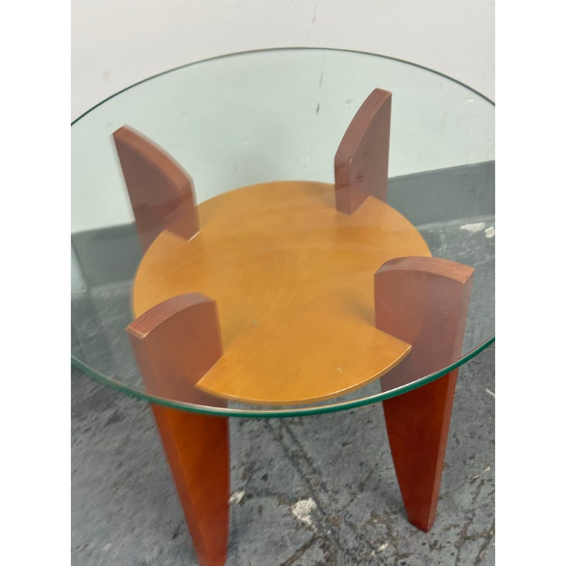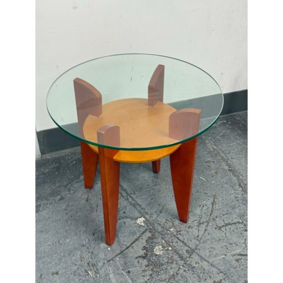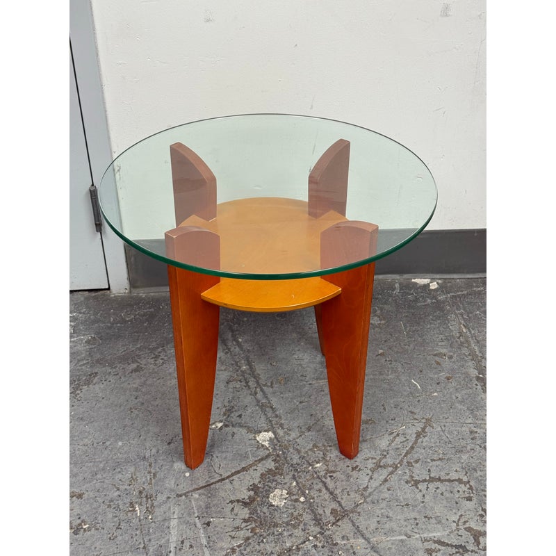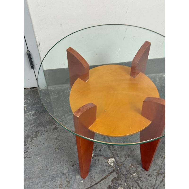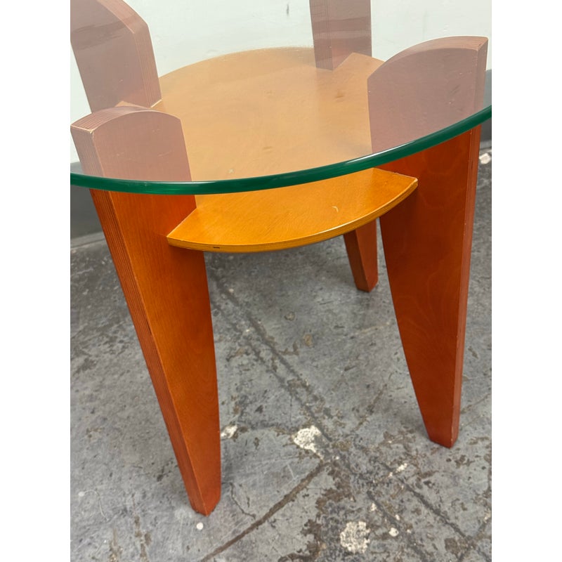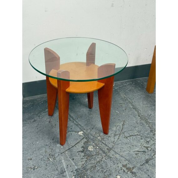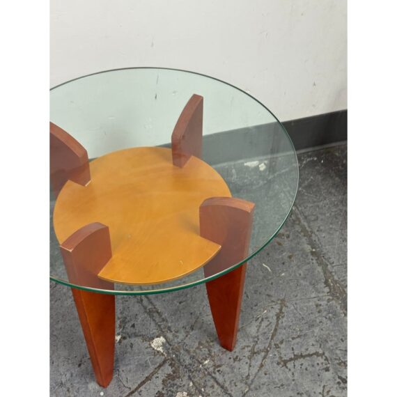 Design Plus Gallery presents a Side Table from InHouse. This two‑tone side table brings a distinctly postmodern vibe to any space. Four dark cherry–finished legs rise in clean symmetry and are united by a circular maple finished shelf, creating a sculptural frame that celebrates simple geometry. A round glass top rests above the structure, revealing the interplay of warm cherry, maple, and airy transparency for a look that’s bold yet refined. In good condition, visible and minimal wear from usage.