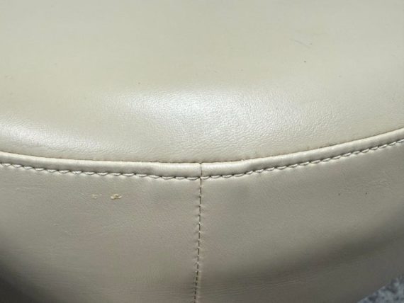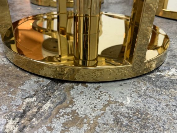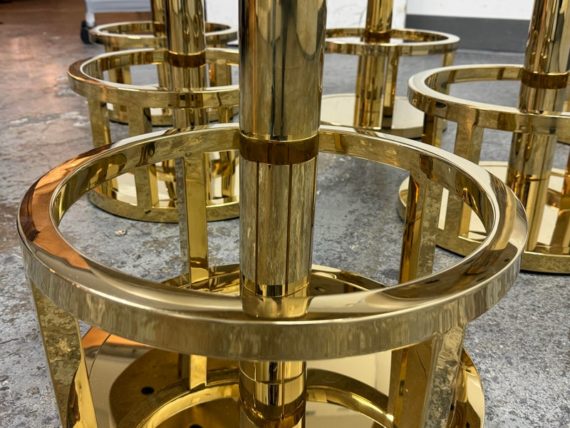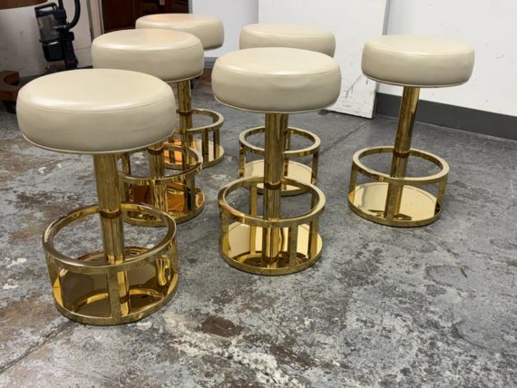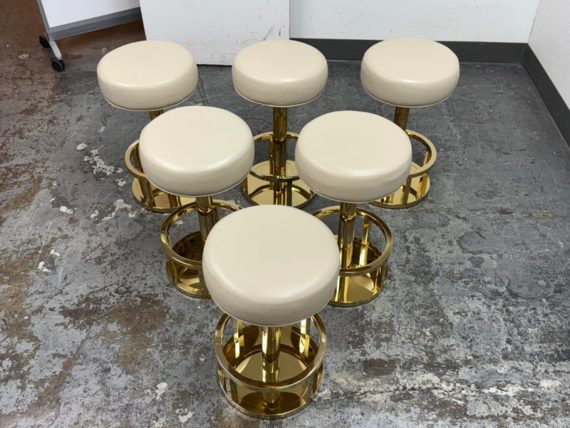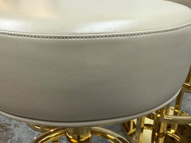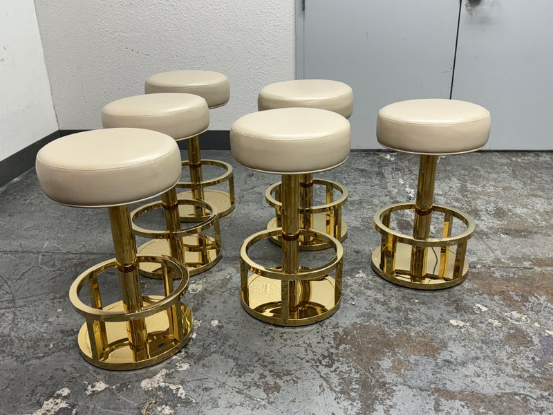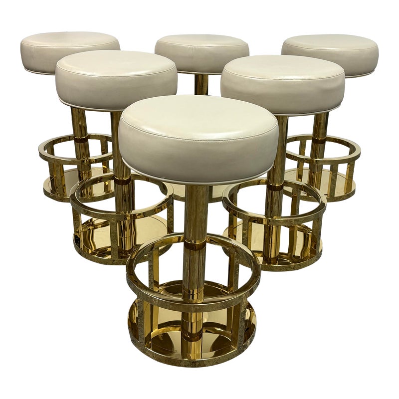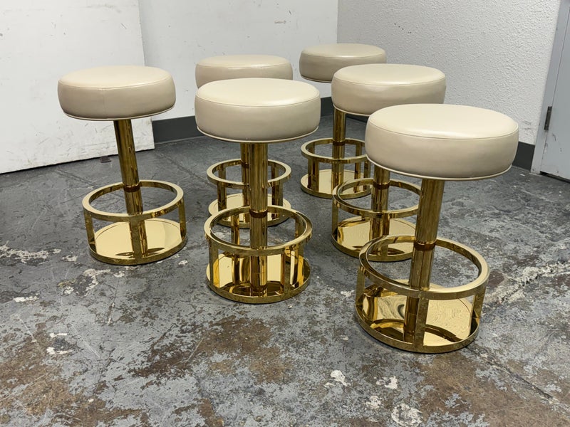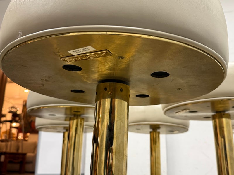 Design Plus Gallery presents a Set of Six Drake Counter Stools from Interlude Home. These Drake counter stools are topped in cream latte faux leather. The polished brass-finish brings together a retro silhouette with an industrial edge, plus the fun of a swivel. They are in good condition with minimal signs of wear from usage. Made in China.