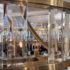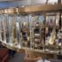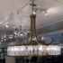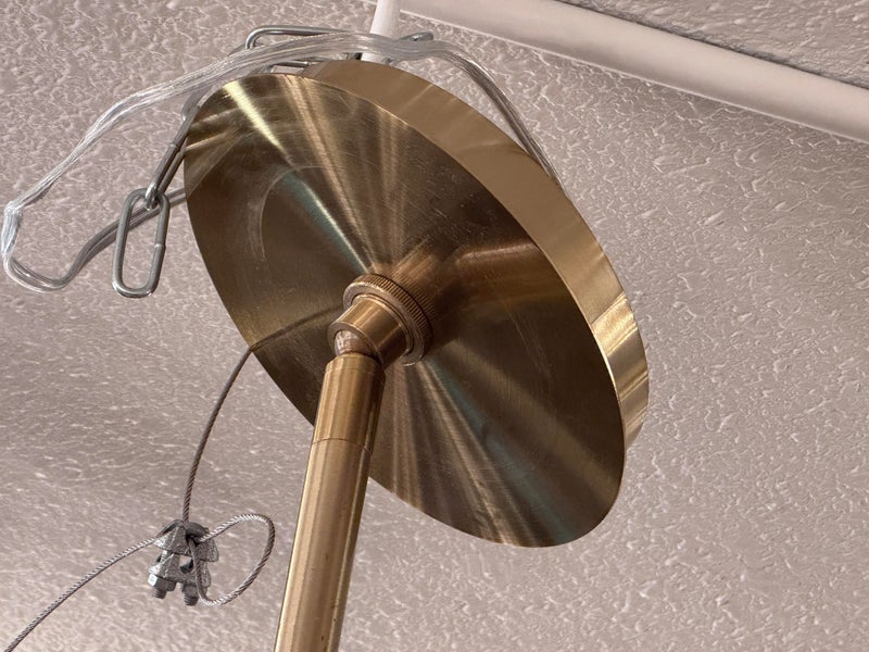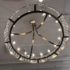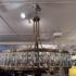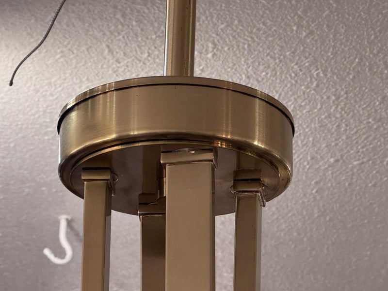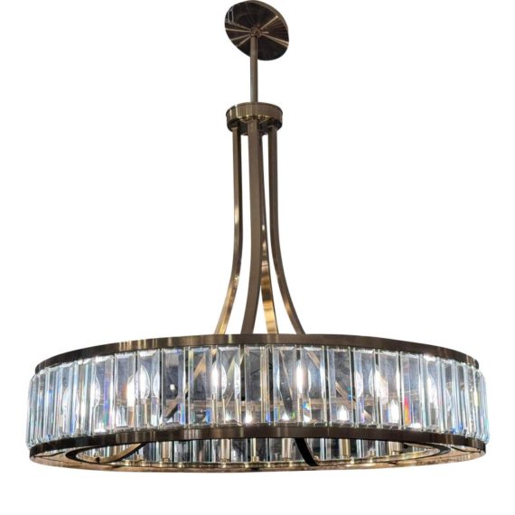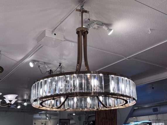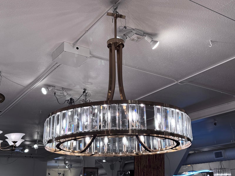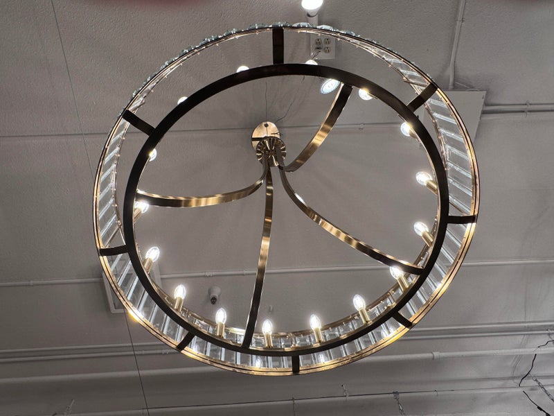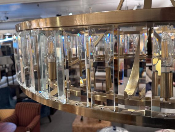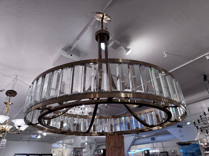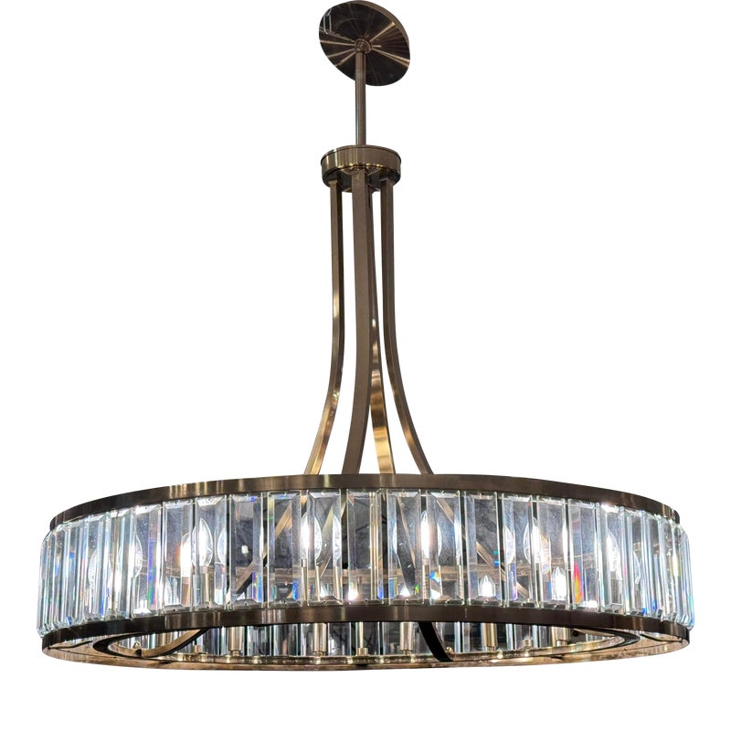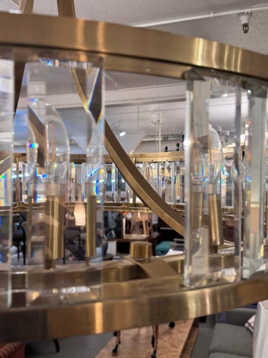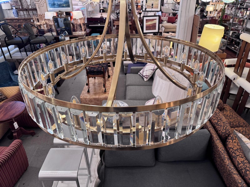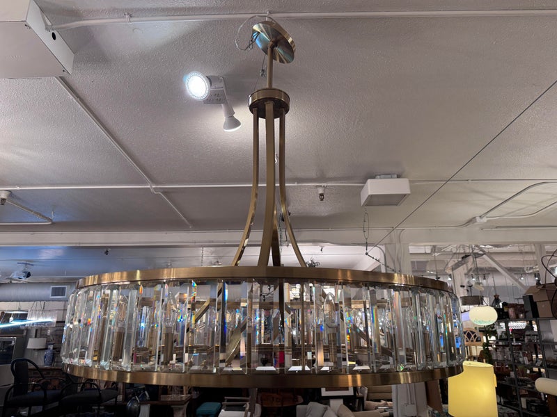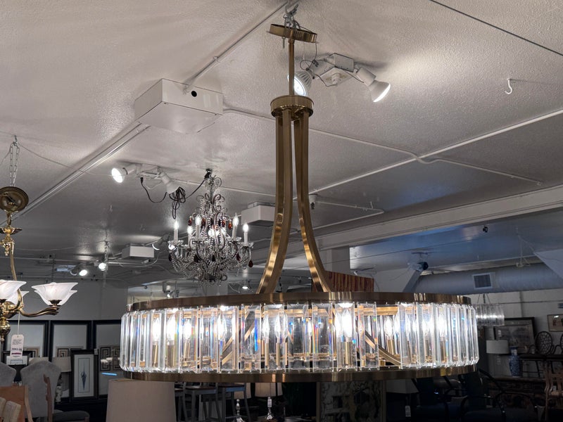 Design Plus Gallery presents a Dramatic Glass + Brass Round Chandelier. Swirl your senses with the show-stopping Intertek Chandelier. Strongly directed by Art Deco influences, this recaptures the magic and romance of glamour’s golden age.The pendant juxtaposes its brass frame with glowing prisms of optical grade glass, refracting the light in a perpetual dance of shimmer and sparkle. Vintage glamour, recast for today. Is missing one glass prism but otherwise in good condition for its age + use.