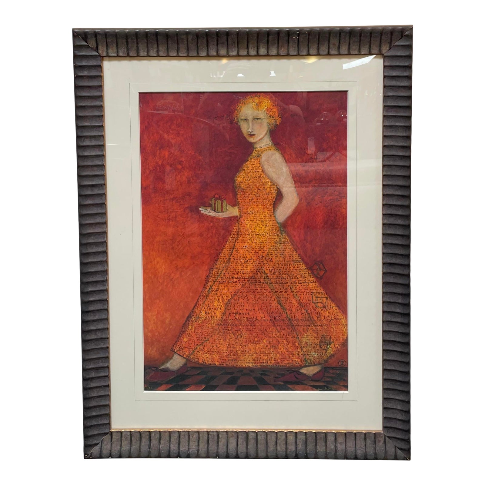 Design Plus Gallery presents Dresses in Words by Irene Belknap. A limited edition Giclee from the Dressed in Words Collection, a straight forward woman bearing a gift and dressed in a flurry of words parades across the frame. Custom Roma Frame. Signed by Artist.