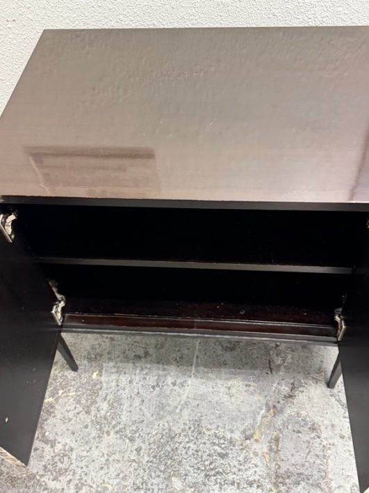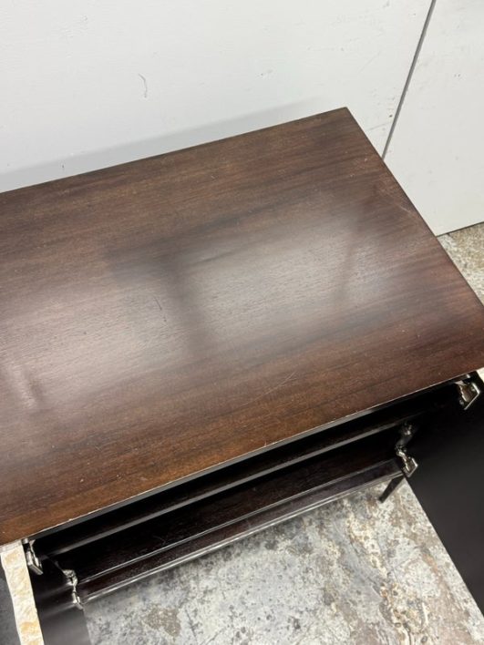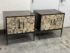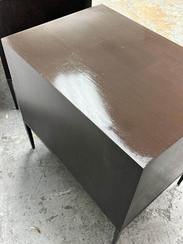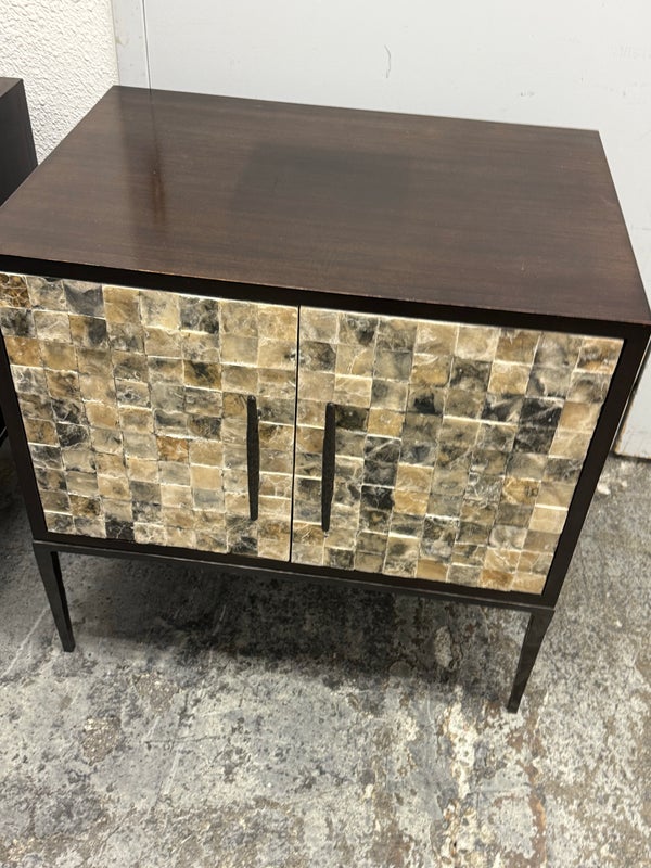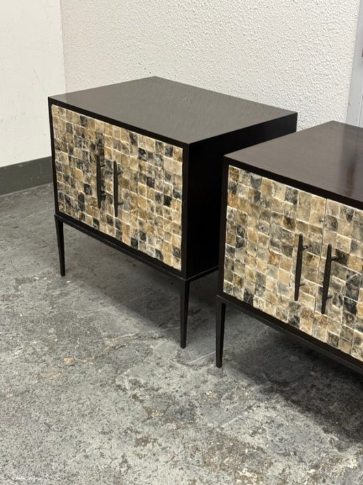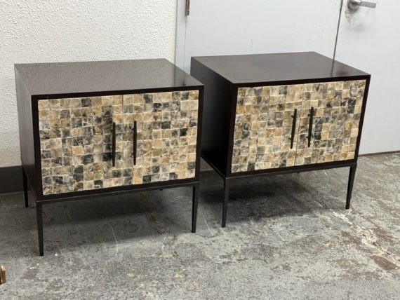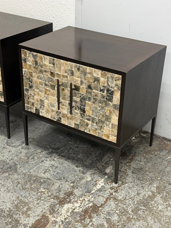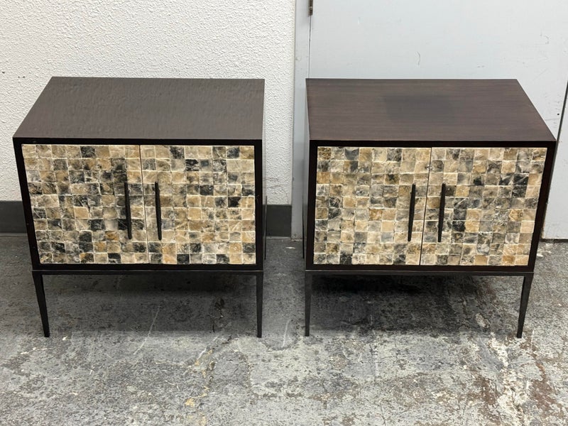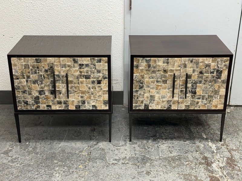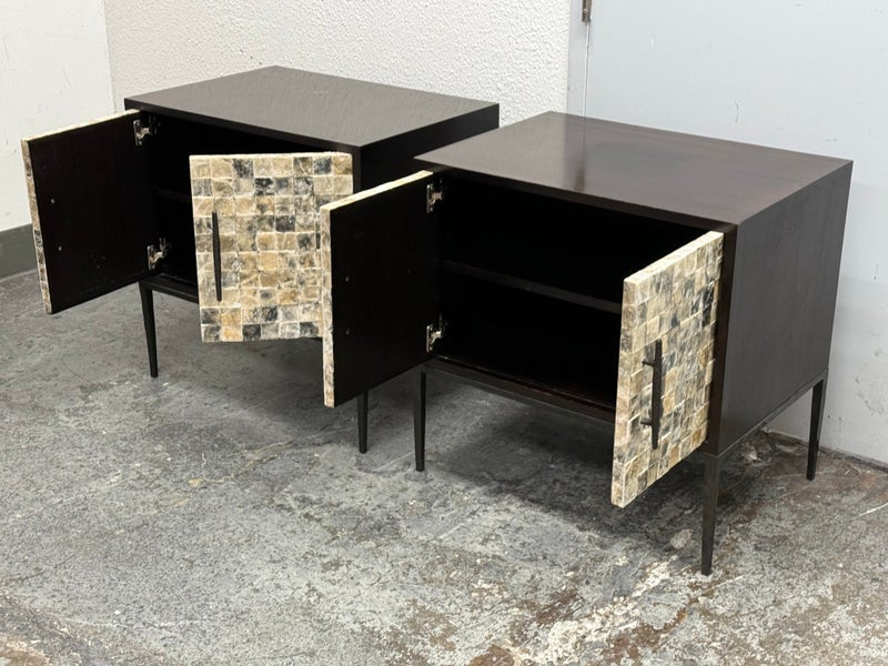 Design Plus Gallery presents a Pair of Breton Collection Lacquered Shell Nightstands. The Breton collection silhouette has been customized with an impressive inlay of shell panel doors and a black wrought iron base. Two doors open to reveal an inner shelf for concealed storage. The wood around the stands frame is of a dark highly polished solid wood. They are both in good condition with minimal visible surface wear from usage. Visible discoloration from sun exposure. These are discontinued models.