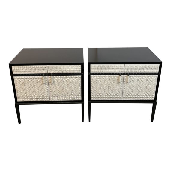 Design Plus Gallery presents a pair of Unique Nightstands by Ironies. Black metal bases support the black wood cabinets, wrapped with riveted metal strapping. The doors and handle pulls are clad with faux bone tile three dimensional geometric shapes, affixed with bronze nails. Behind the doors are adjustable shelves.