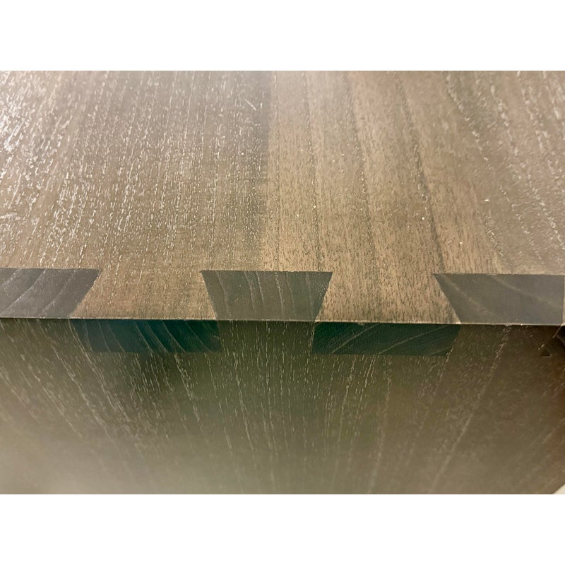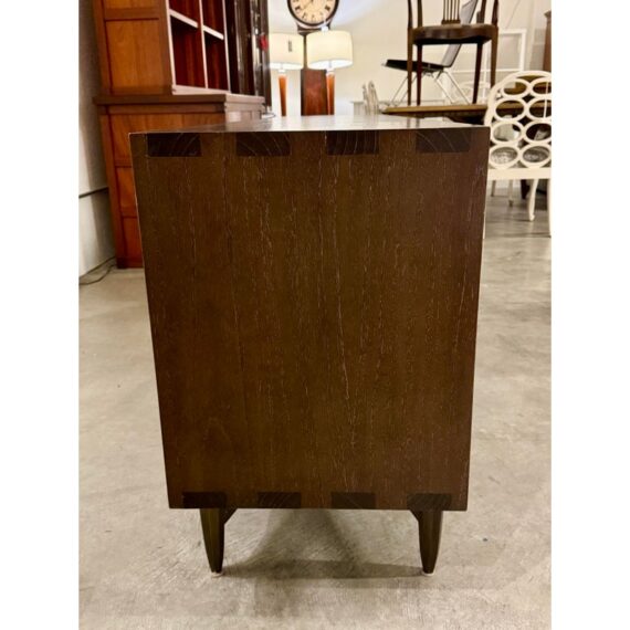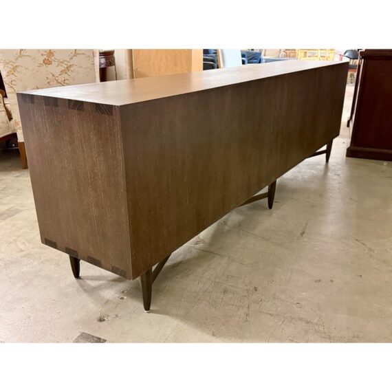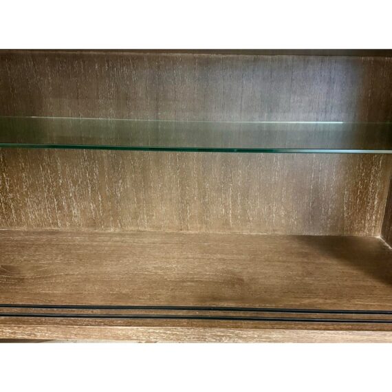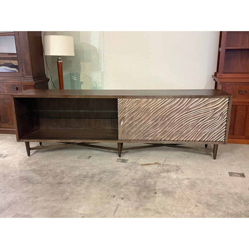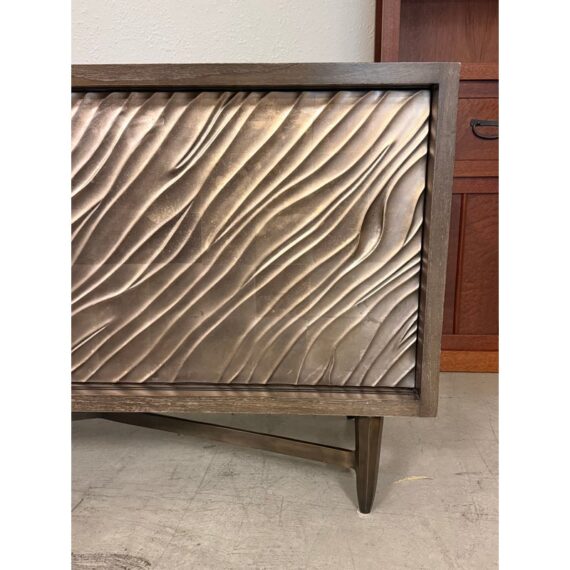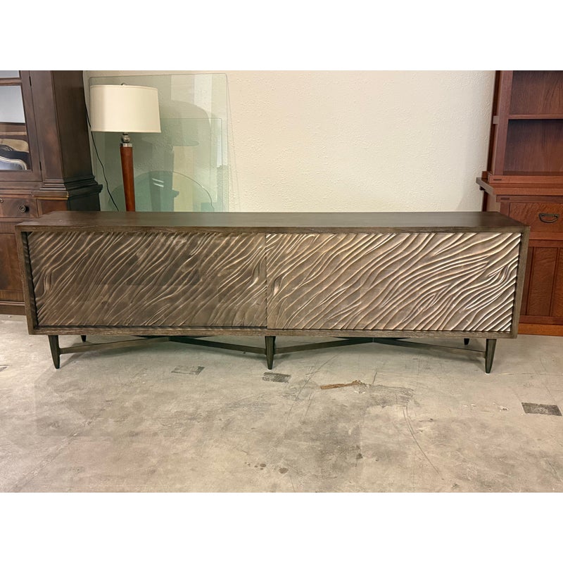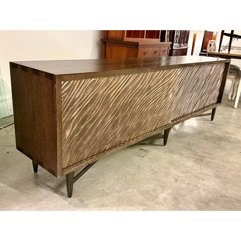 Design Plus Gallery presents the Tallinn Sideboard from Ironies. Enhance your living room decor with the elegant sideboard from Ironies. This beautiful piece is a perfect addition to any home. The piece is made from hardwood + veneer with carved sliding doors. There is a sand cast brass base. The cabinet offers two sliding doors that are carved with a wavy detail. When open you reveal an interior cavity space that is divided by tempered glass shelves. The construction on the cabinet is fine with dovetailed edges, had carved aspects and acute attention to detail. Overall there is some surface wear to the frame but is considered to be in good condition. Made in the USA.
