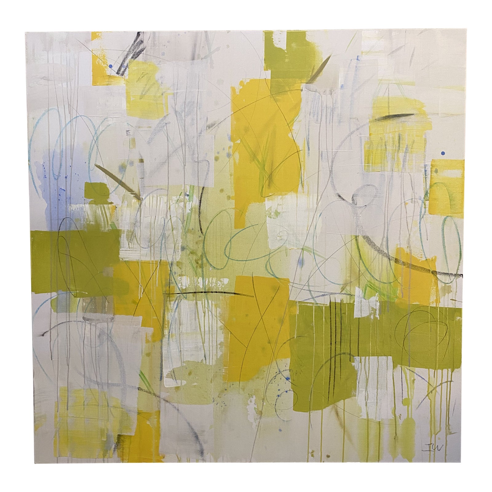 Original painting by Isabel Wyatt. Delightful in color and motion, this original acrylic painting can be a focal point in any room, be it loft or foyer. The large frameless canvas keeps the expressiveness light and airy. Signed by the artist.