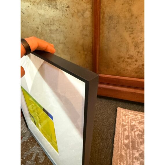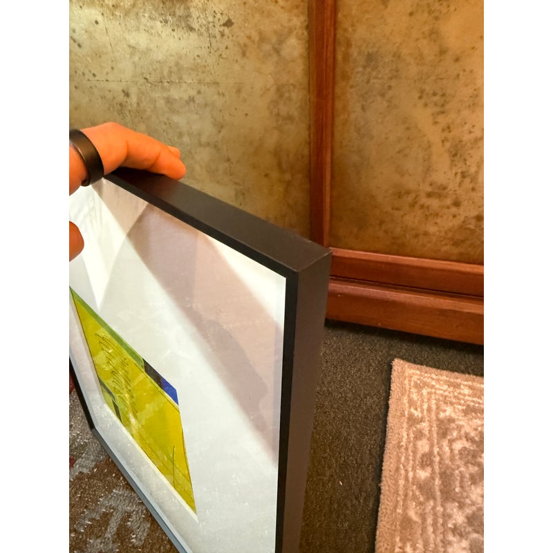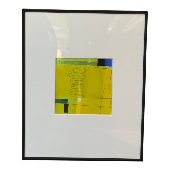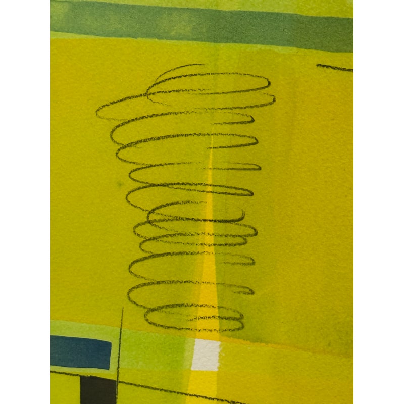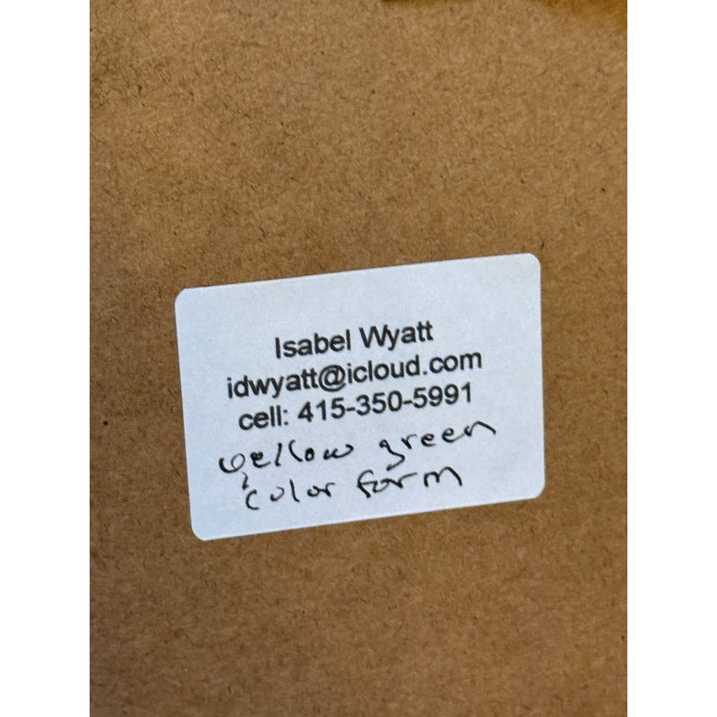 Design Plus Gallery presents an Original Acrylic Painting “Yellow Green Colorform” by Isabel Wyatt. The artwork is an architectural layer of the colors yellow with boxes of blue and black in varying block shapes to give this a creative name as its title. The piece has a sticker with title and artist name on the back side of the canvas’s frame as well as her signature on the lower right hand side of the painting. It is in good condition for its usage.