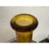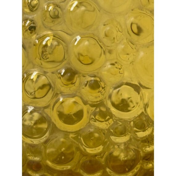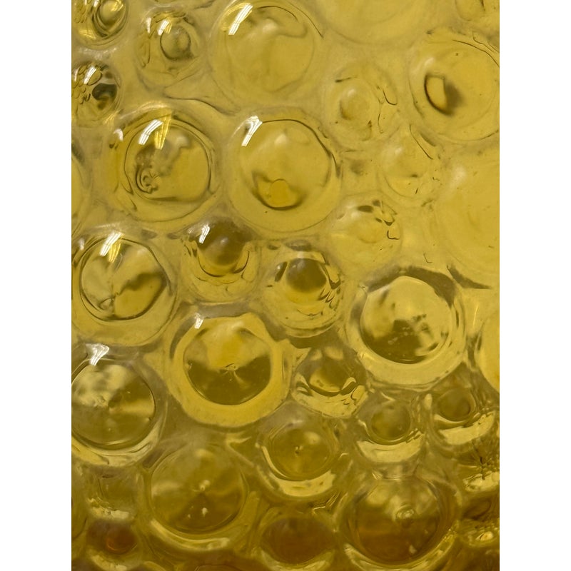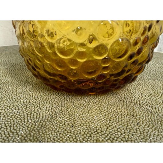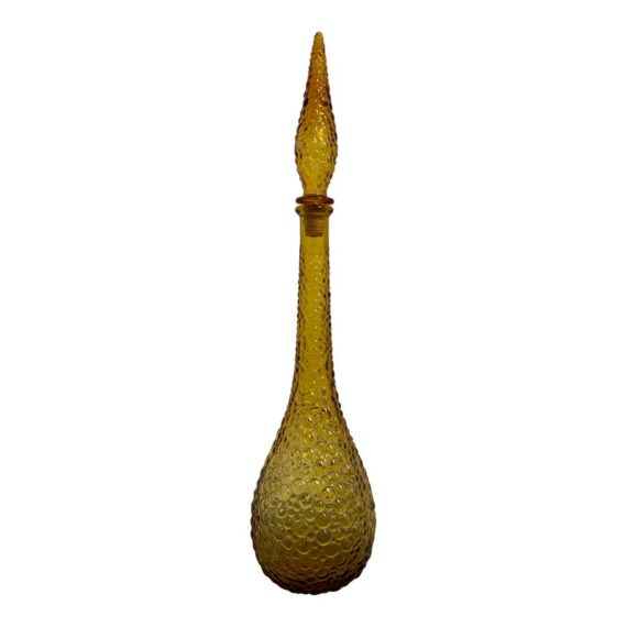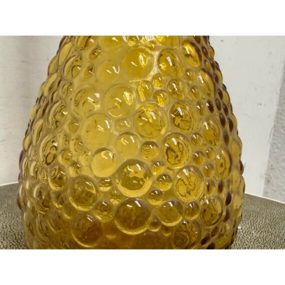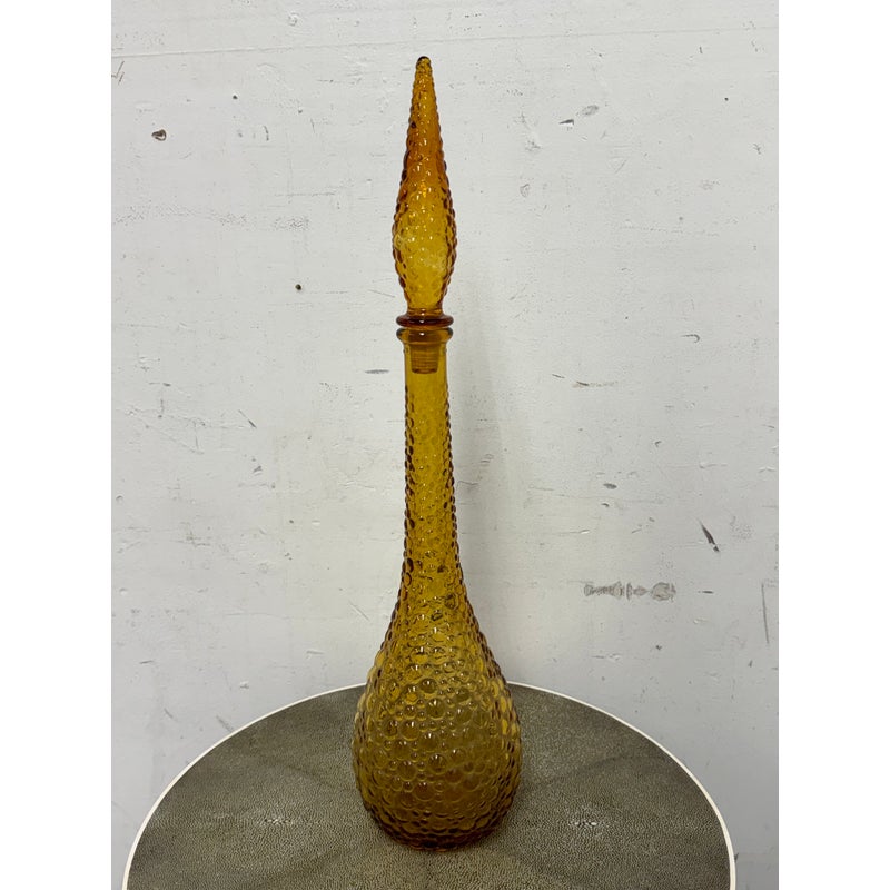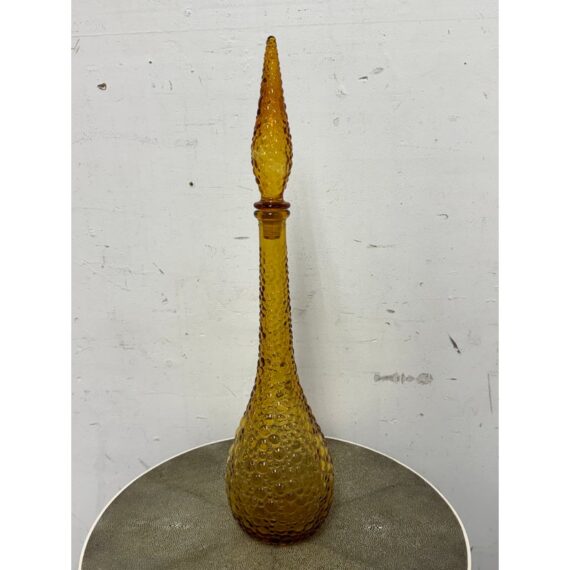 Design Plus Gallery presents an Amber Toned Hand Blown Vessel from Italy. The tall glass bottle has a textured, hobnail-style surface and a gracefully elongated silhouette. The warm golden hue and sculptural stopper create visual depth and elegance, making it a striking accent for a console, shelf, or tabletop display. Condition is consistent with age and use.