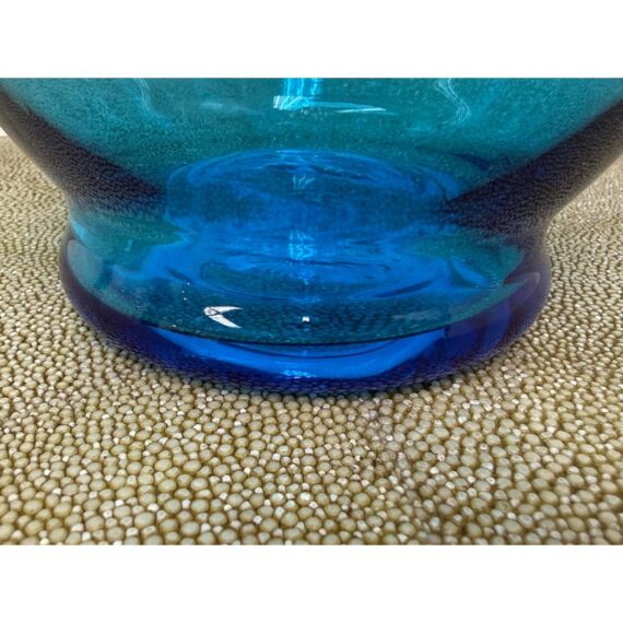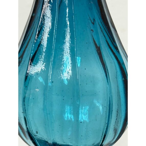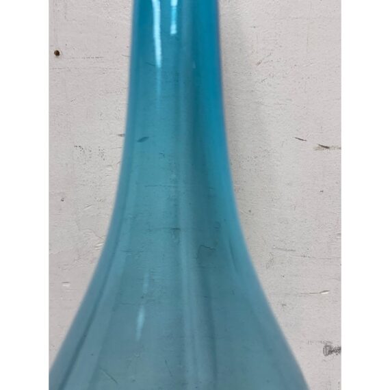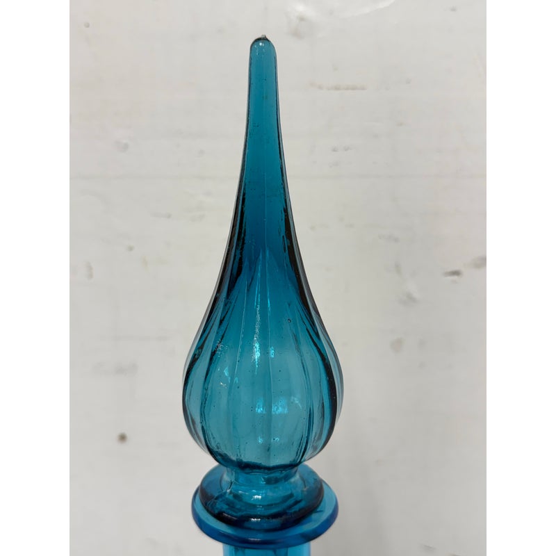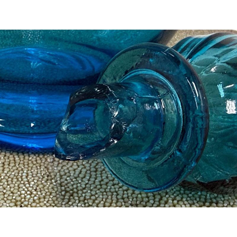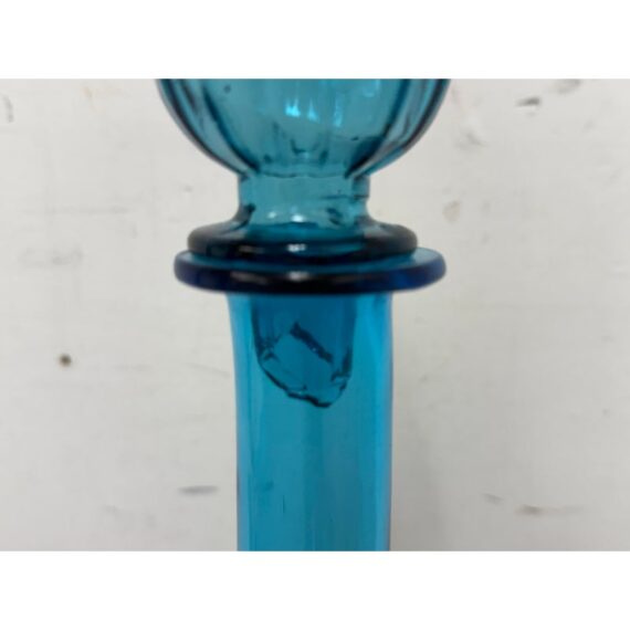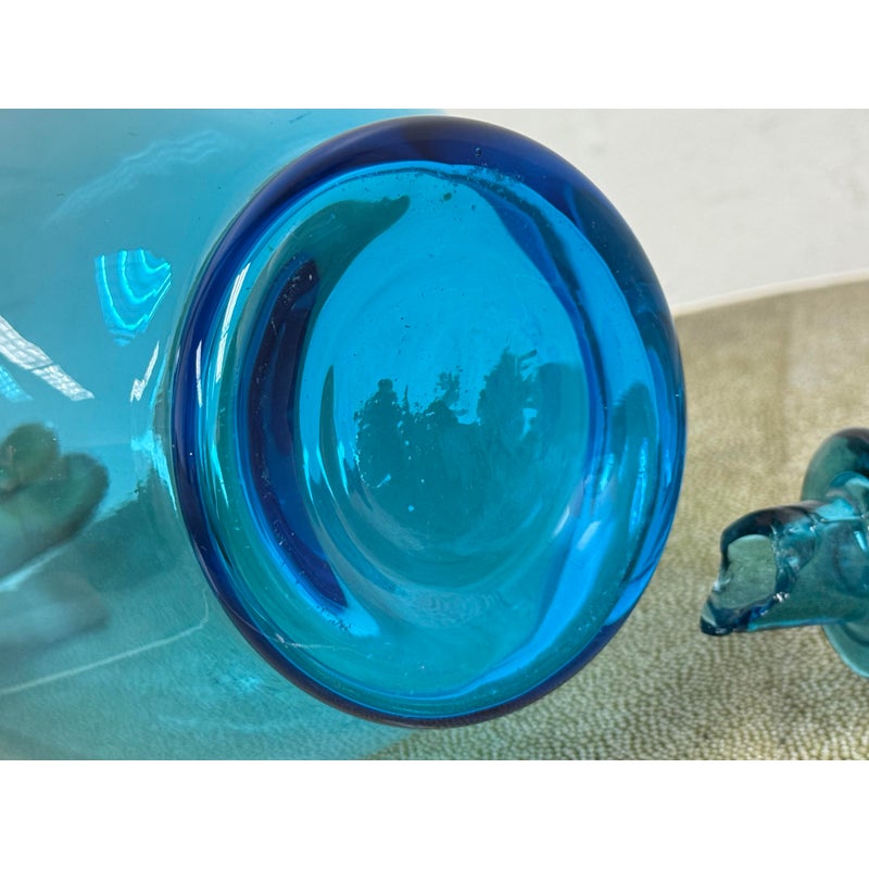 Design Plus Gallery presents a Blue Toned Hand Blown Vessel from Italy. The tall glass bottle has a smooth surface and a gracefully elongated silhouette. The cool blue hue and sculptural stopper create visual depth and elegance, making it a striking accent for a console, shelf, or tabletop display. Condition is consistent with age and use.