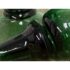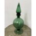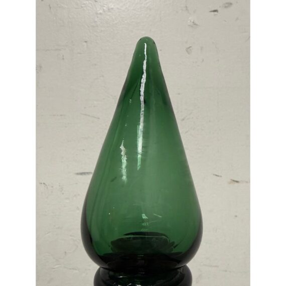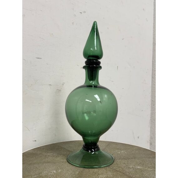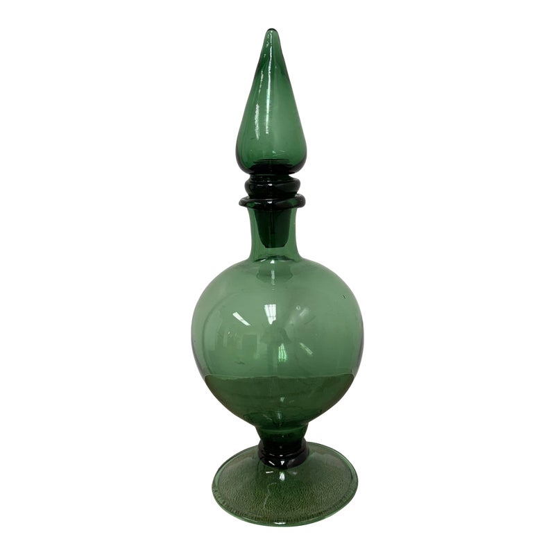 Design Plus Gallery presents a Green Toned Hand Blown Vessel from Italy. The green glass decorative bottle has a rounded body and a tall, tapered stopper. The translucent glass showcases rich tonal depth and subtle reflections, making it a striking accent piece for a shelf, console, or tabletop. Condition is consistent with age and use.