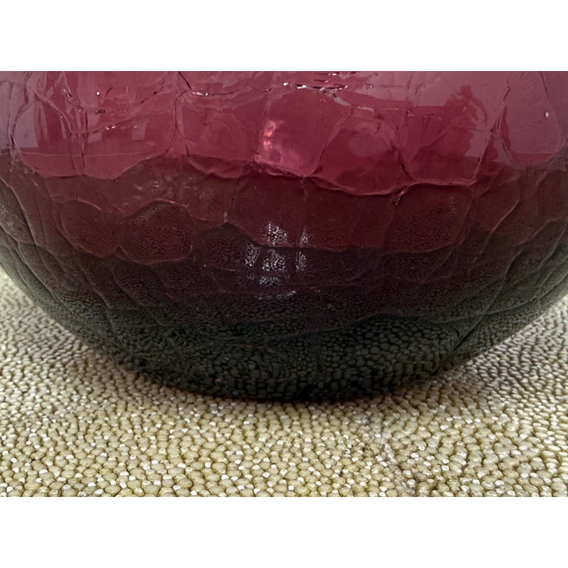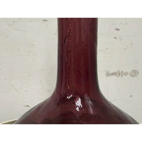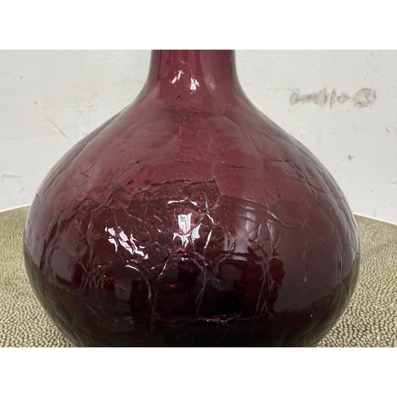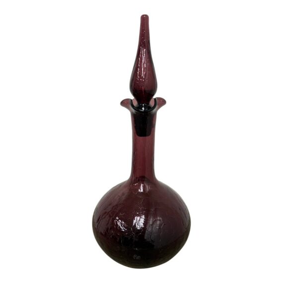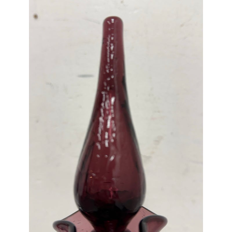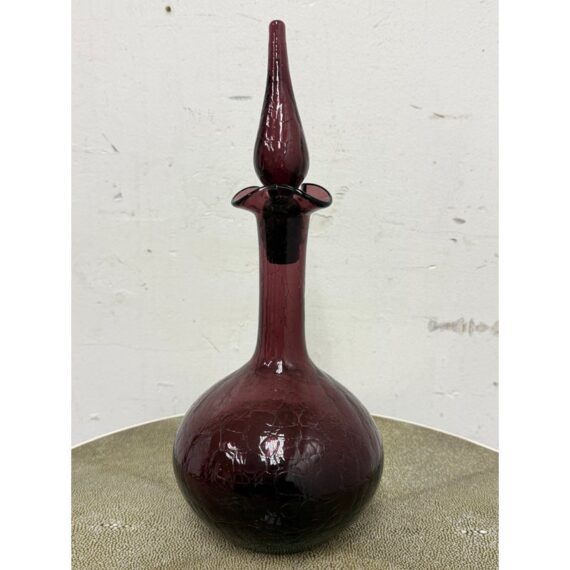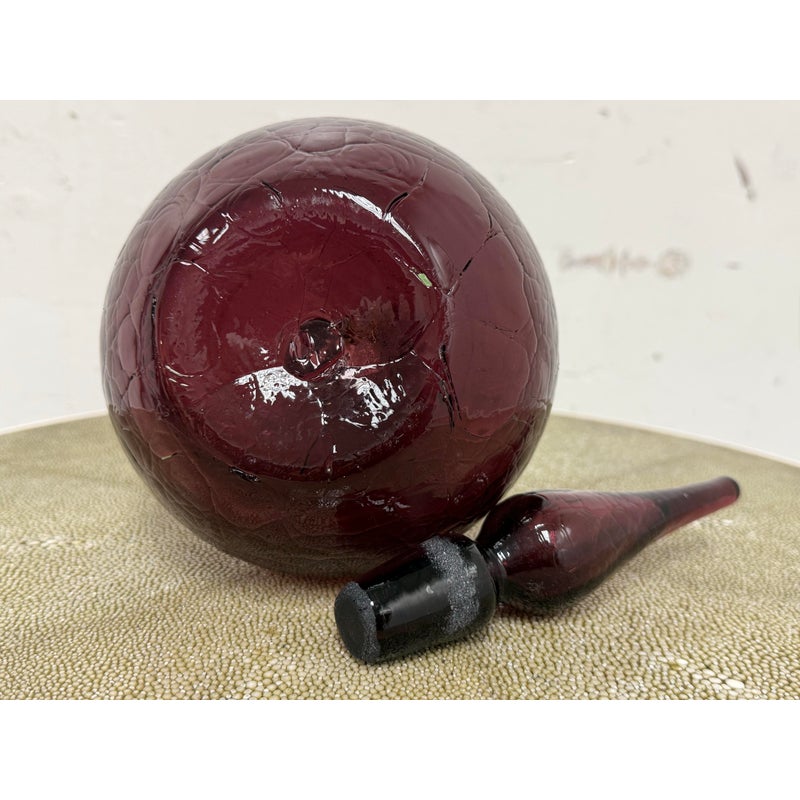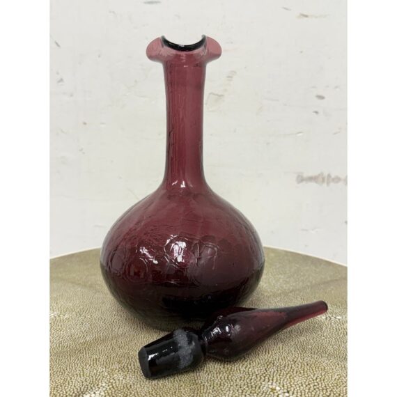 Design Plus Gallery presents a Plum Toned Hand Blown Vessel from Italy. The tall glass bottle has a textured body and a gracefully elongated silhouette. The unique hue of purple and sculptural stopper create visual depth and elegance, making it a striking accent for a console, shelf, or tabletop display. Condition is consistent with age and use.
