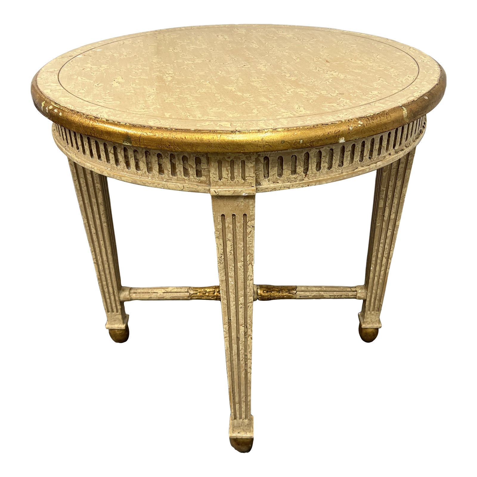 Design Plus Gallery presents a Round Distressed Cream Crackle Finish Occasional Table. Accented gold finish feet, center finial + on the edge of the round table top. The rest of the finish has an aged old world venetian effect, reminiscent to the canal of Venice. The table is in good condition with wear consistent with age + use.