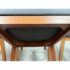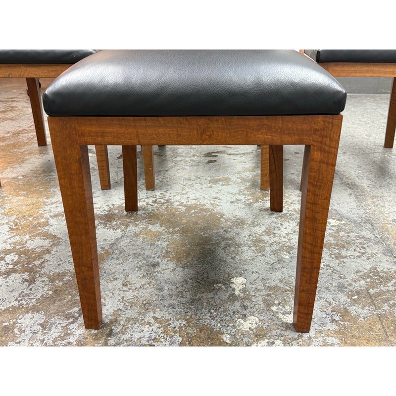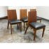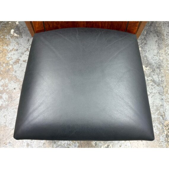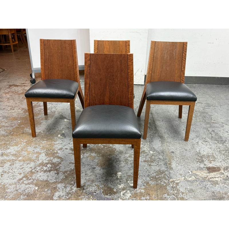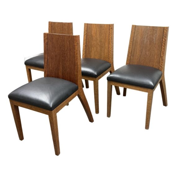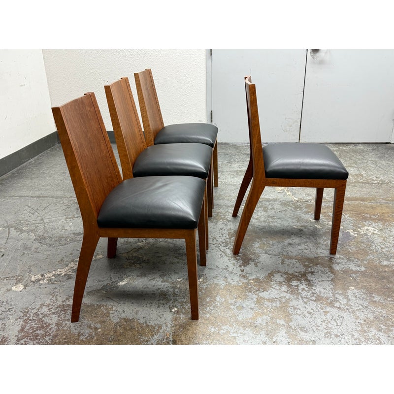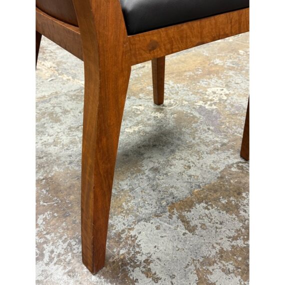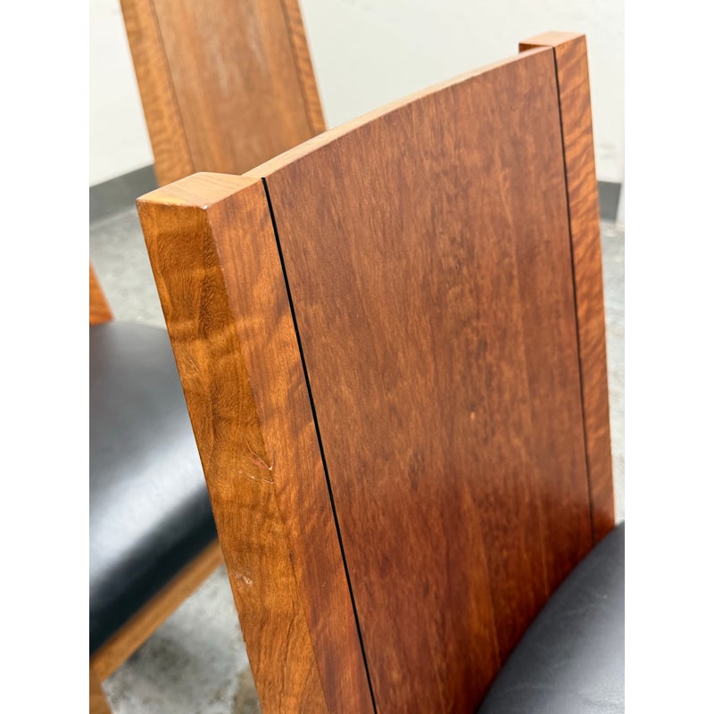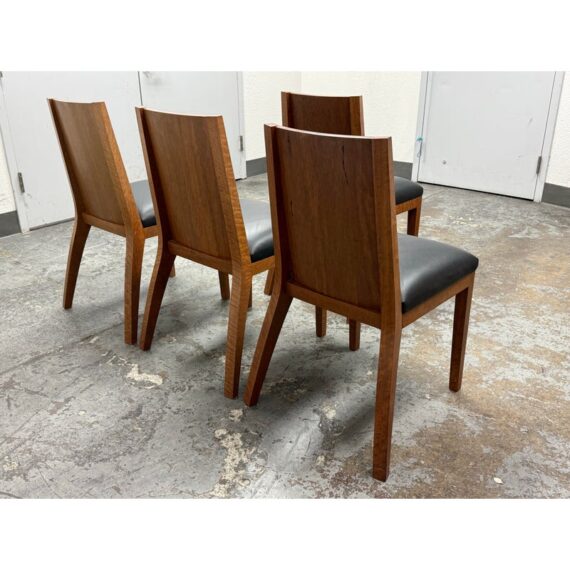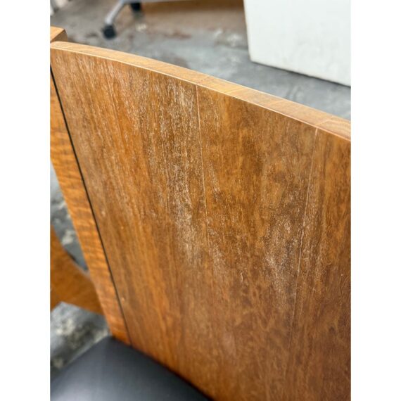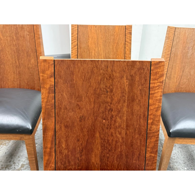 Design Plus Gallery presents a Setr of Four Italian Style Vintage Dining Chairs. They have a solid wood frame with Burl wood seat backs that are wonderful to the eye. the rich brown textured hue goes great with the black leather upholstered seat cushions. The chairs have an interesting saber shaped back legs. Three of the four are in good condition with one having some condition to the back that are consistent with age + use.