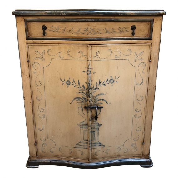 Design Plus Gallery presents a Italian Style Cabinet. The finish is a washed warm ivory, hand painted with a distressed steel blue accents. On the front of the cabinet is a painted urn with floral. Consist of one pull out drawer and two swing open doors. There is single shelf inside the cabinet. The hardware is a rustic iron to give an old world charm.