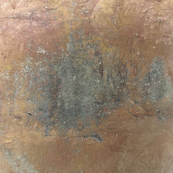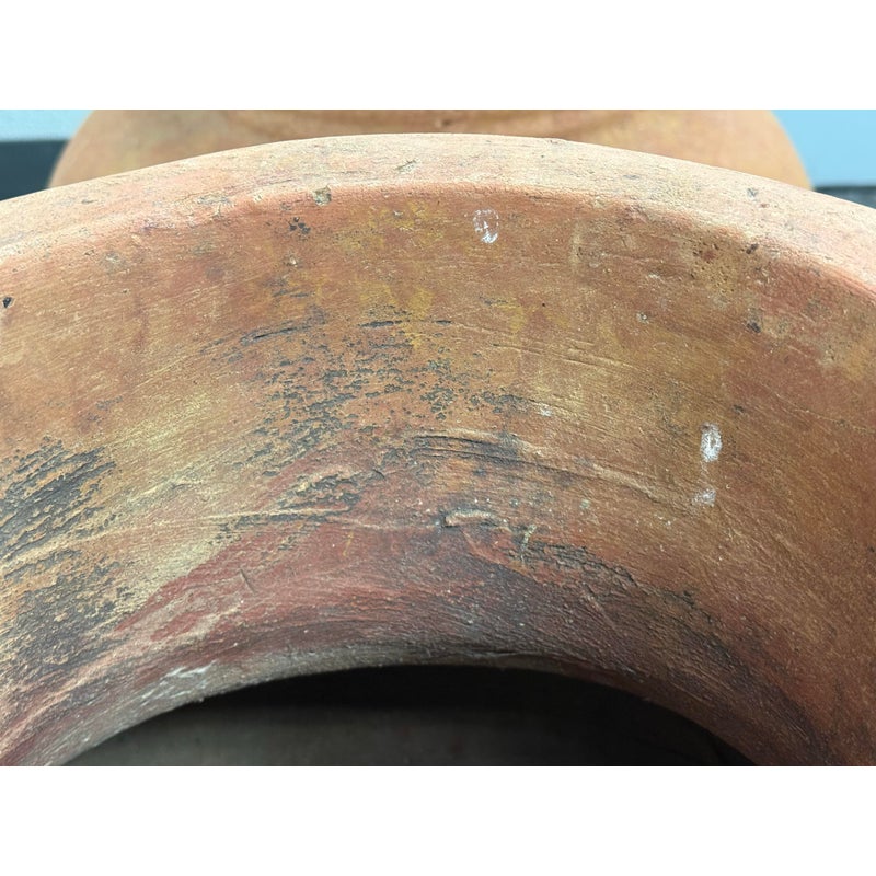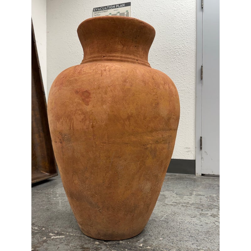 Design Plus Gallery presents an Italian Terracotta Outdoor Pot. This vessel has a classic amphora inspired profile with a wide rolled rim, tapered neck, and rounded body rendered in natural terracotta. The surface shows tonal variation, weathered character, and hand finished texture that emphasize its old-world style. Its sculptural form and earthy coloration give it a rustic Mediterranean presence. It is in good condition with visible and minimal wear from usage.