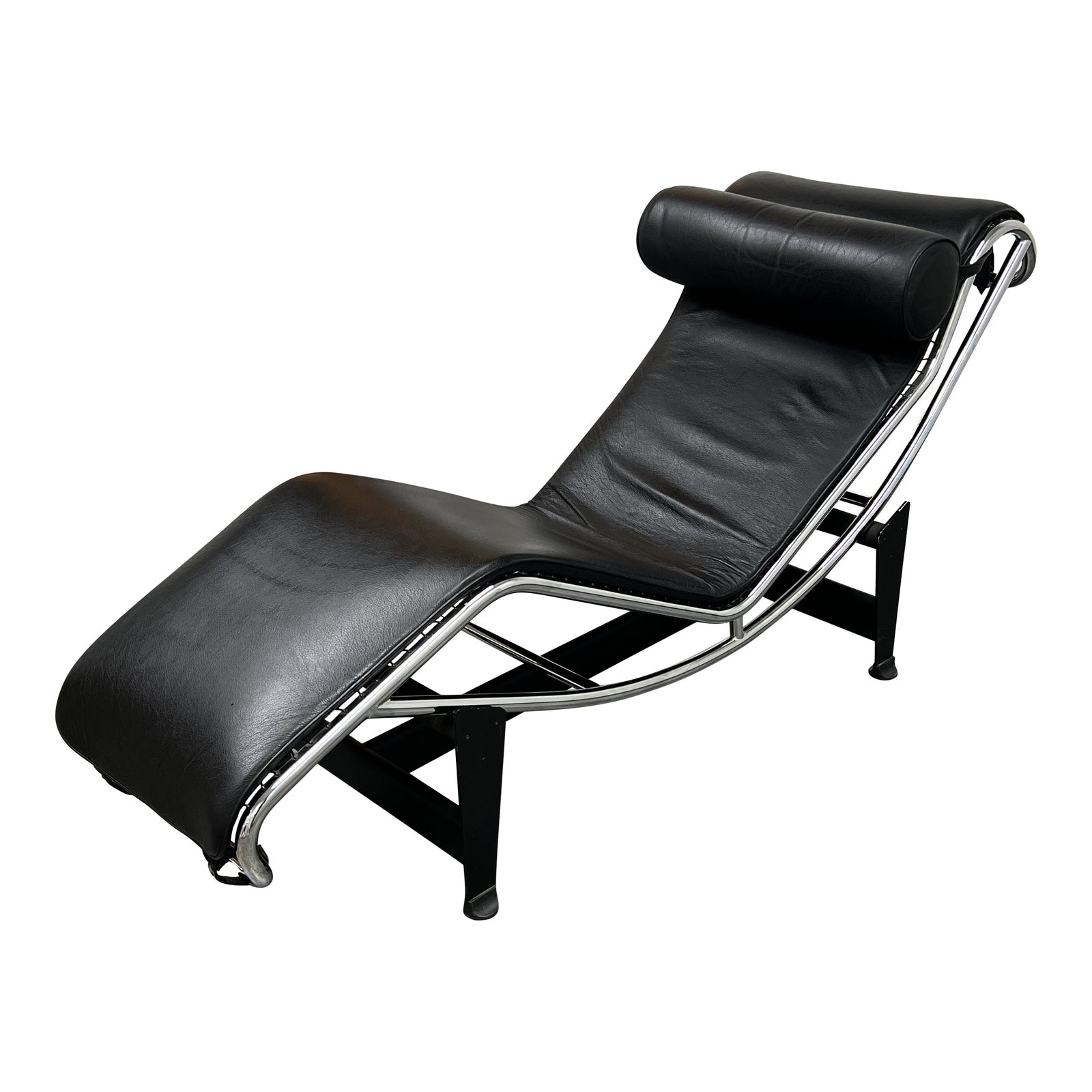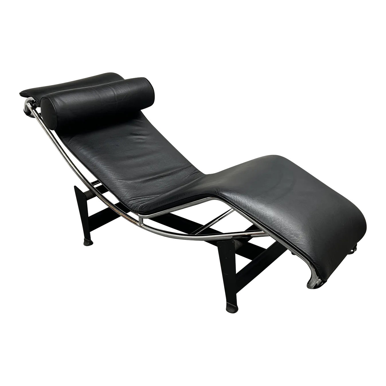 Design Plus Gallery presents an Italydeisgn Le Courbusier Chaise. A reproduction of original iconic LC4 Lounge Chaise designed by Le Corbusier. Its sleek lines, polished chrome and black bonded leather upholstery make a statement in any room, while offering a full range of reclining positions for you to enjoy. Base frame solid steel with powdercoat, body frame polished chrome steel frame resists chips & rust. Seat platform reinforced bottom elastic supporting strap network. Foam type multi-density dacron wrapped foam provides comfort & cushion memory. Seat cushion style removable lounge cushions features rear zipper. Comes with a bolster headrest. Visible wear with age and usage.