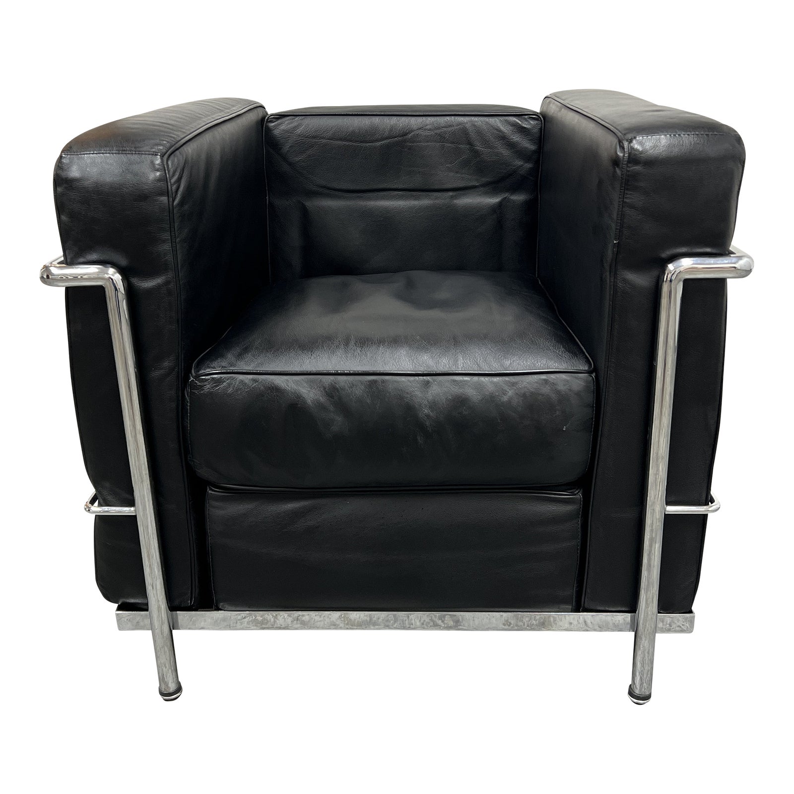 Design Plus Gallery presents a Italydesign Le Courbusier Style Armchair. Originally produced in 1929, this classic epitome of modernism has floated beautifully in home offices and living rooms for decades. This reproduction is made with a black bonded leather and has the classic polished chrome frame. There is minor wear through out, chair is in good condition.