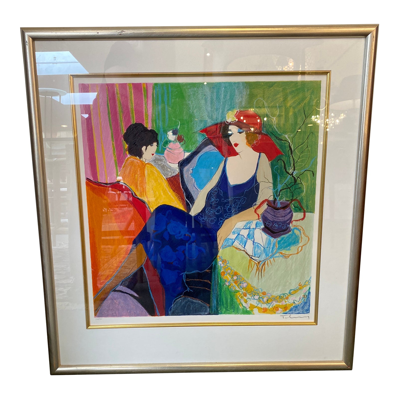 Design Plus Gallery presents an untitled limited edition print by Itzchak Tarkey. Artist’s signature is located in the bottom right. Limited Edition 226/250. A beautiful tableau that features a pair of lovelies enjoying a moment at their round tables. Signed lower right by artist. Minor wear, art piece is in good condition. Ready for hanging in your space with picture wire on the back.