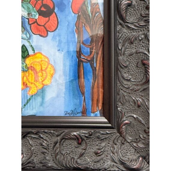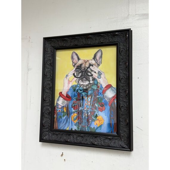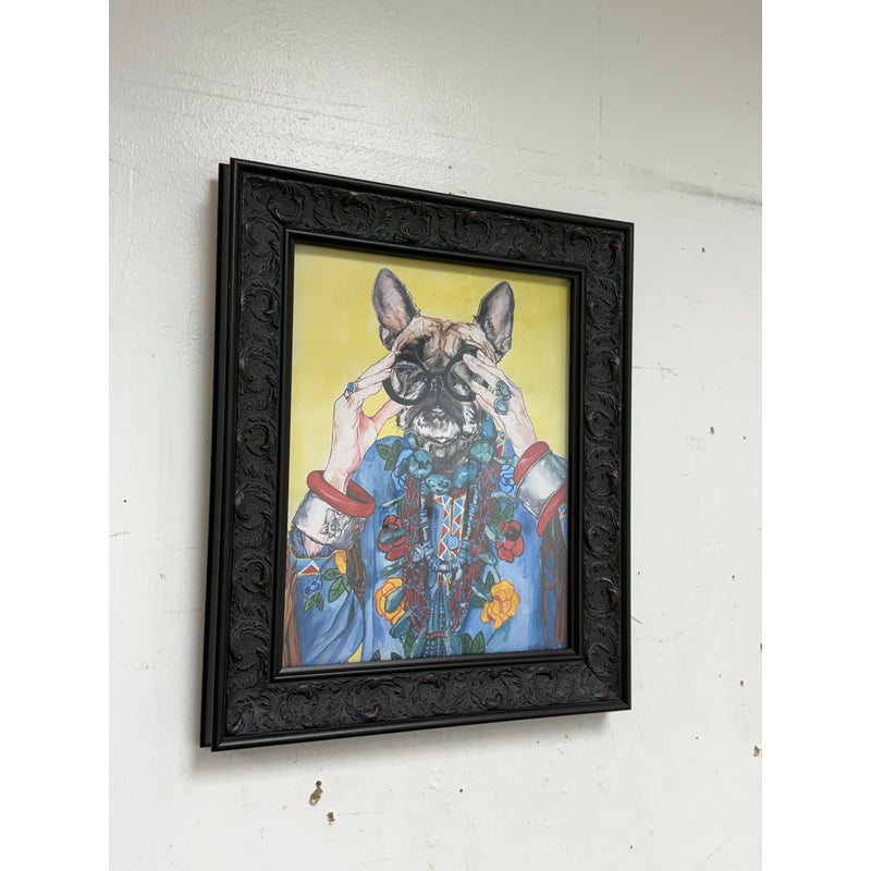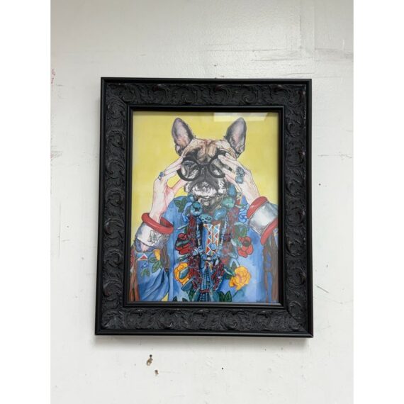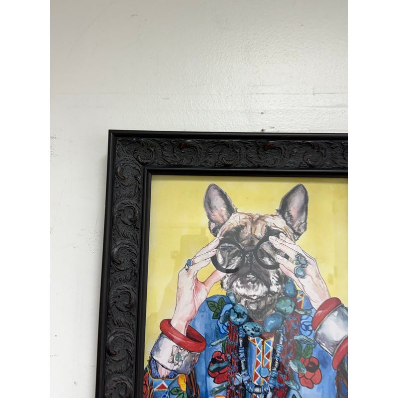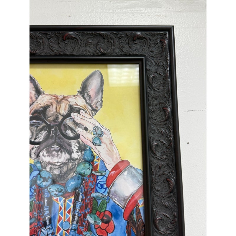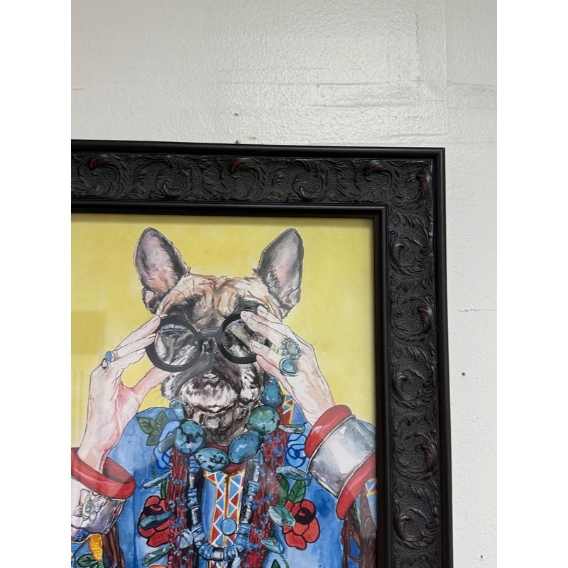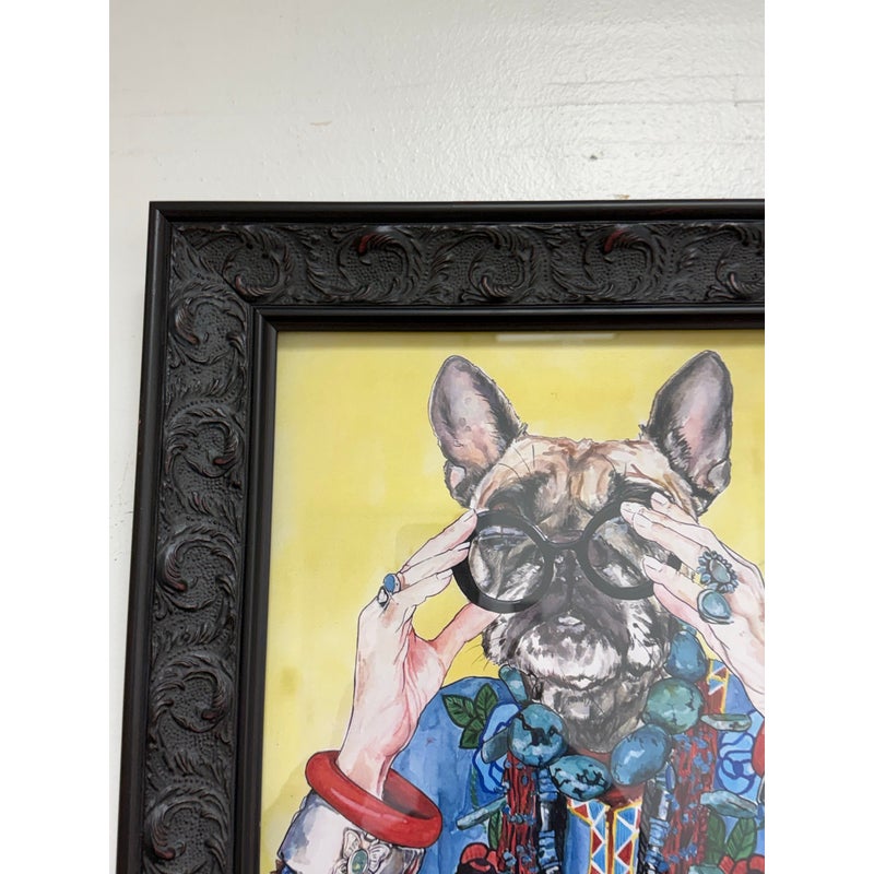 Design Plus Gallery presents “Iris Apfel as a Bulldog”, a Pop Art Giclee Print by Ivy McConnell. What a fun portrait of a true fashionista that never aged out of the fashion world and only got stronger and more in demand as her years carried on. The use as a frenchie bullie is such a great replacement with the wrinkled but remarkably youthful face that always seem to have. It is framed in a thick + carved black frame. It is in good condition for its usage.