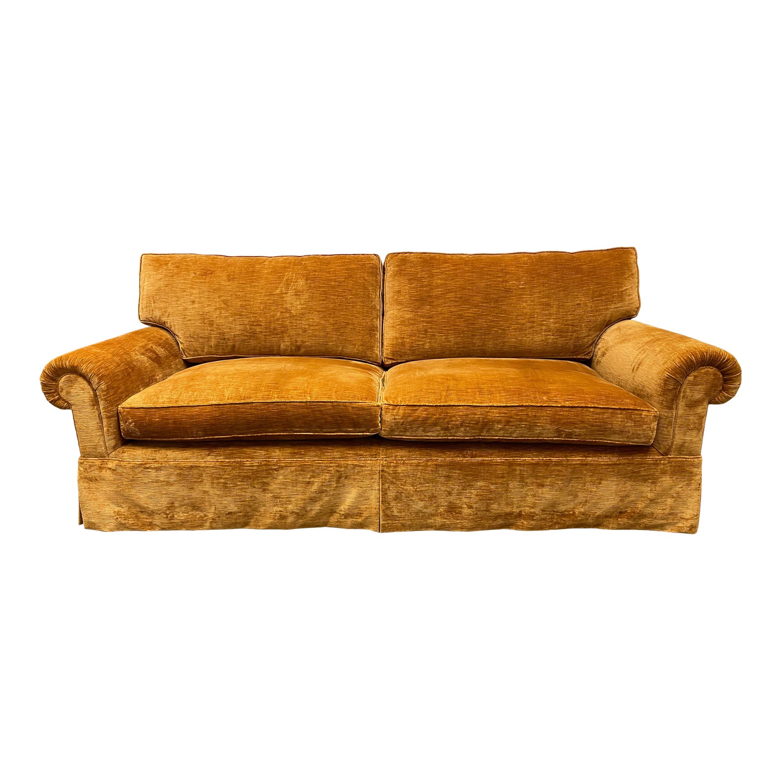 J.F. Fitzgerald Furniture Co. Custom Designed Orange/Amber Velvet Rolled Arm Sofa. Original Price: $8,000