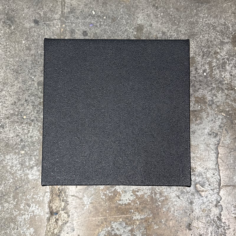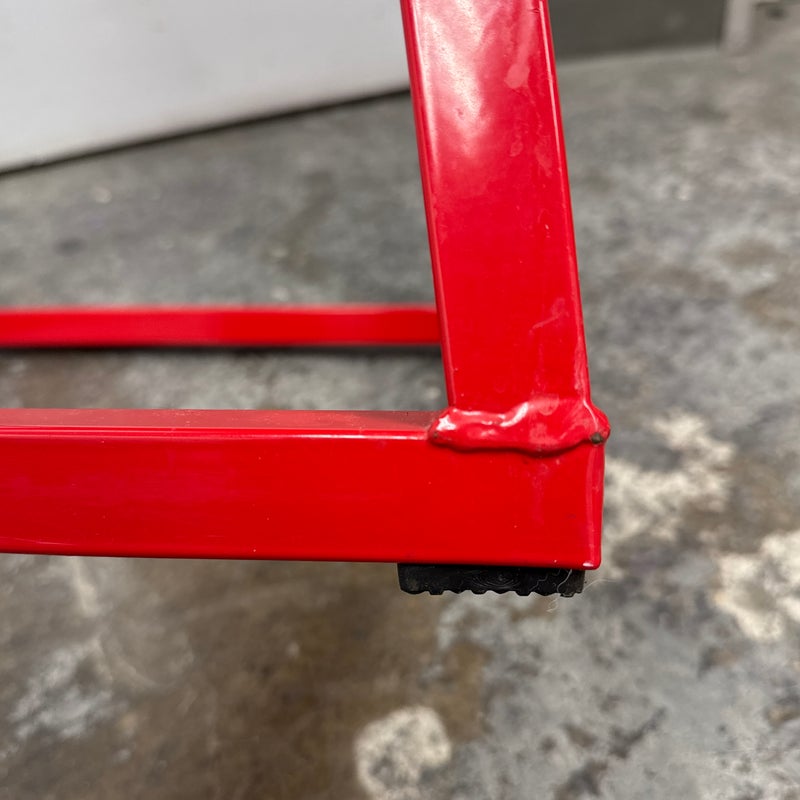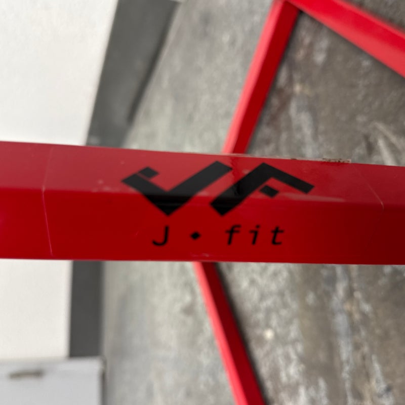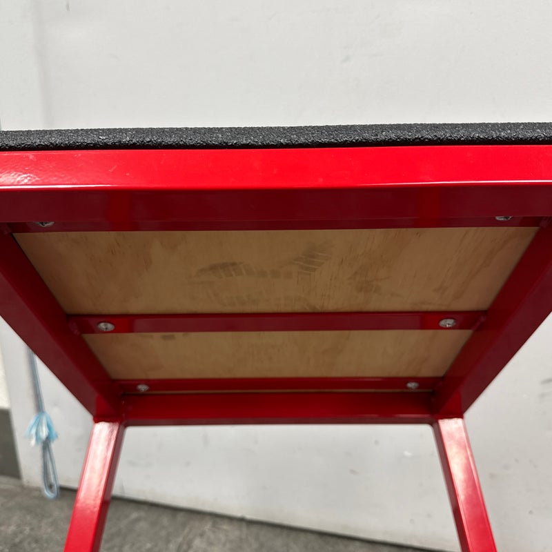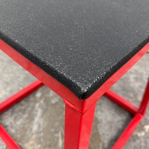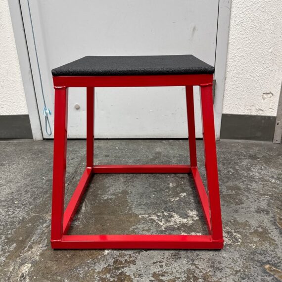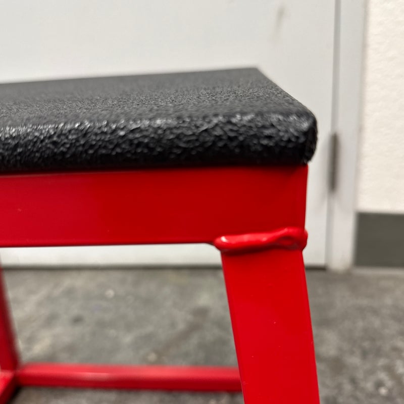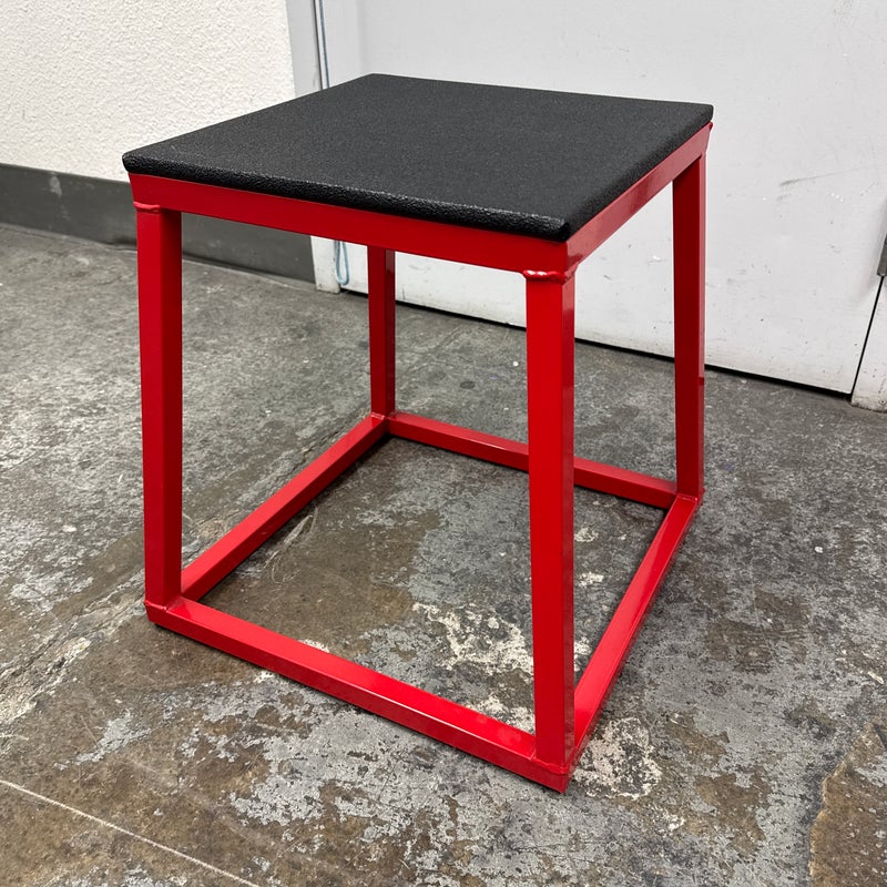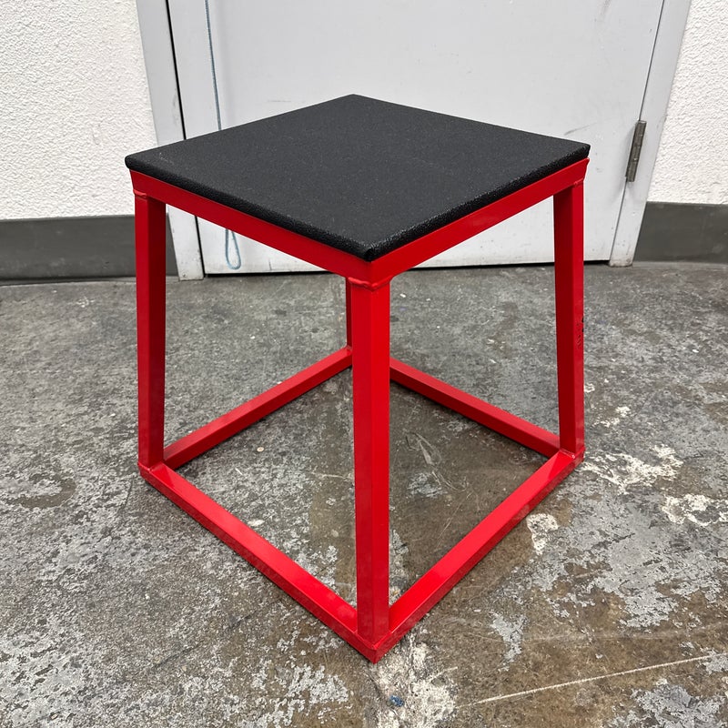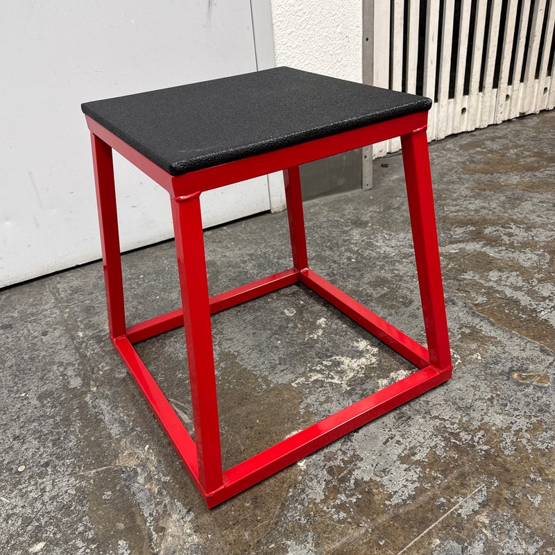 Design Plus Gallery presents a Plyometric Box from J/Fit. A piece of fitness equipment designed for jump training and other exercises. It features a heavy-duty steel frame, a red powder-coated finish, and a non-slip black vinyl landing surface. In good condition, visible and minimal wear from usage.