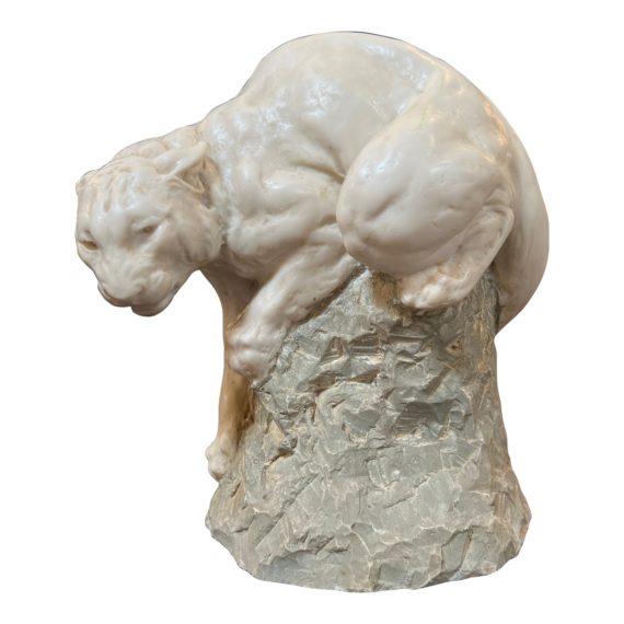Design Plus Gallery presents an Alabaster Puma/Mountain Lion Figure Sitting on a Rock/Stone by J. L. Boulton, a Well known American sculptor. It is a heavy piece, on its own just over 10 lbs. Very well know stature in good condition, with signature on the sign very present.