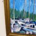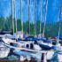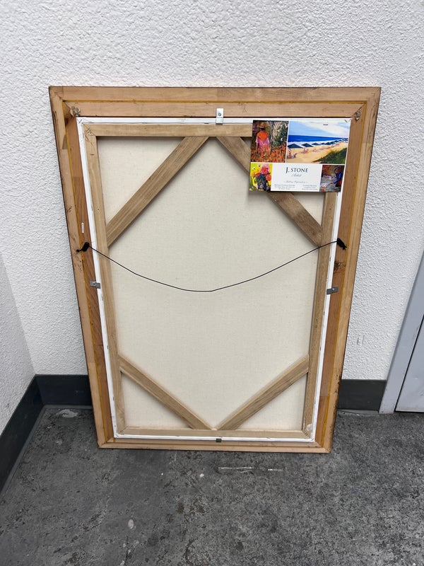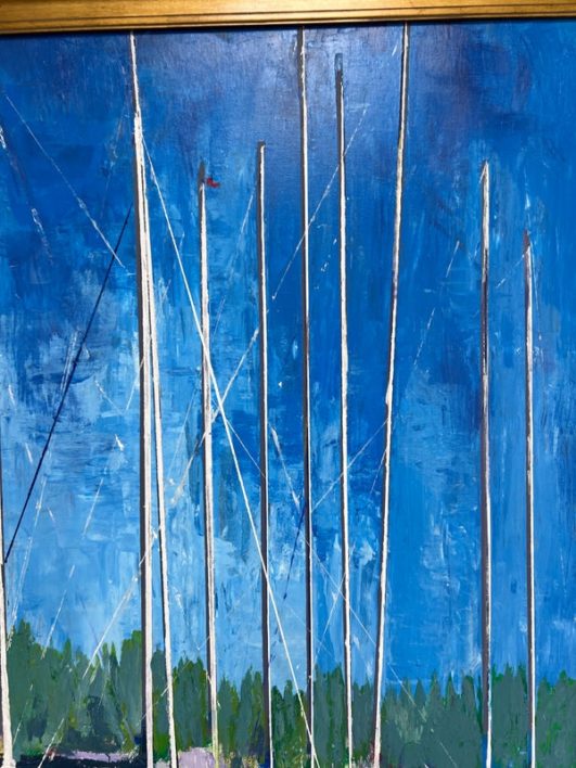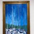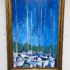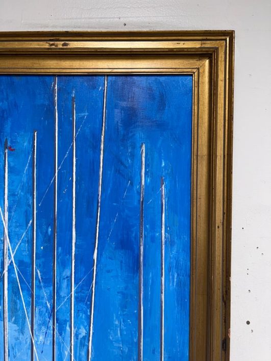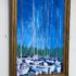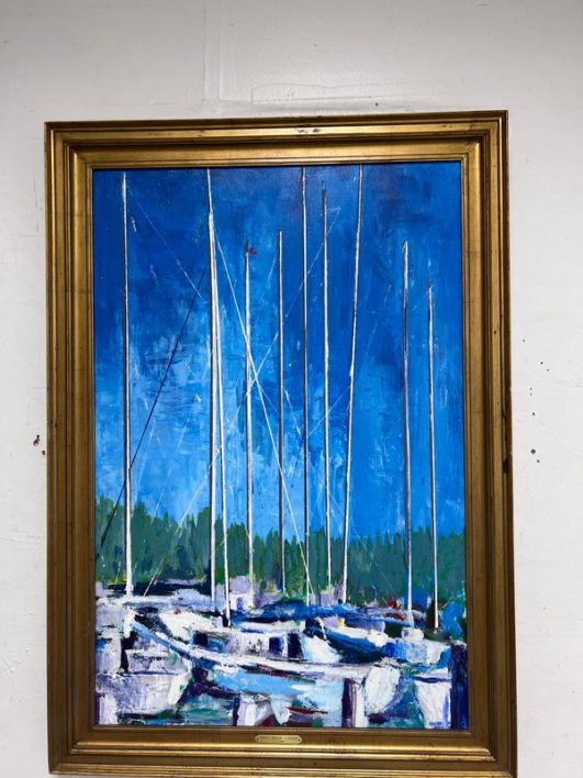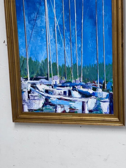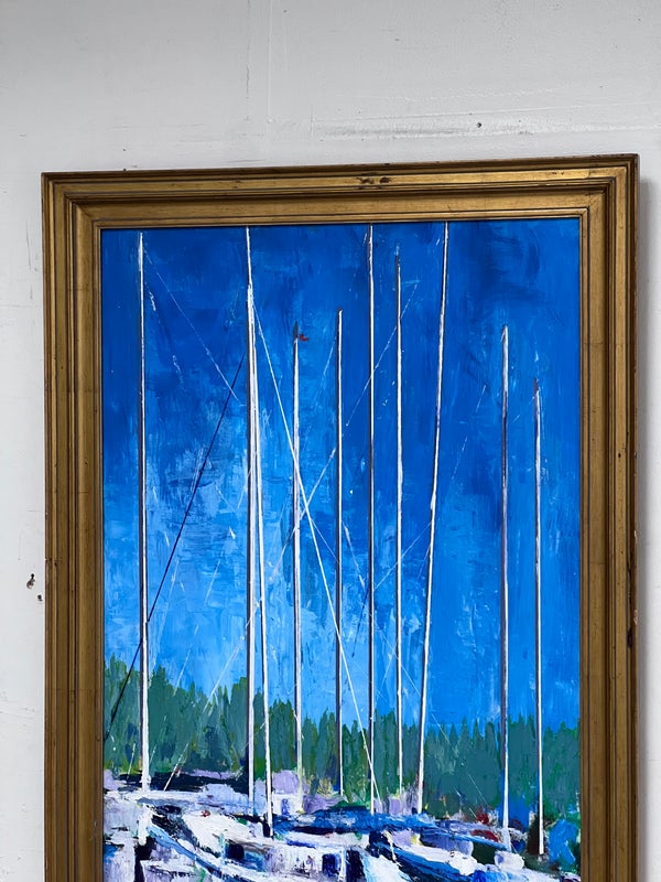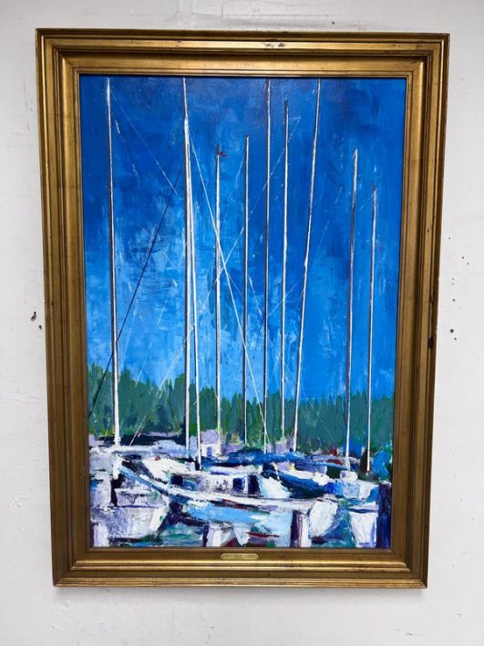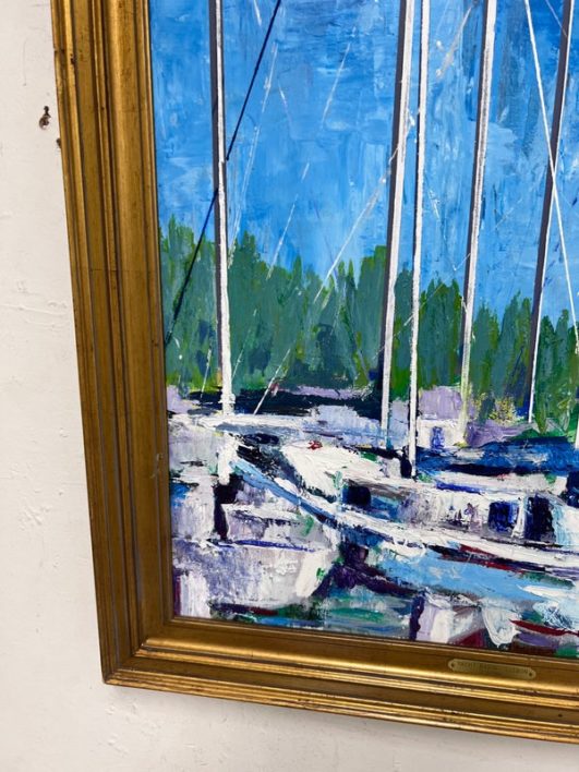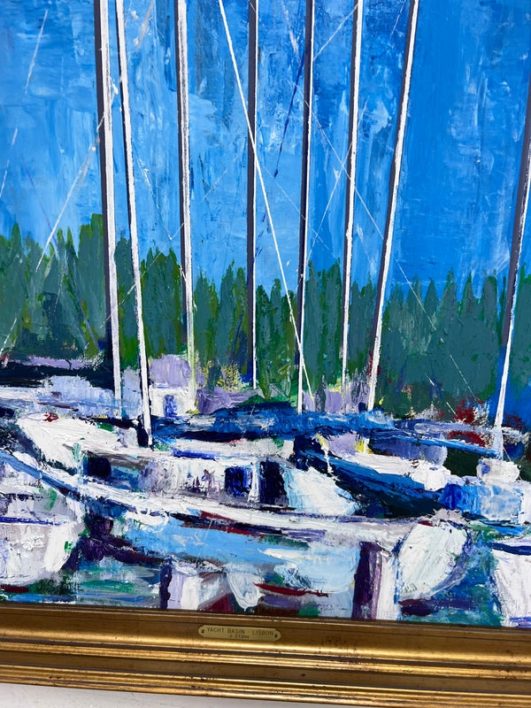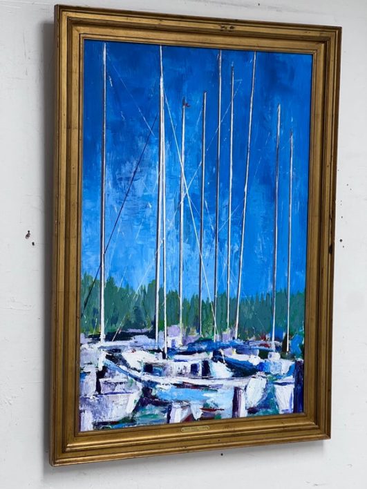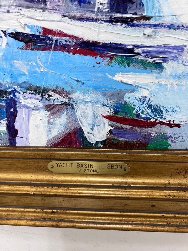 Design Plus Gallery presents the Yacht Basin-Lisbon by J.Stone. Appears to be an Original Painting from the mid-20th century. Vivid background of bright to deep blues, greenery below and then a mass of sailboats near the dock. In good condition, visible signs of wear to the frame from usage + age.