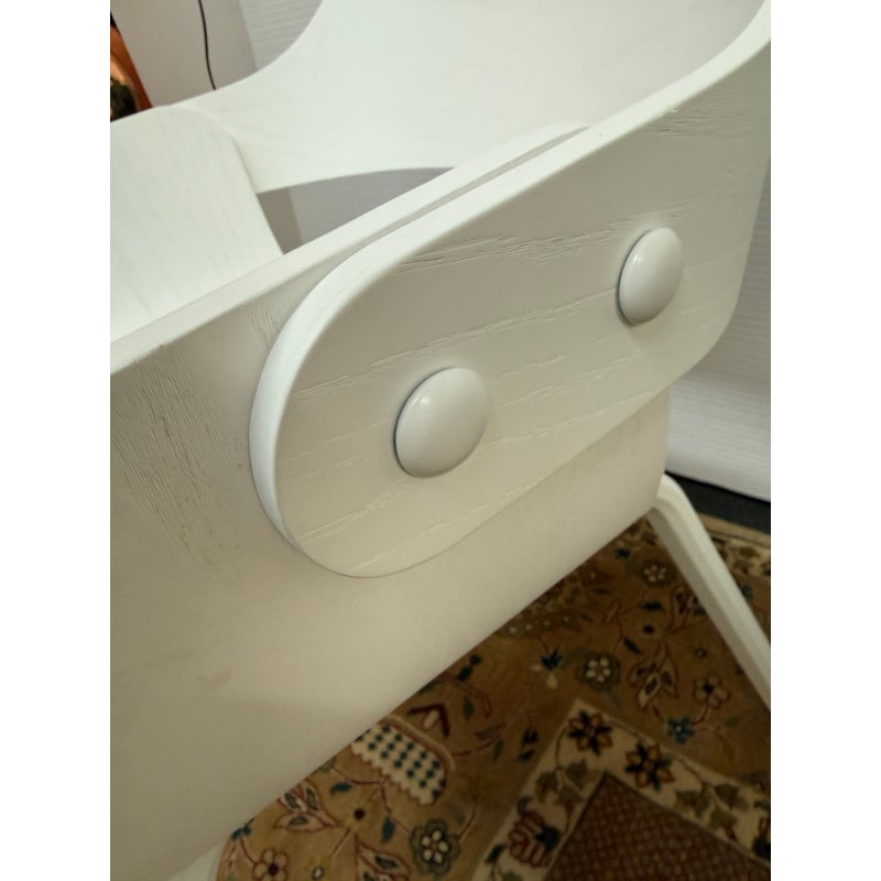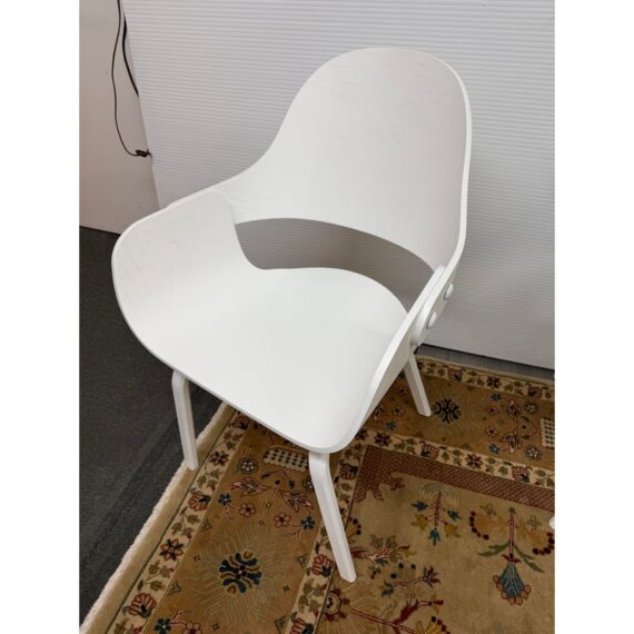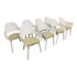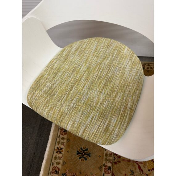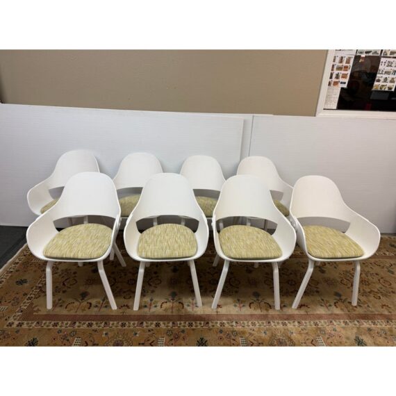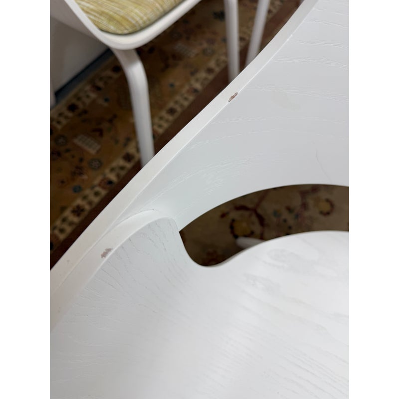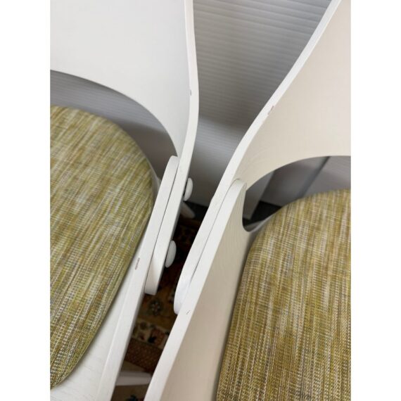 Design Plus Gallery presents a Set of Eight Showtime Nude Chairs by Jaime Hayon for BD Barcelona Design. The chairs are a minimalists delight with a painted white ash wood in a sleek design. The seat back is complex with its ergonomic functionality and airy feel with its reimagined profile. The chairs come with a removable seat cushion, made for size, in a light springy green tweed. The chairs show ever so slight chips to the paint finish but are overall in good condition for their usage. Made in Spain.