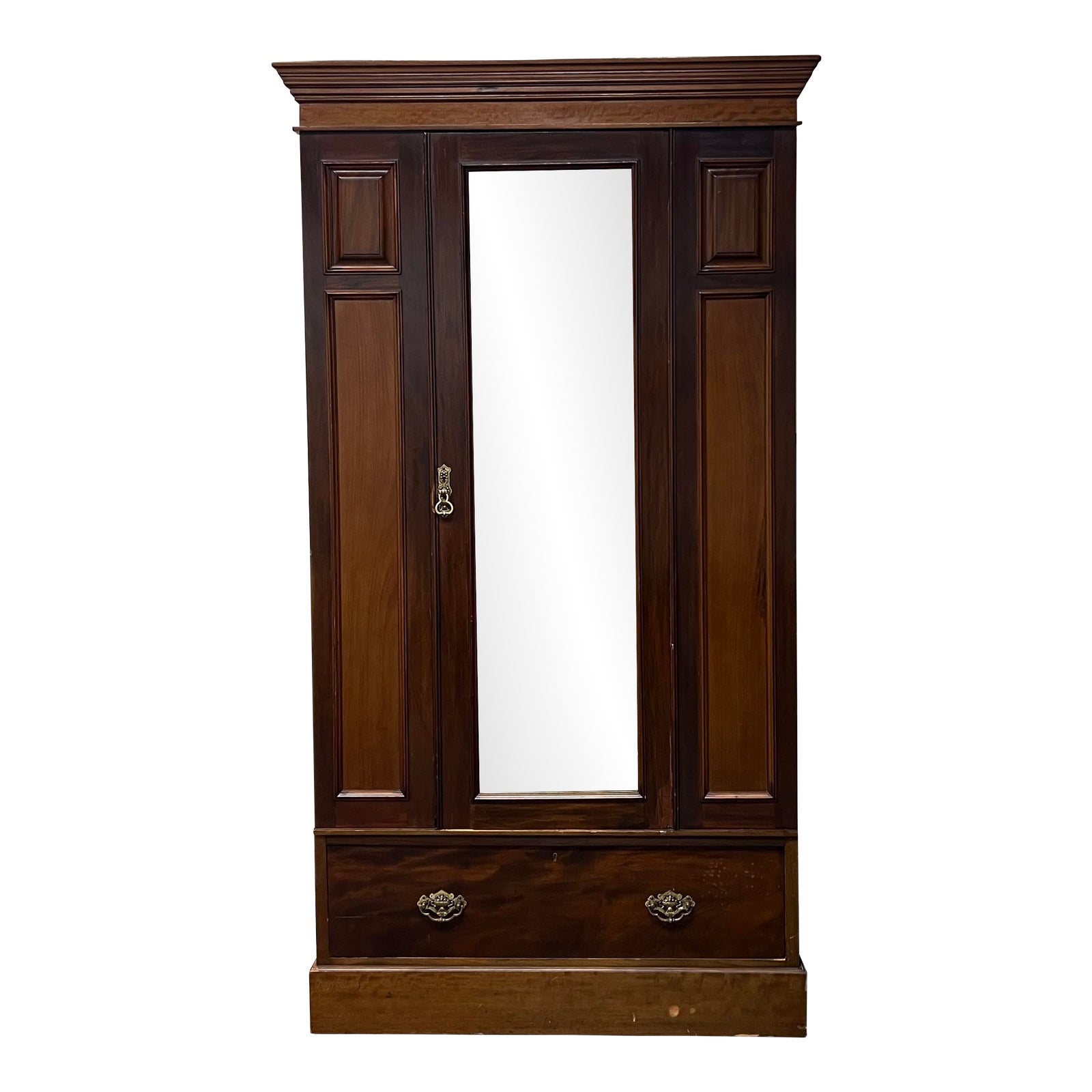 Design Plus Gallery presents an Antique James Shoolbred Armoire. Wood frame is stained a rich Burgundy with Queen Anne inspired oiled brass accents. Base is anchored by a generous drawer. Door is mirrored with panels on the sides. Interior is complete with a brass clothing rod and hooks for hanging. Visible wear through out, armoire is in good condition.